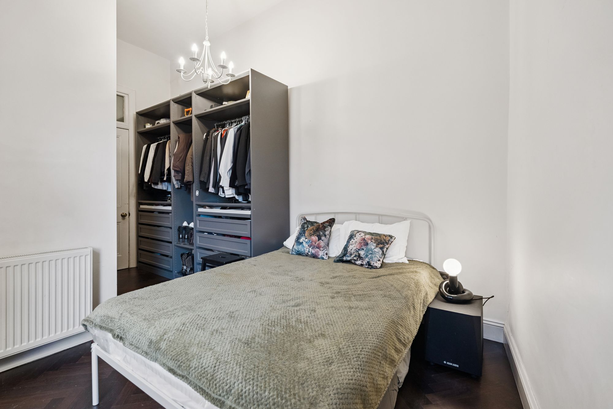 There are two generous double bedrooms, both beautifully finished with high ceilings, detailed cornice work, and matching herringbone flooring. The first bedroom includes built-in storage and a freestanding bath, offering a touch of luxury. The second bedroom benefits from fitted wardrobes and a sleek en-suite shower room, making it ideal as either a principal bedroom or a versatile guest room/home office. In addition, a useful box room provides an excellent option for a study, snug, or extra storage.