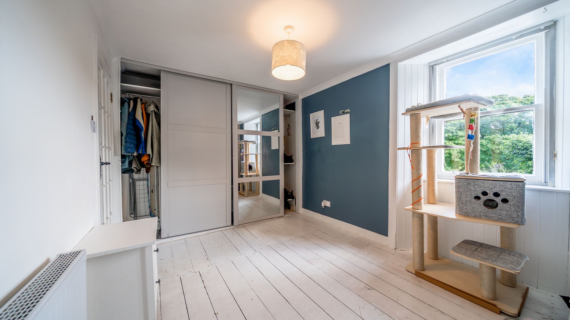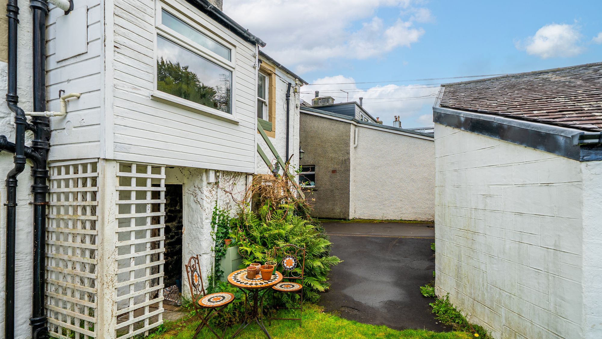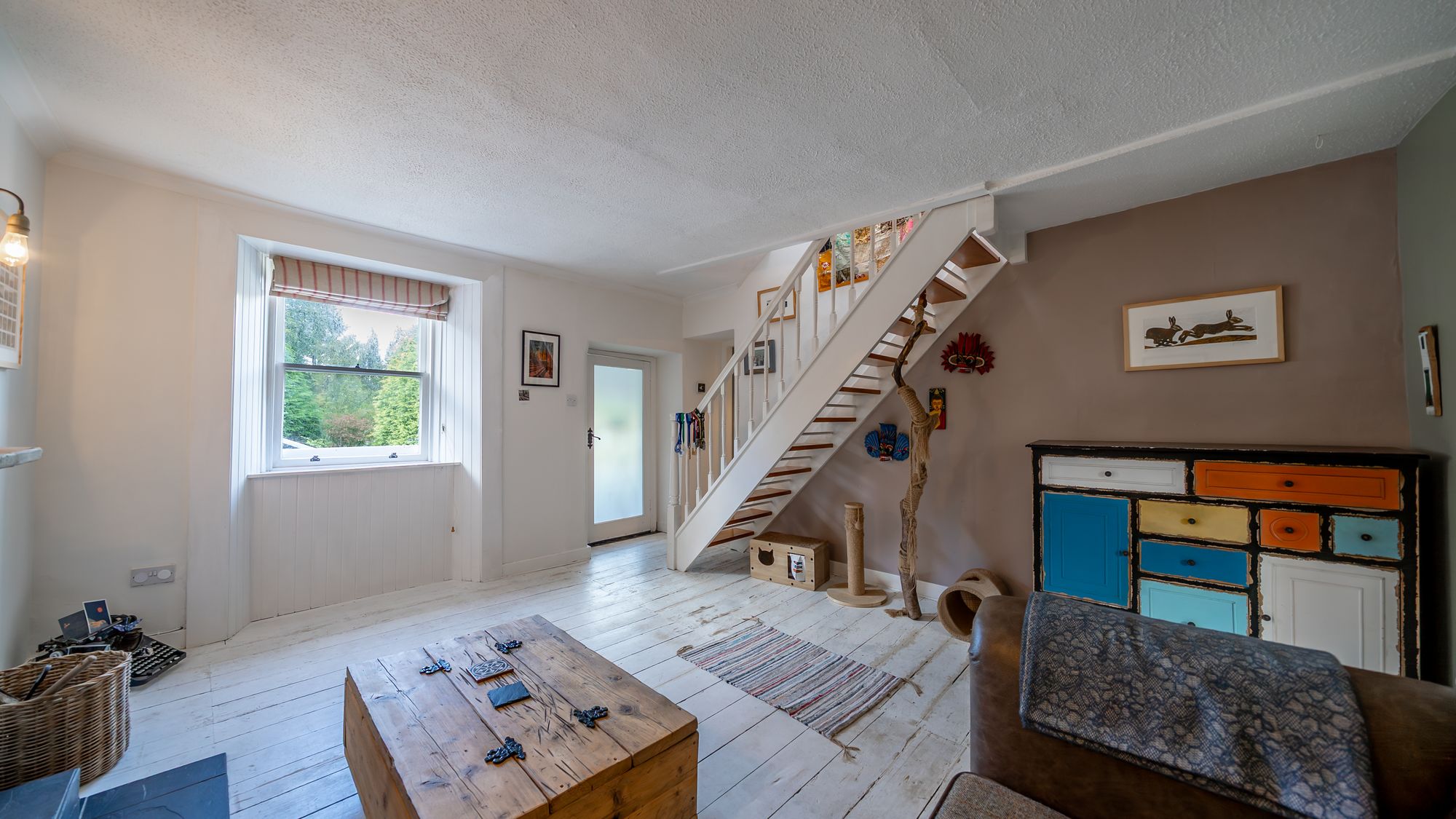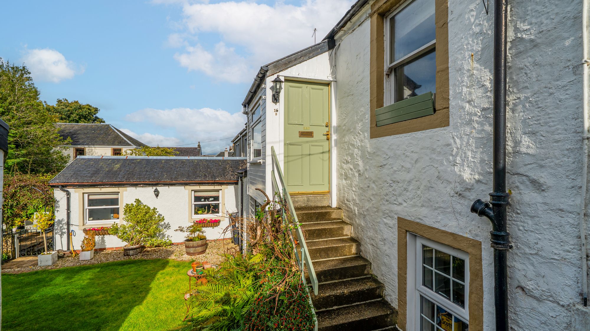 Upon entering the ground floor from a highly practical entrance porch, you are greeted by a cosy living room that exudes a rustic feel with striking views captured over the seemingly never ending garden and featuring a stunning solid fuel burner at its focal point. The generously sized kitchen is fully equipped with all necessary appliances and hosts a comprehensive range of base and wall mounted units along with ample space for family dining. The ground floor also hosts a well-presented double bedroom with built-in storage and a striking traditional bathroom featuring a white three-piece suite incorporating a convenient shower bath combo. Ascending to the upper floor, you will find two further good-sized double bedrooms, providing plenty of space for family living or guest accommodation. Externally, the property boasts significant garden grounds that are stunningly presented and ideal for al fresco entertaining. The property enjoys an excellent school catchment area and is well-connected with bus transport links to the greater Glasgow area. A host of local amenities such as shops, restaurants, bars, and cafes are within easy reach, while leisurely walks invite you to explore the picturesque surroundings.