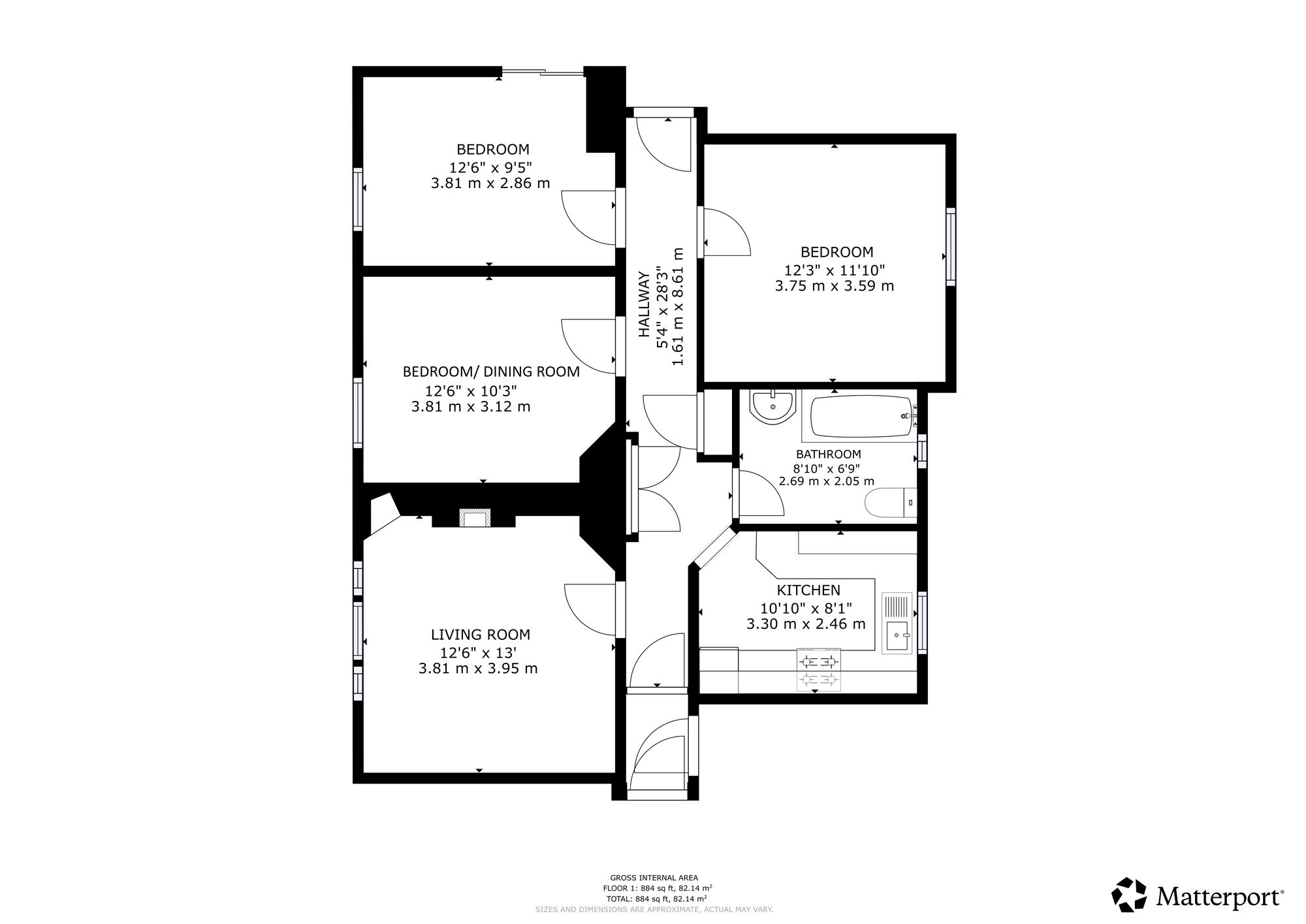 Internally, the flat comprises an entrance vestibule leading into a central hallway, providing access to all rooms. The lounge is a comfortable and spacious living area, while the kitchen is functional and well-suited for everyday use. There are three bedrooms, offering flexible space for sleeping, working, or additional storage, along with a family bathroom completing the internal layout.