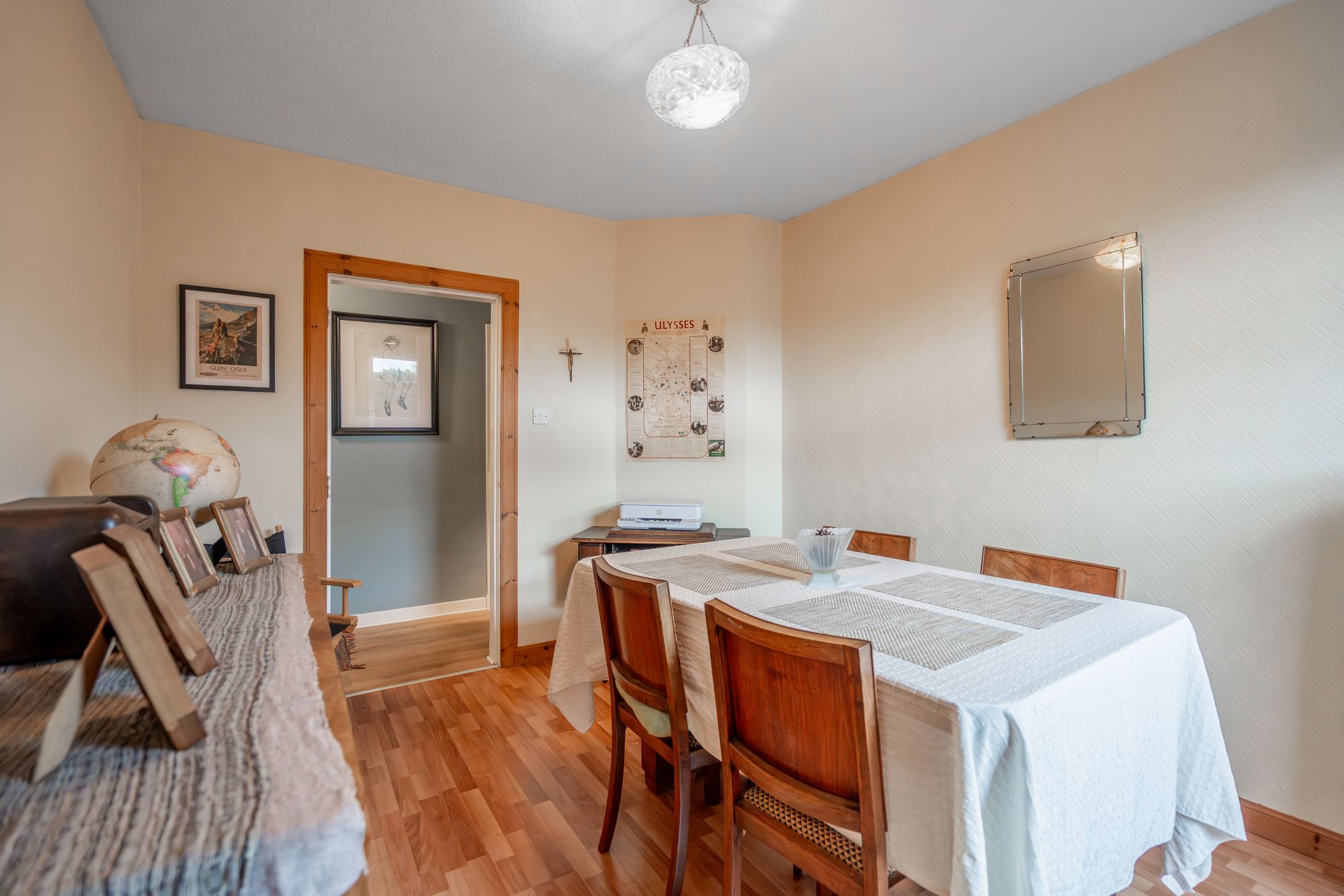 The property enjoys an open outlook to a green space, creating a pleasant sense of openness to the front. Externally, there is private garden ground to the front and side, offering scope for outdoor seating or landscaping. There is also potential to create off-street parking, subject to any necessary permissions. To the rear, a shared drying green is complemented by two external stores belonging to the property, providing additional practical storage. The grounds are enclosed by a combination of mature hedging and wrought iron fencing, enhancing privacy and security.