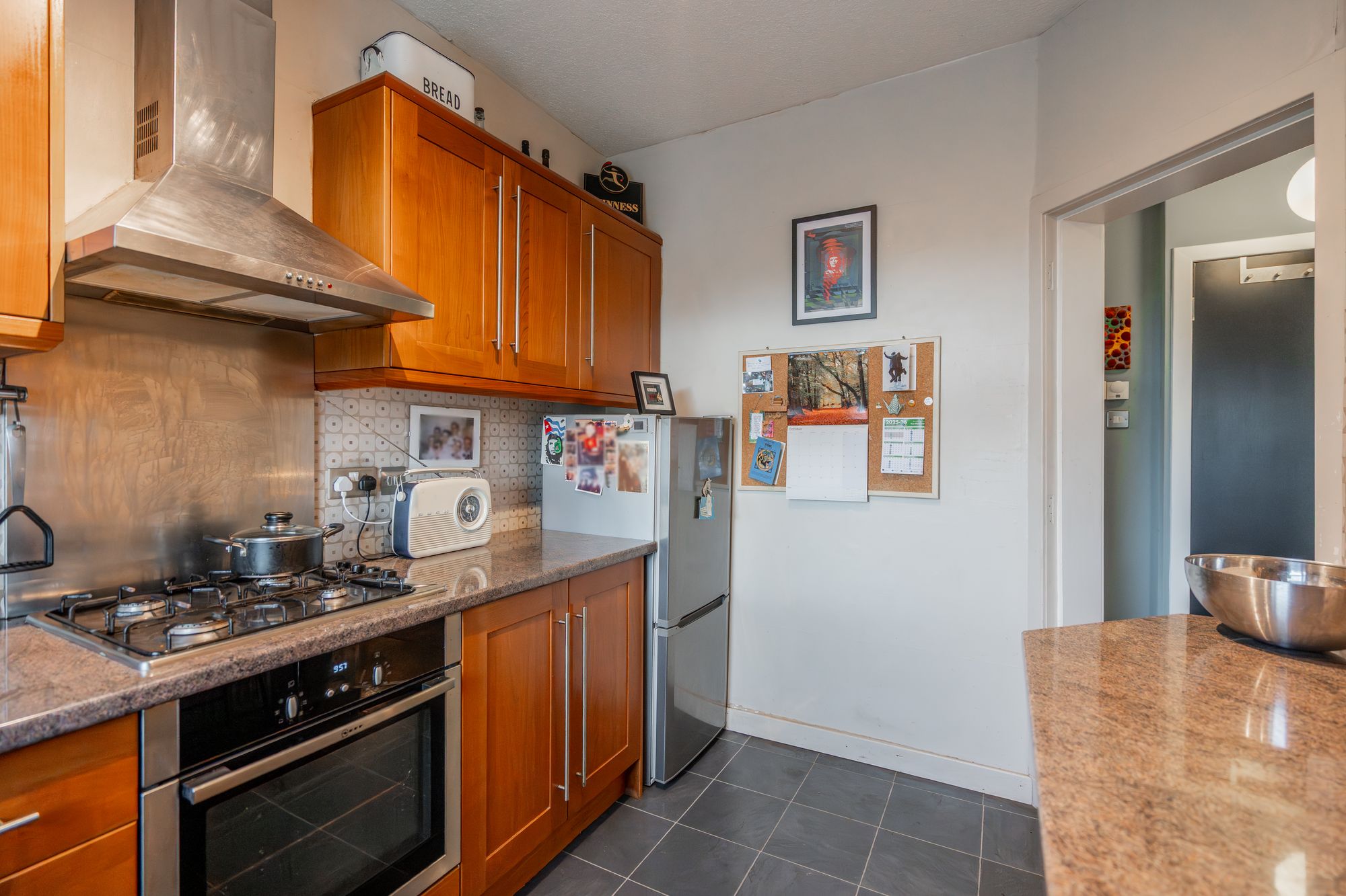 The property enjoys an open outlook to a green space, creating a pleasant sense of openness to the front. Externally, there is private garden ground to the front and side, offering scope for outdoor seating or landscaping. There is also potential to create off-street parking, subject to any necessary permissions. To the rear, a shared drying green is complemented by two external stores belonging to the property, providing additional practical storage. The grounds are enclosed by a combination of mature hedging and wrought iron fencing, enhancing privacy and security.