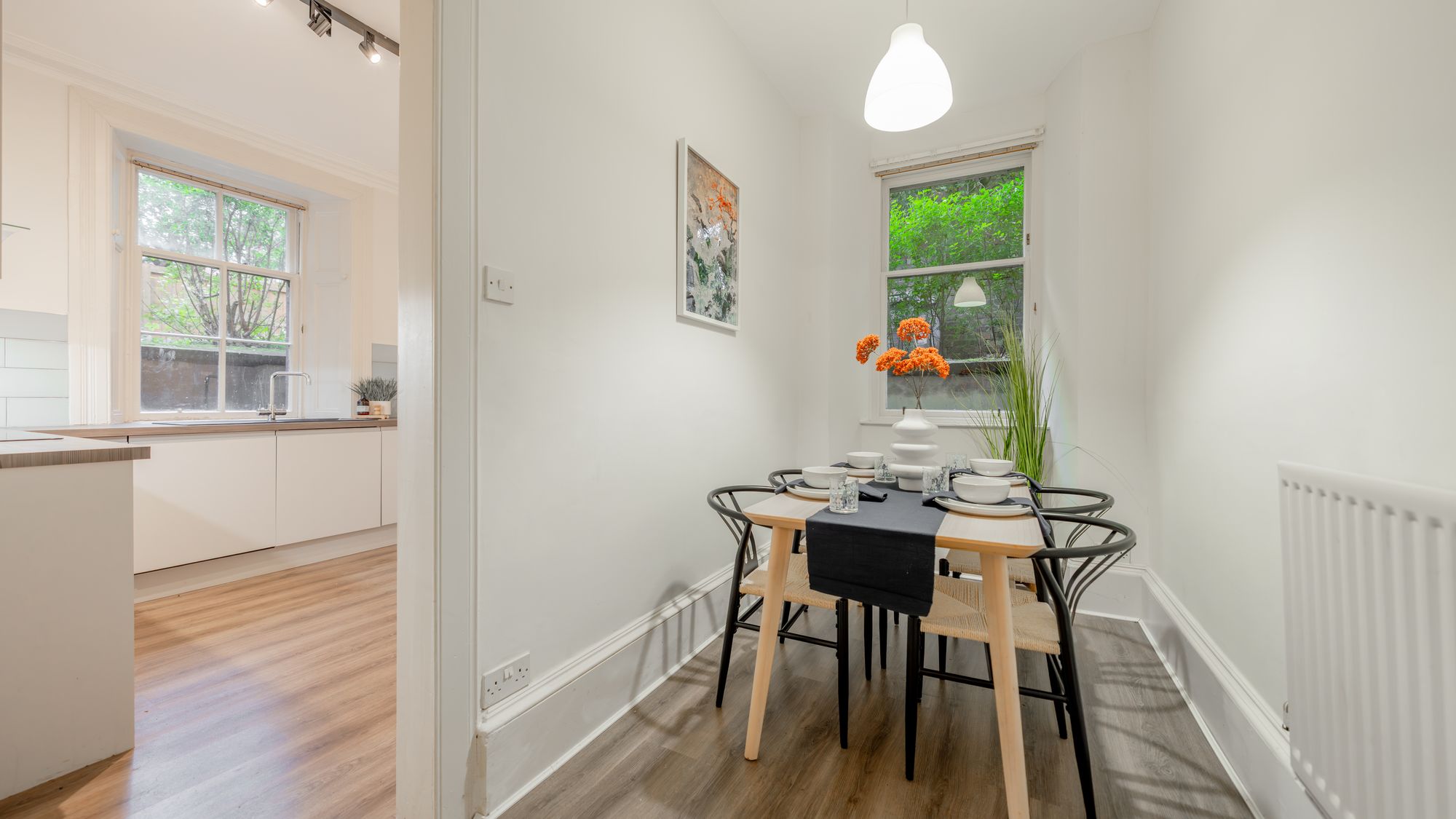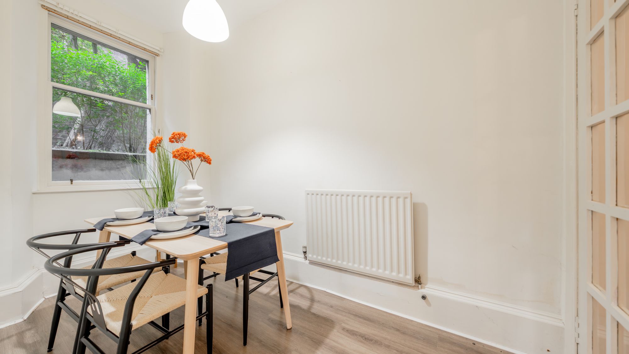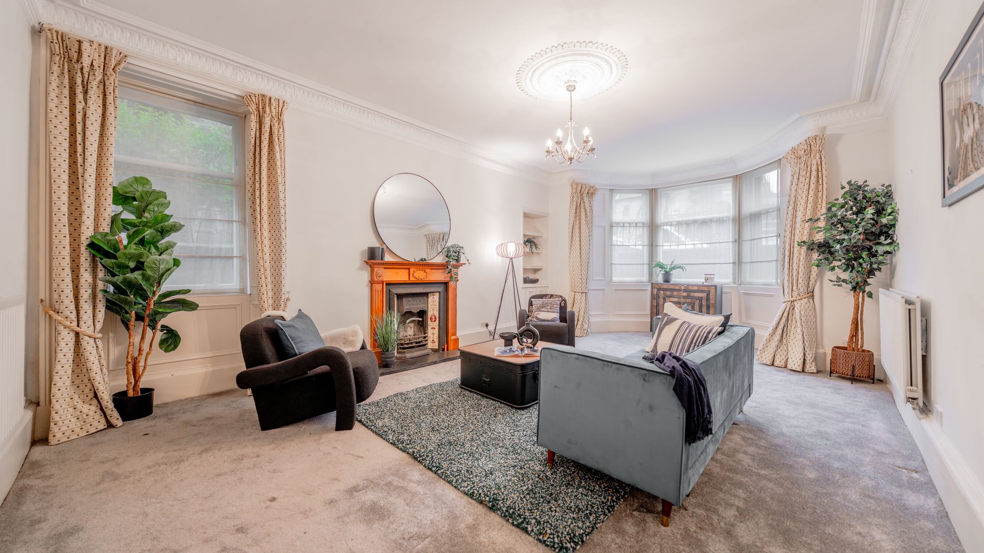 Set on the garden level of a handsome period building, this spacious and bright property seamlessly blends traditional charm with contemporary style. The accommodation is all on one level and extends to a generous layout comprising: a welcoming reception hallway with storage cupboard, an impressive bay-windowed lounge enjoying dual aspect natural light, and a newly fitted modern dining kitchen complete with an excellent range of wall and base units, integrated appliances, and ample space for entertaining.