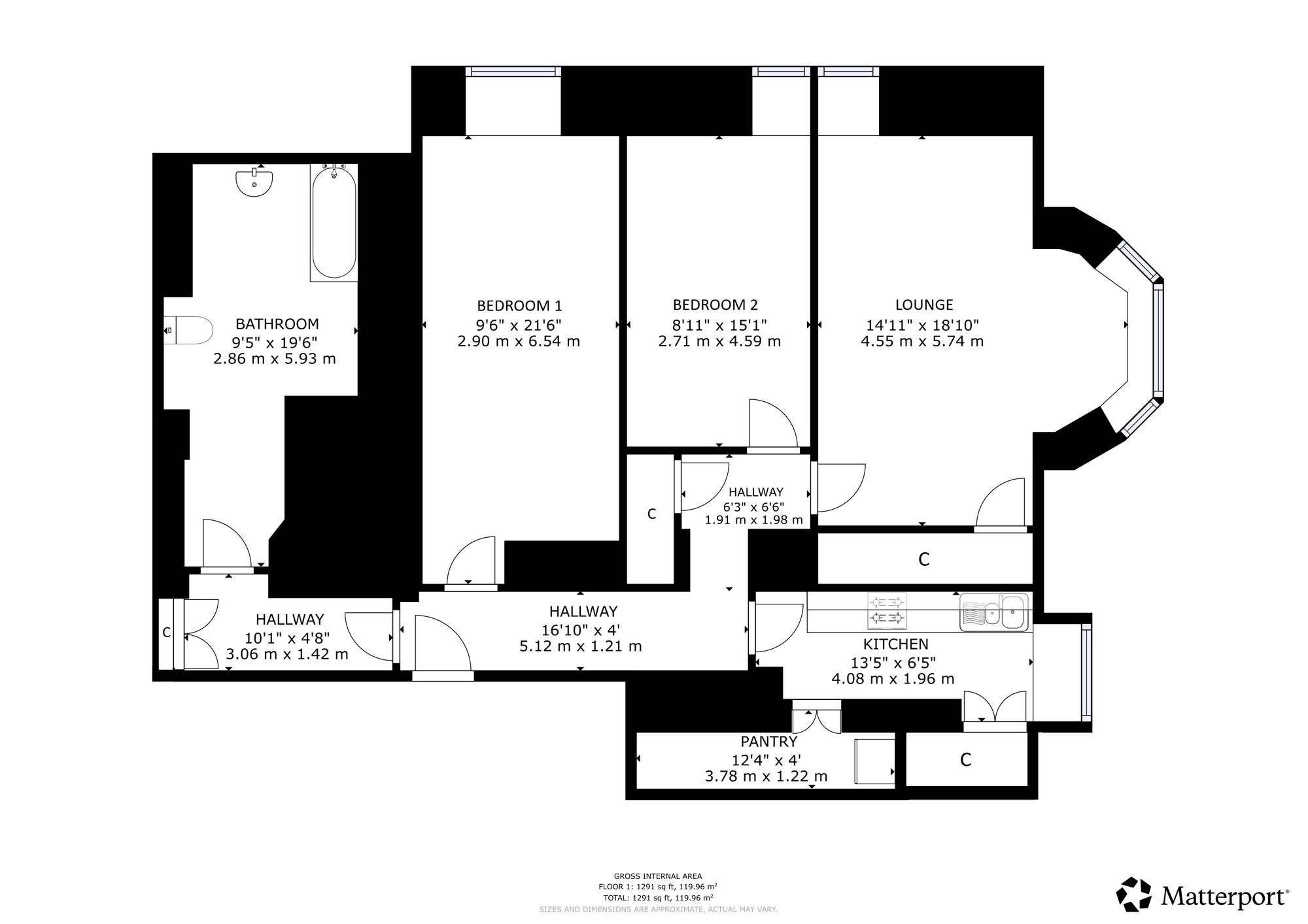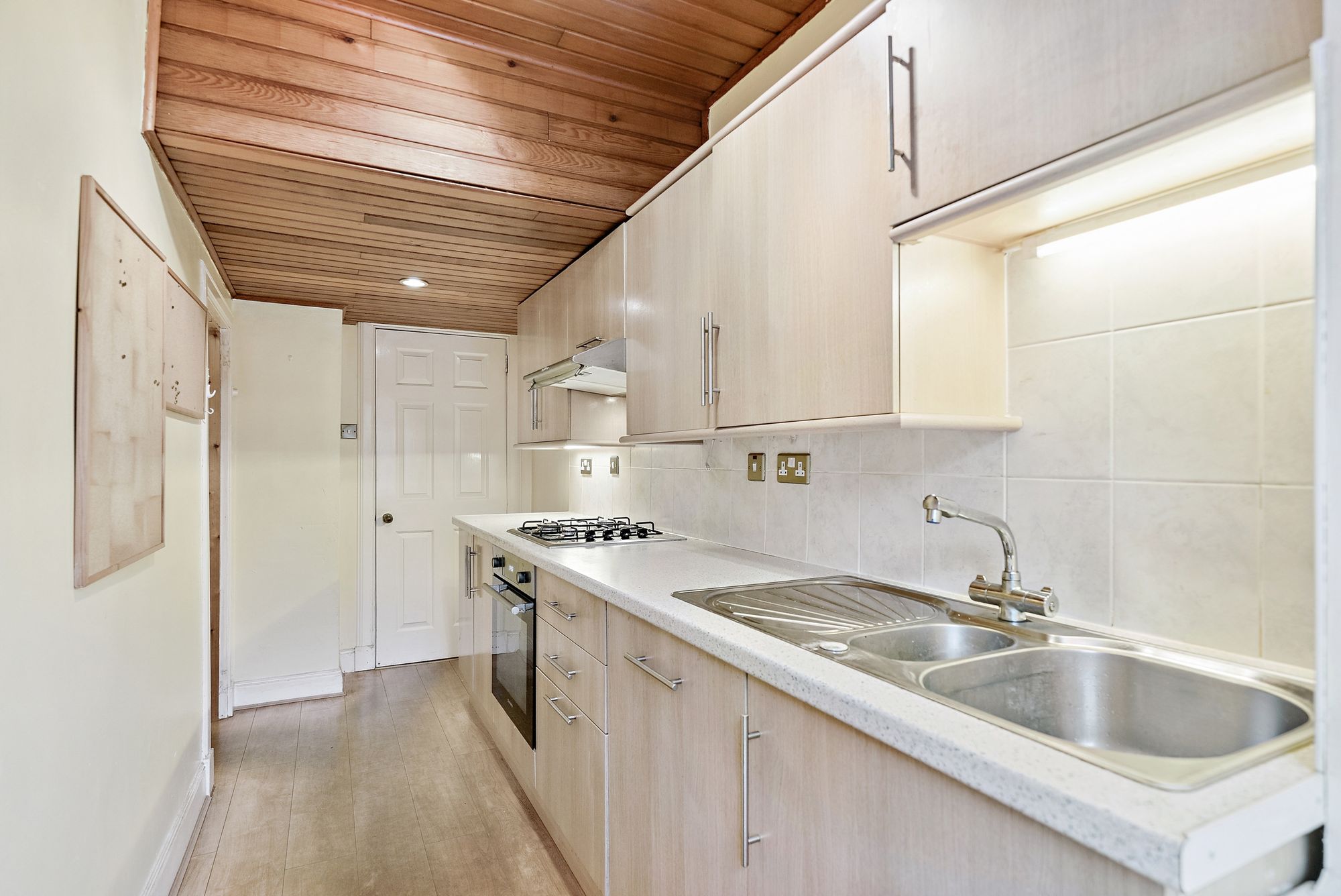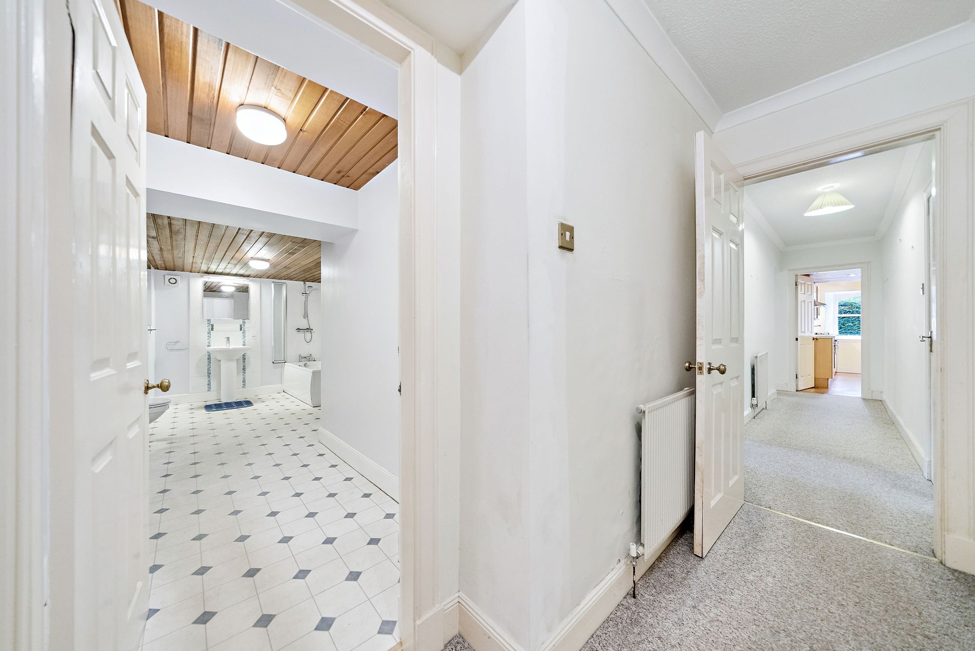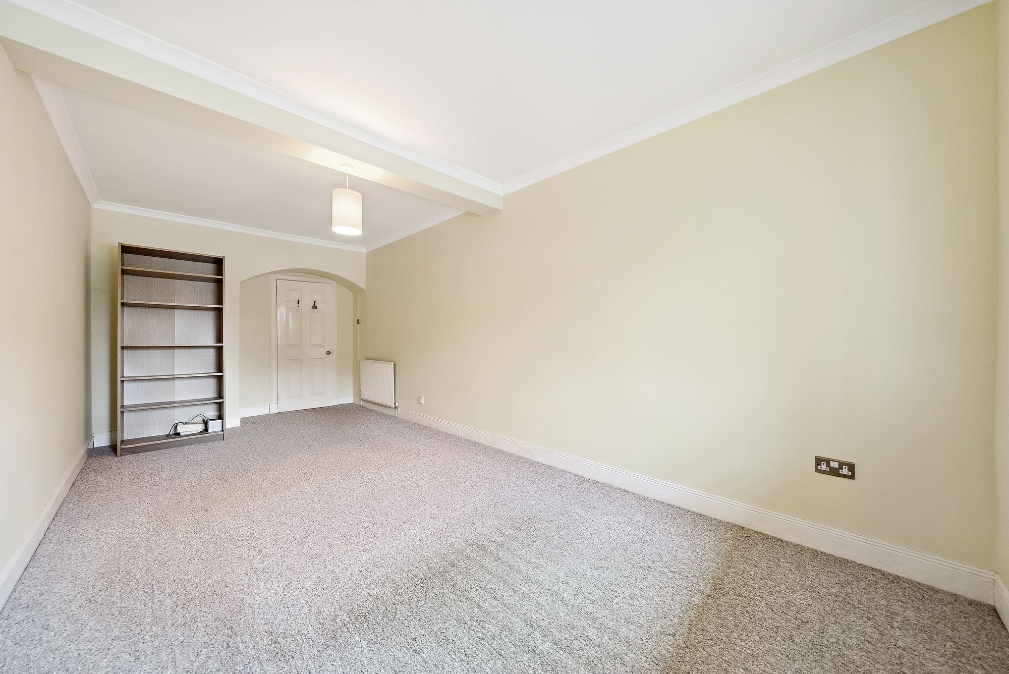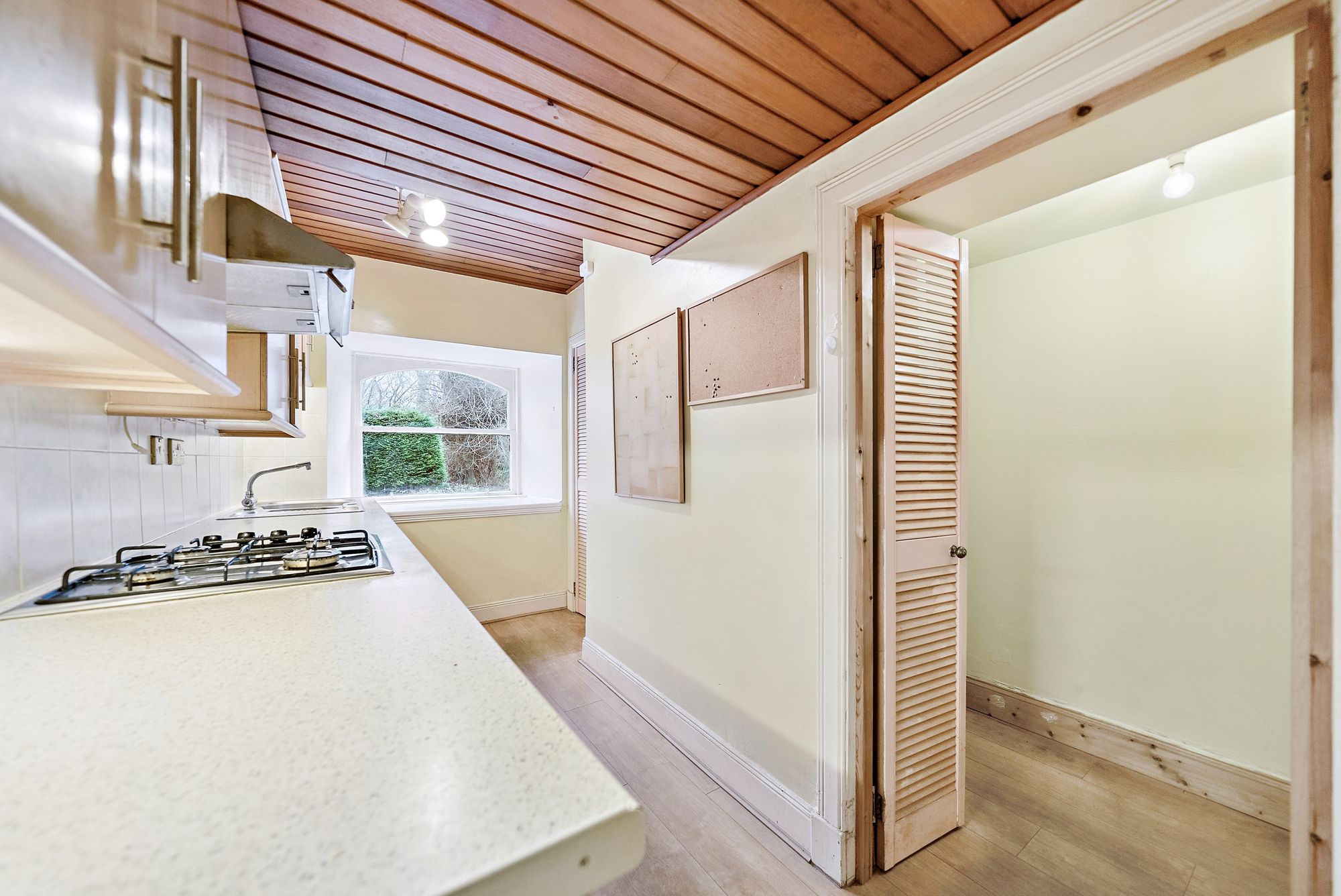 Accessed via a secure communal entrance with door entry system, the building immediately impresses with its split-level hall, stone detailing and striking architectural presence. The flat itself opens into a welcoming hallway that sets the tone for the accommodation within. At the end of the hall lies a bright and spacious bay-windowed lounge, a superb reception room enjoying open aspects to the front and flooded with natural light. The bay projection enhances both space and character, while a substantial built-in cupboard provides excellent storage. Adjacent to the lounge is the kitchen, a well-sized room offering an abundance of wall-mounted and counter-level units along with excellent storage capacity. While now requiring modernisation, it provides a strong foundation for a stylish and functional contemporary kitchen. Double doors lead through to a large pantry area that offers exceptional additional storage and further potential for creative use. The property offers two generous double bedrooms, both comfortably proportioned and capable of accommodating additional free standing furniture without compromise. Positioned at the end of the hallway, the bathroom is notably spacious and currently fitted with a bath with shower overhead, wc and wash hand basin. As with the kitchen, upgrading would unlock significant potential and allow a purchaser to create a refined interior befitting the building’s stature. Storage throughout the home is a particular strength, with multiple cupboards located in the hallway, adjacent to the bathroom and within a dedicated boiler cupboard, ensuring practicality complements the period charm. Heating is provided by mains gas central heating, and the windows are predominantly aluminium-framed casement style, with a traditional sash and case window retained in the kitchen, preserving an authentic period element.