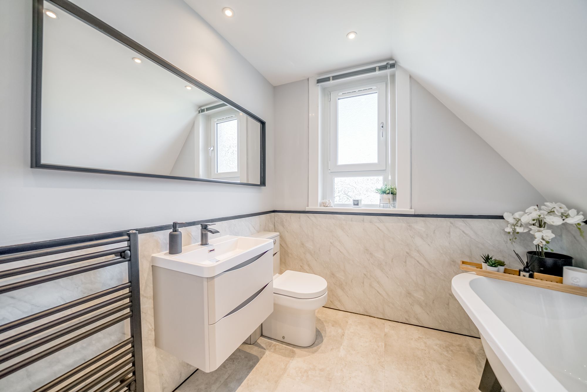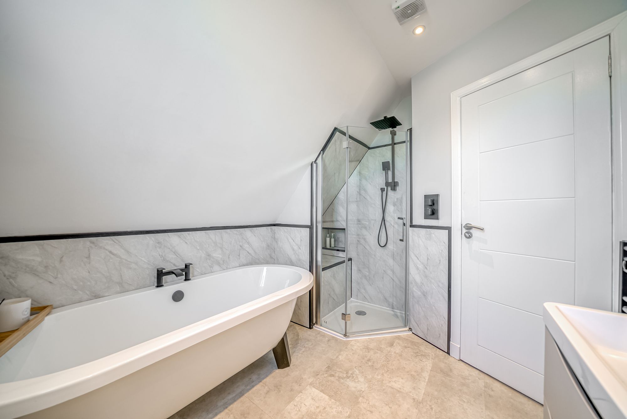 The upper level has a central landing with a storage cupboard, two further bedrooms and the family bathroom which has a free standing bath, built in shower cubicle, WC and wash hand basin.