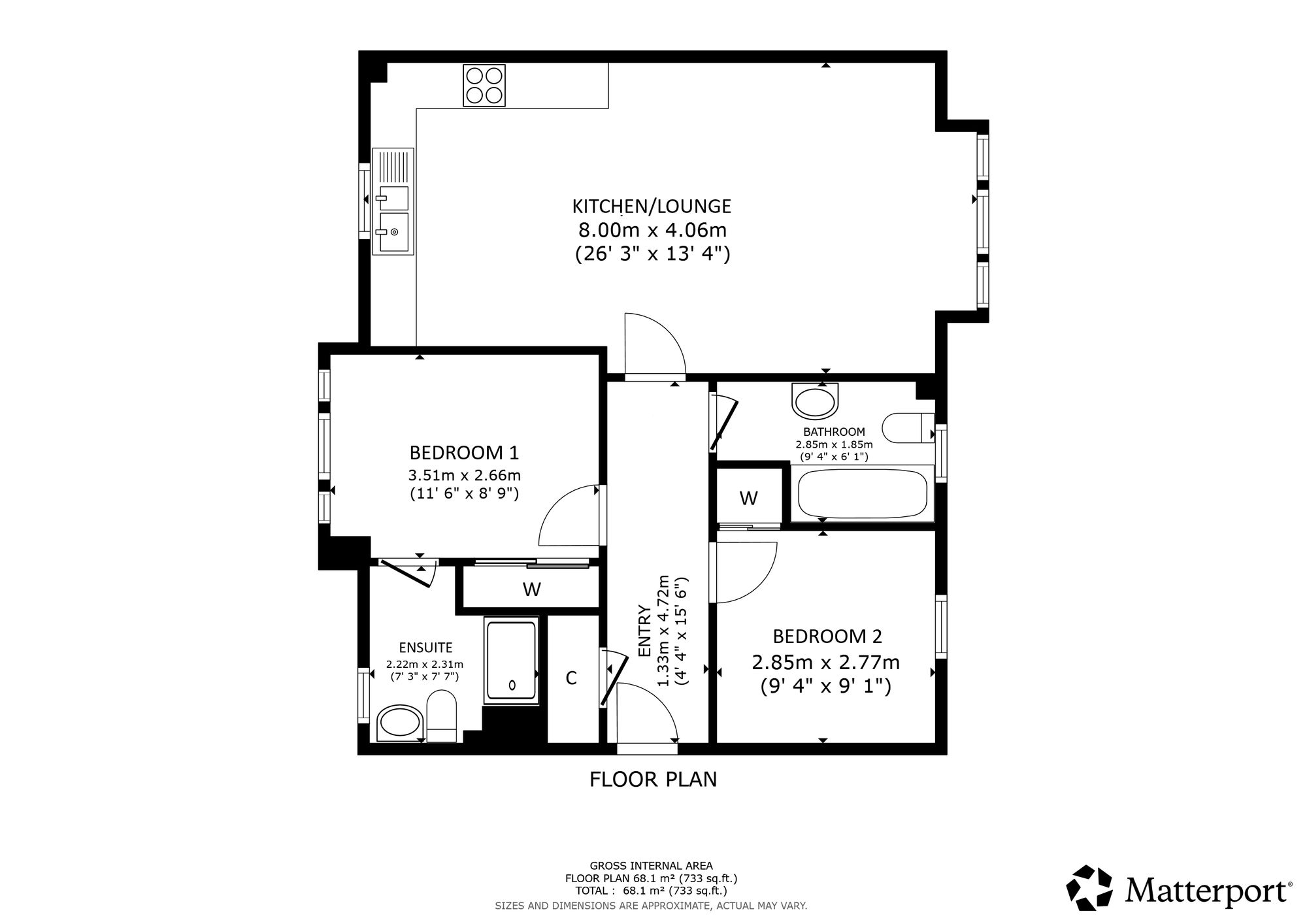 A bright communal entrance with secure entry and a naturally lit upper landing leads to the apartment. Inside, a spacious hallway flows into a generous open-plan lounge, dining and kitchen area. The stylish kitchen features sleek wall and base units, integrated appliances and a modern wooden floor that subtly defines the space. The lounge is filled with natural light and enjoys lovely views across the gardens toward the water. The master bedroom is beautifully presented, complete with built-in wardrobe and a contemporary, fully tiled ensuite shower room with walk-in shower enclosure, vanity wash hand basin and wc. A second double bedroom also benefits from a fitted wardrobe and stunning views over the Gare Loch. The main bathroom is fresh and modern, offering a bath with overhead shower, wc and wash hand basin. Additional hallway storage, full double glazing and gas central heating further enhance comfort and convenience.