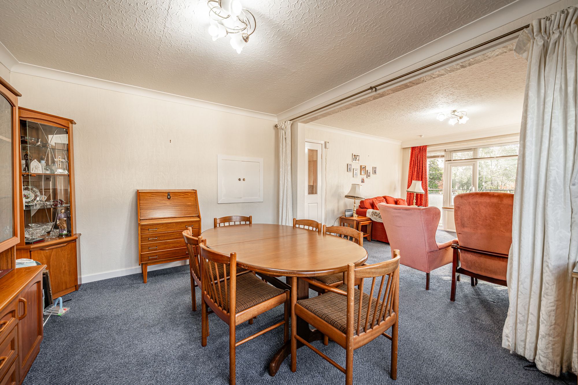 Accessed via a secure door entry system into a well-kept communal hallway, the accommodation comprises a long and welcoming reception hall with a wealth of storage. The immensely bright and expansive formal lounge and dining area enjoys a wonderful outlook over the gardens and provides direct access to the private balcony — a perfect spot for morning coffee or relaxed evening dining. The dining-sized kitchen is well appointed with a range of base and wall-mounted units, offering excellent storage and workspace.