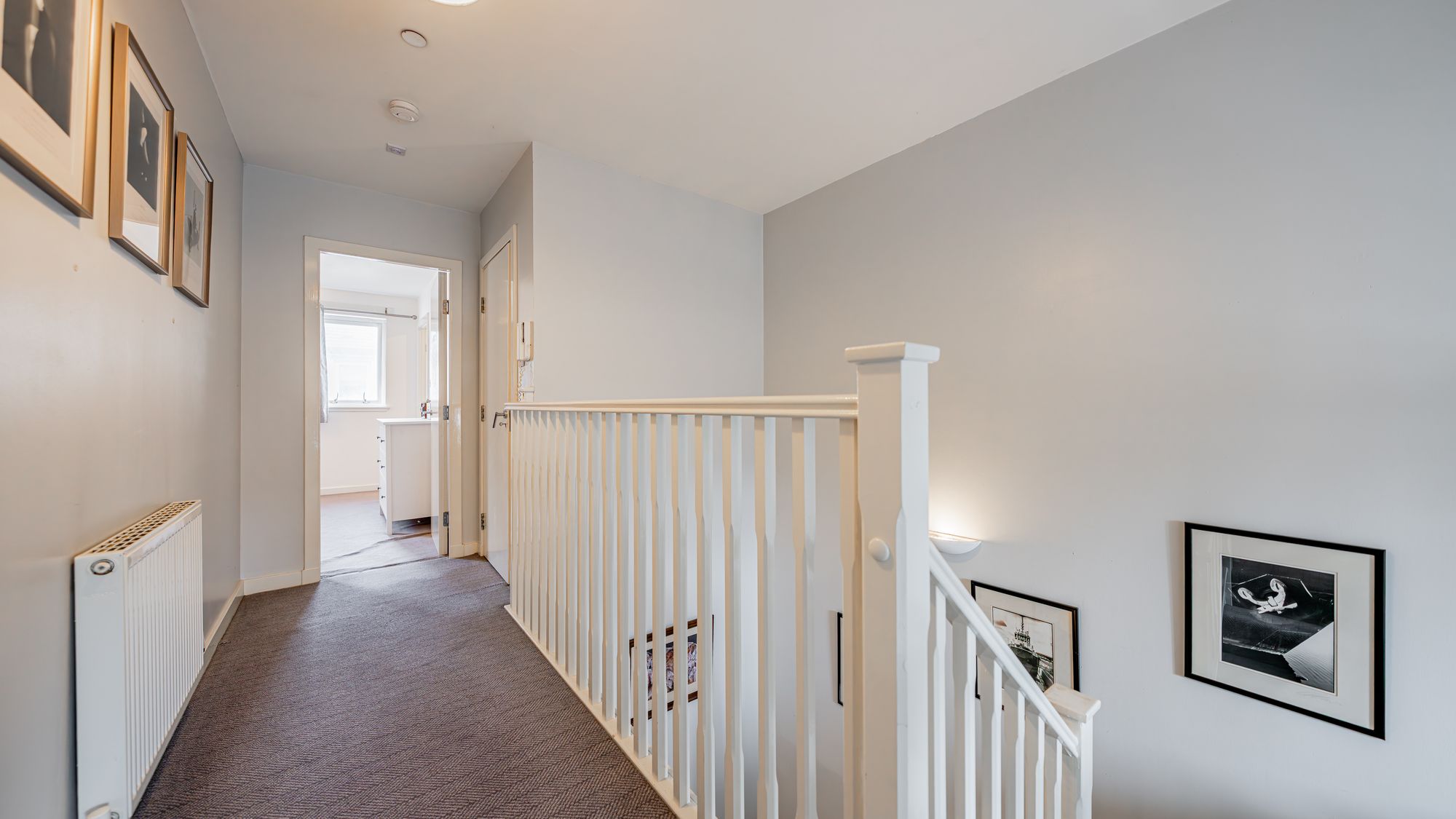 Inside, the property offers a welcoming entrance vestibule with WC off, a spacious lounge with designated dining area and understairs storage. The modern kitchen, also open-plan, is L-shaped and offers plenty of storage, worktop space, and integrated appliances. A staircase from the lounge leads to the upper landing, giving access to two bright and spacious double bedrooms. Both bedrooms have en-suite bathrooms, and the principal bedroom is particularly well presented. The second bedroom also features access to a private outdoor terrace with elevated views over Glasgow - perfect for relaxing or entertaining.