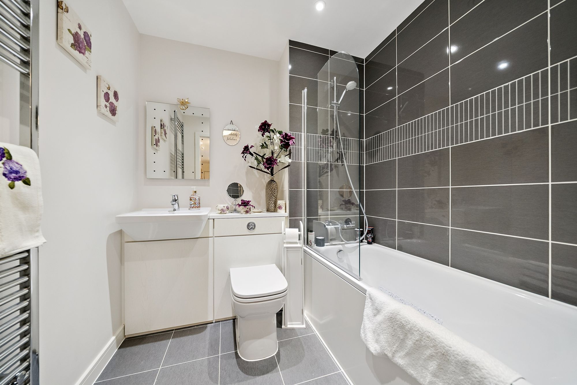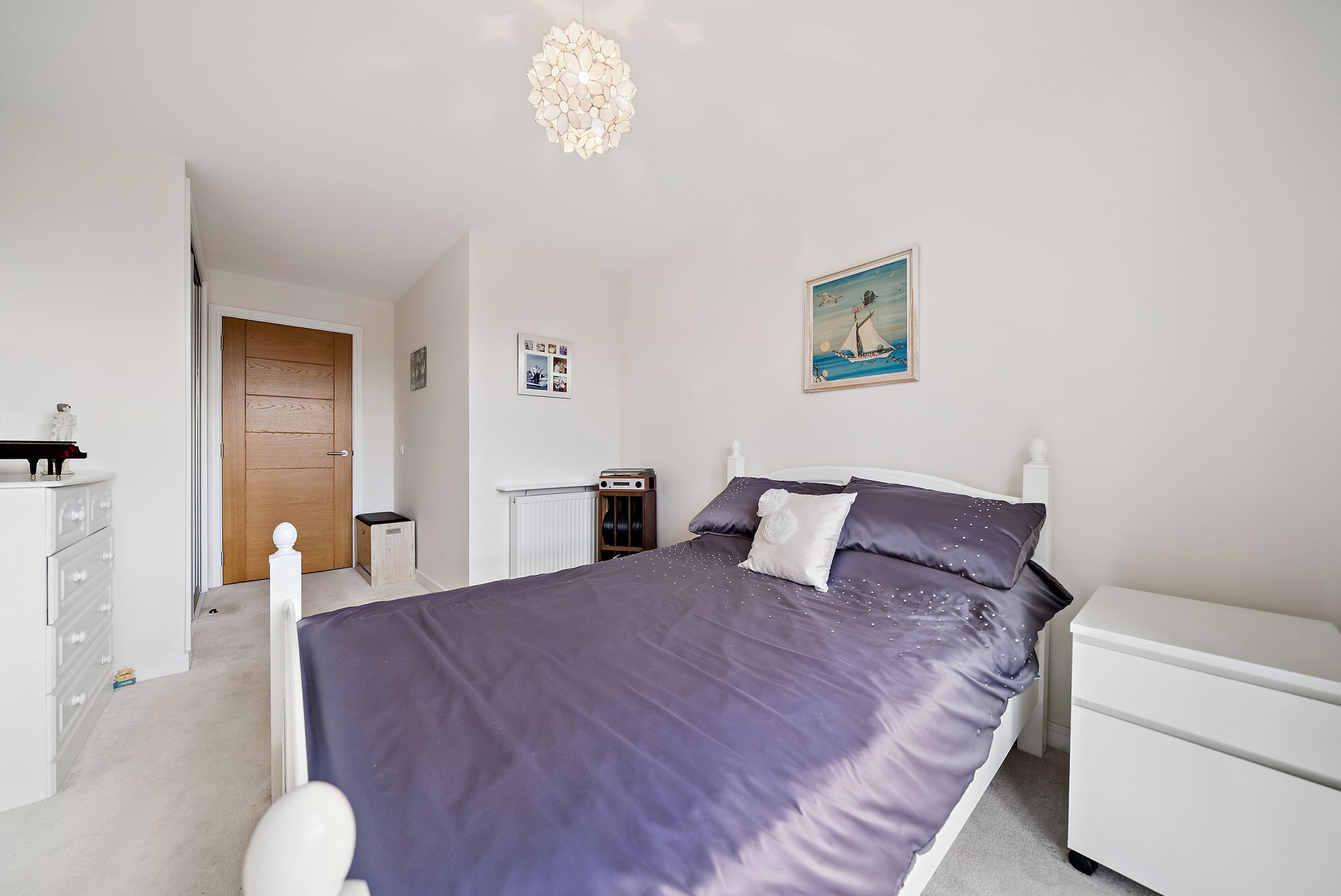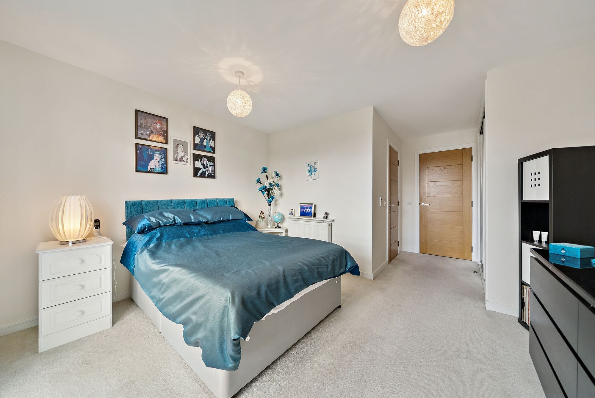 The accommodation further comprises two well-proportioned double bedrooms, both benefiting from large windows that flood the rooms with natural light, along with built-in wardrobes. The principal bedroom also enjoys a stylish en-suite shower room. A modern family bathroom completes the accommodation, finished to a high standard with sleek floor-to-ceiling tiling.