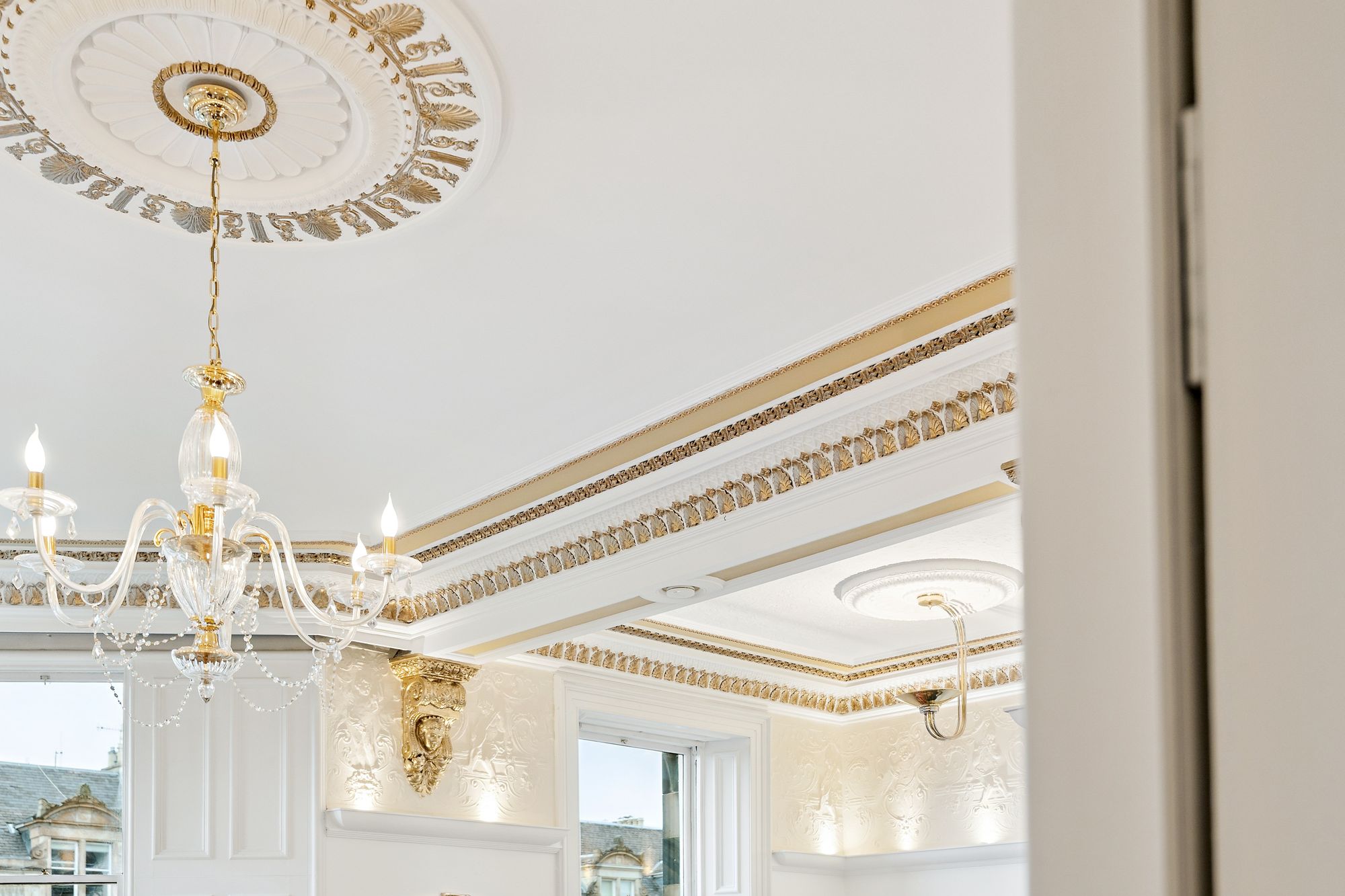 The attached photographs, floor plan ad HD video tour will give an indication to the size and layout of the flat. However, in brief the accommodation extends to; welcoming entrance hallway, a stunning living/dining room which was formerly a drawing room. It is an exceptionally bright and spacious room with original Cherub dado and wonderful cornice. There is also a hidden bar behind, accessed via remote control. The kitchen is off the lounge and has a number of base and wall mounted units with integrated appliances and tiled splash back. There are two rear facing bedrooms, with the principal room benefitting from built in wardrobes. The second bedroom has a mezzanine level with space for a double bed. The accommodation is completed by a main bathroom with three piece suite and shower over the bath.