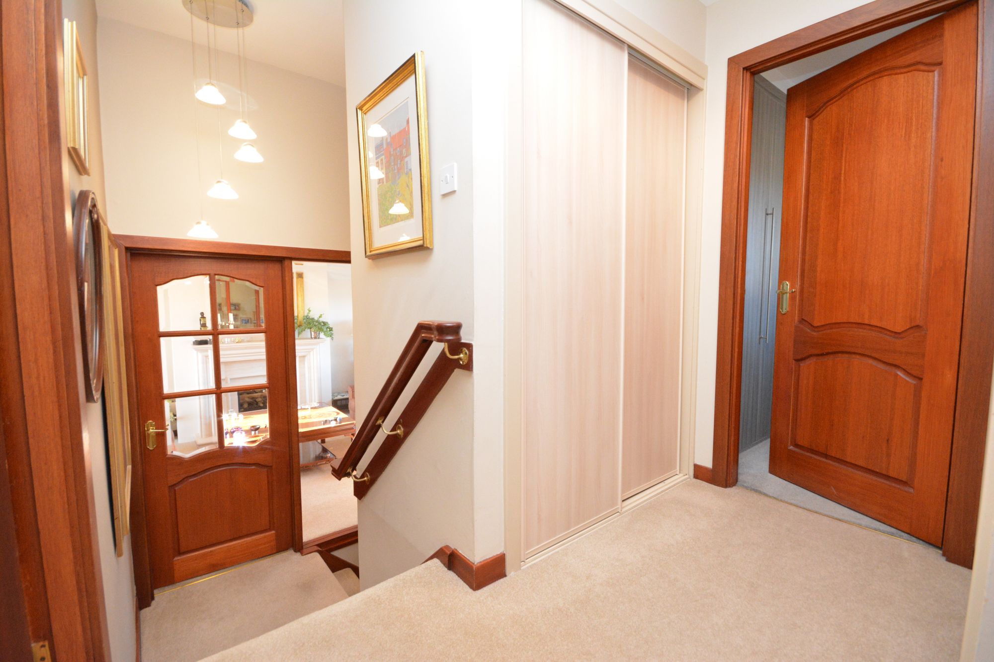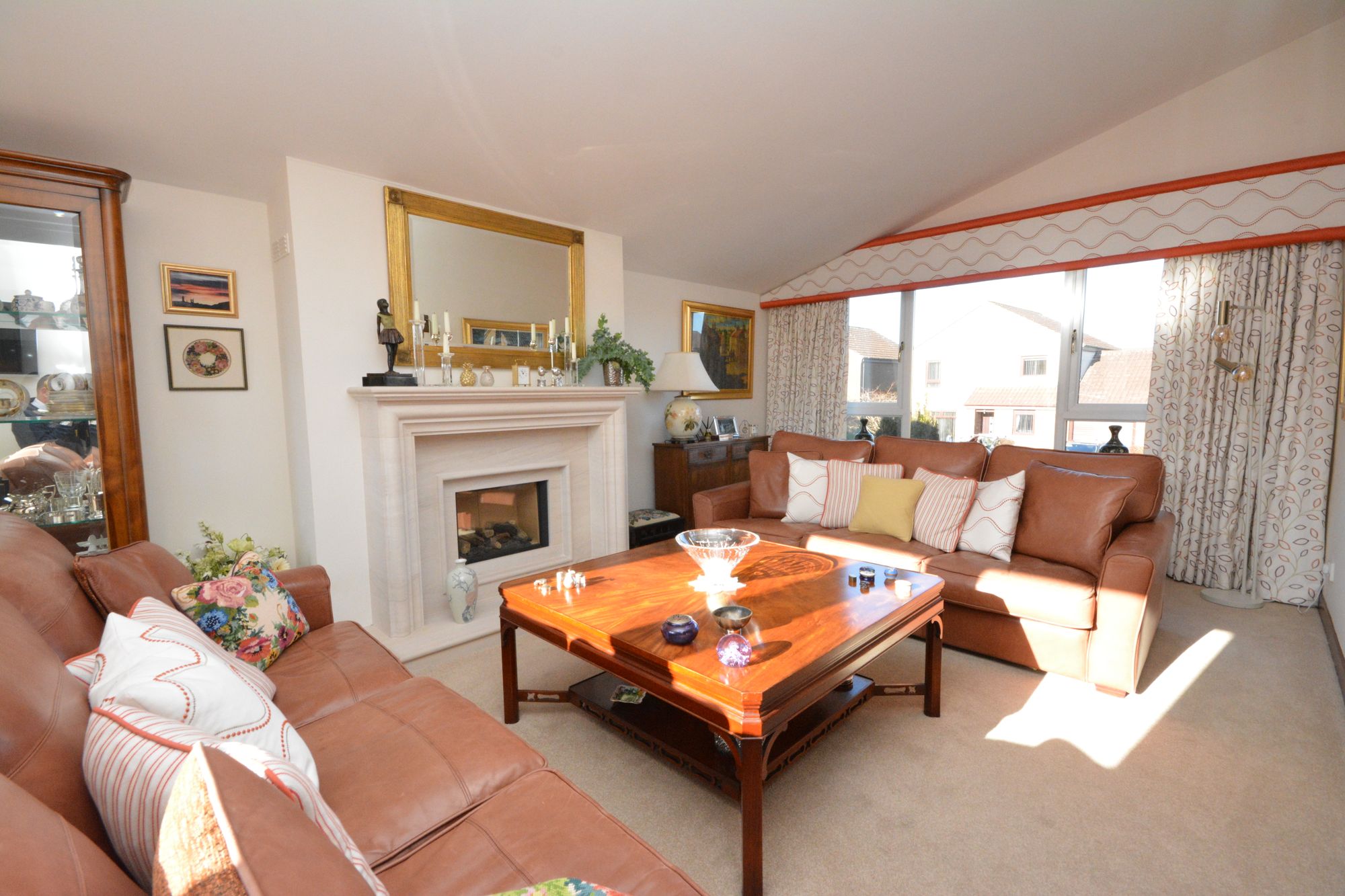 The staircase from the reception hallway leads to a half landing and an impressive mezzanine level lounge which extends to in excess of twenty feet in length and has both a focal point Portuguese stone fire surround and French doors leading to a glass and aluminium enclosed sun balcony.