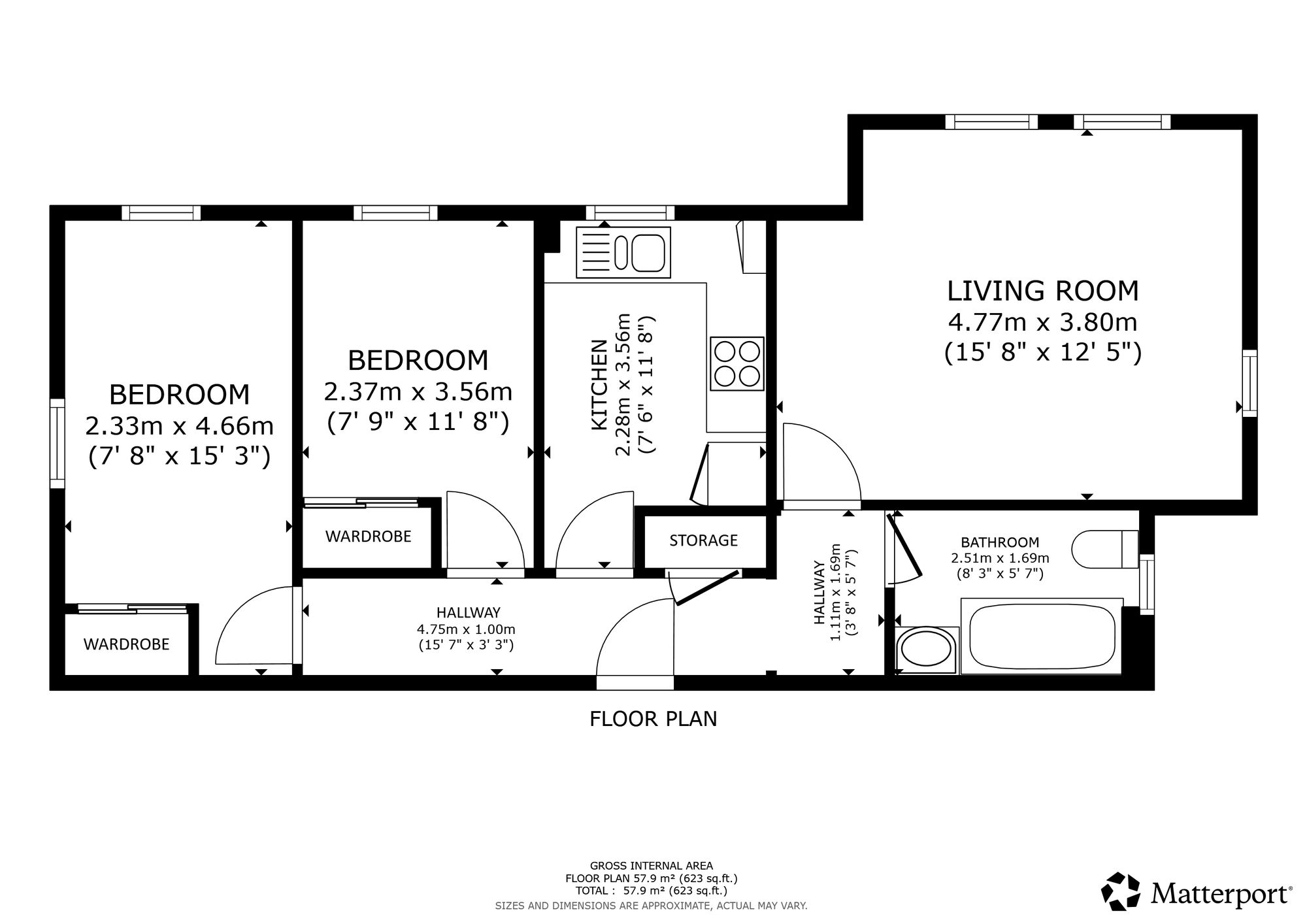 The internal accommodation comprises; entrance hallway with storage cupboard, impressive sized lounge with open facing aspects, new kitchen with fitted wall and floor units, integrated fridge freezer, oven, electric hob and extractor, space and plumbing for washing machine, two well proportioned double bedrooms that both offer fitted mirrored wardrobes, and modern bathroom with fresh white three piece suite and over-bath mains shower, fully tiled. Warmth is provided by gas heating with original timber casement double glazed windows.