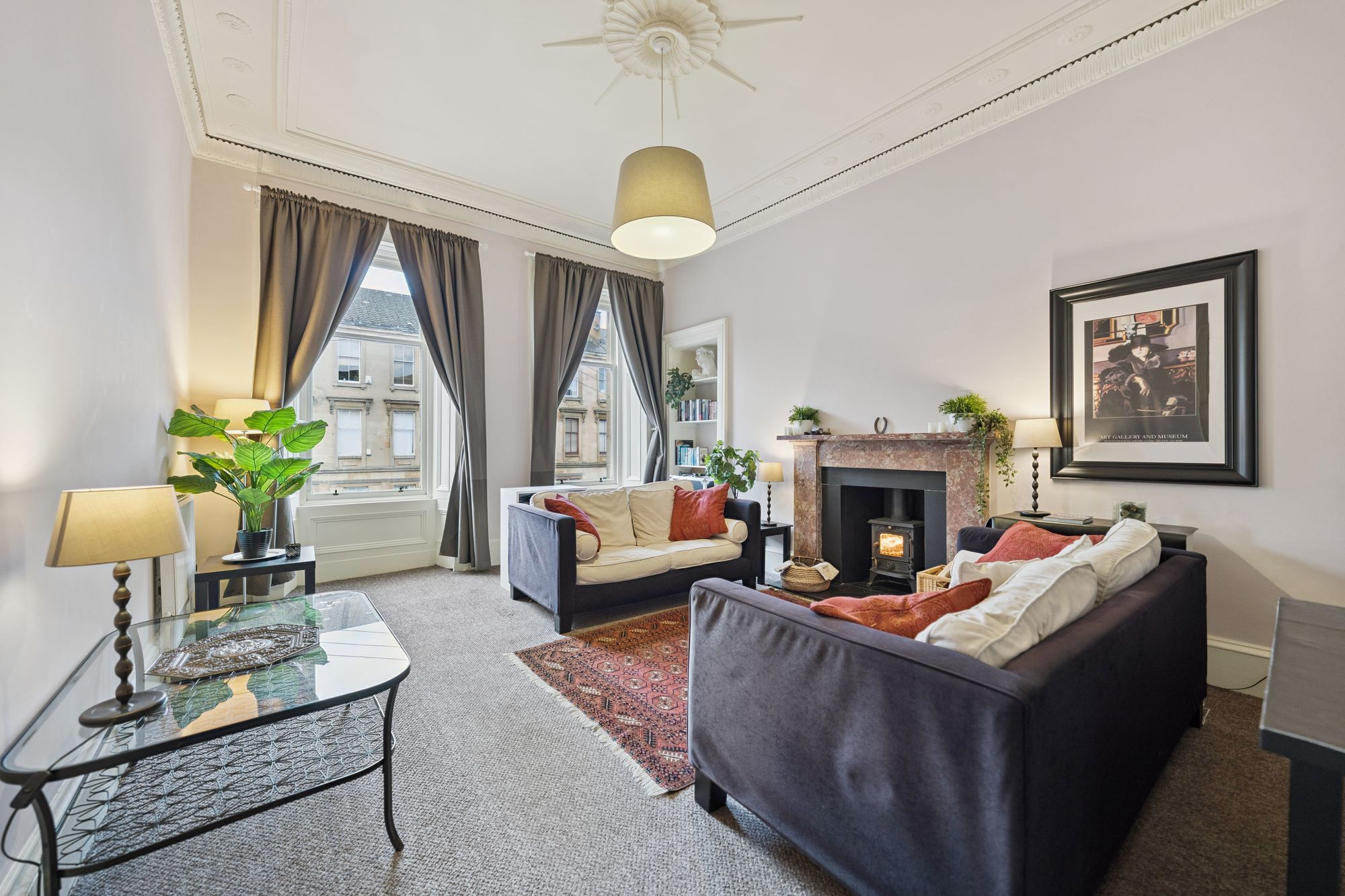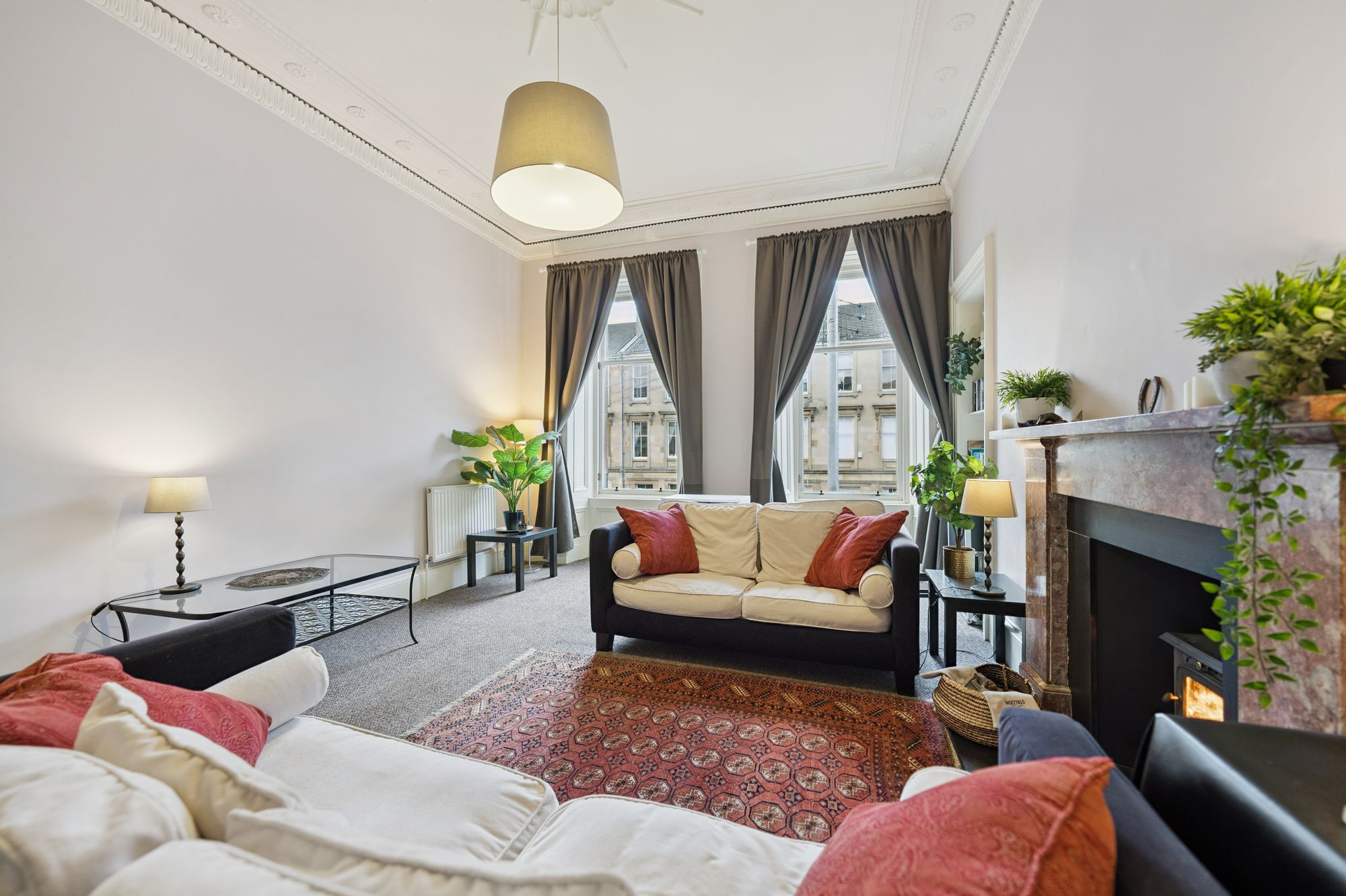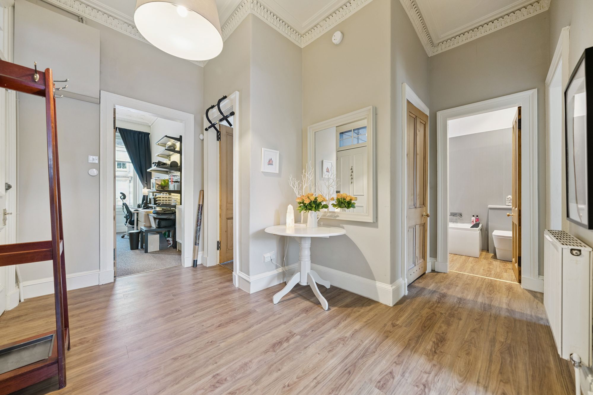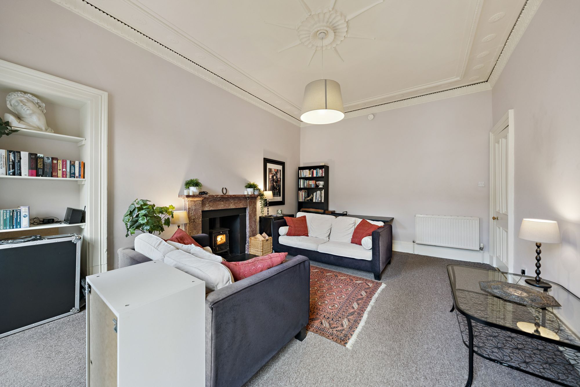 The building is accessed via secure door entry into a well-maintained communal close and stairwell, a real credit to the residents. Internally, the accommodation is both generous and tastefully presented throughout. A welcoming reception hallway with wood effect flooring leads to a particularly impressive lounge, enjoying a bright double aspect, ornate cornicing, and a charming woodburning stove set within a marble surround, complete with bespoke alcove shelving.