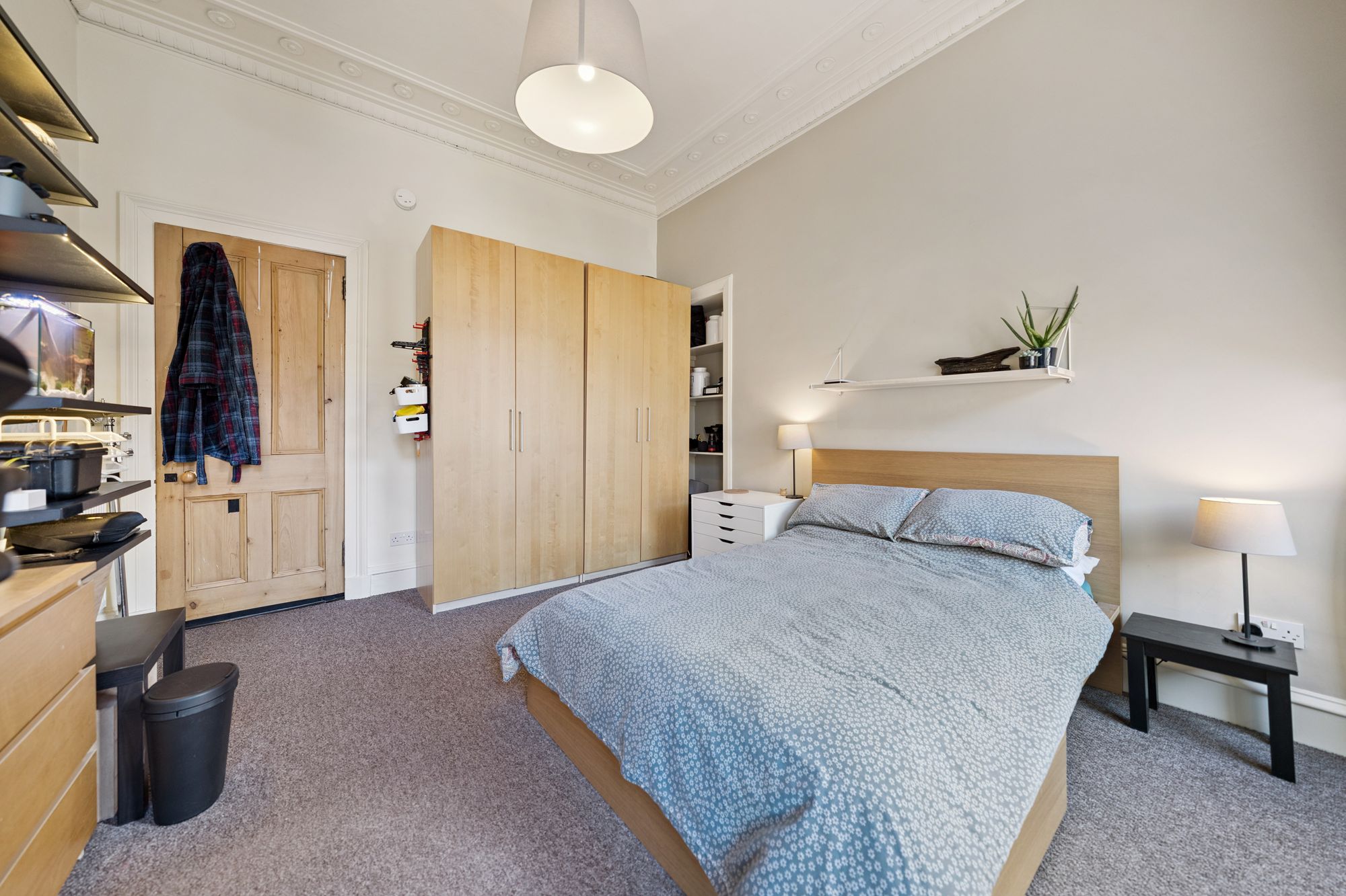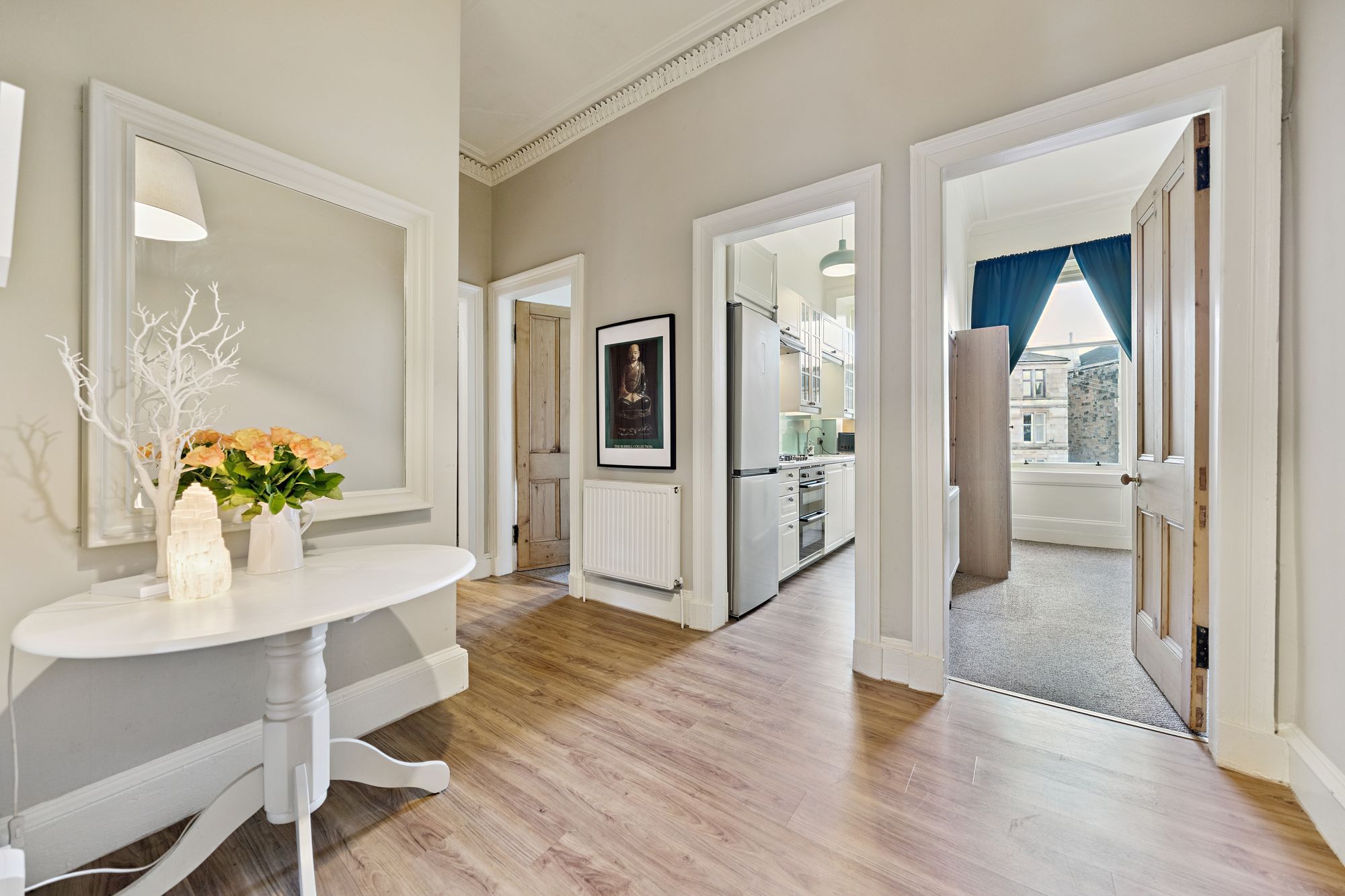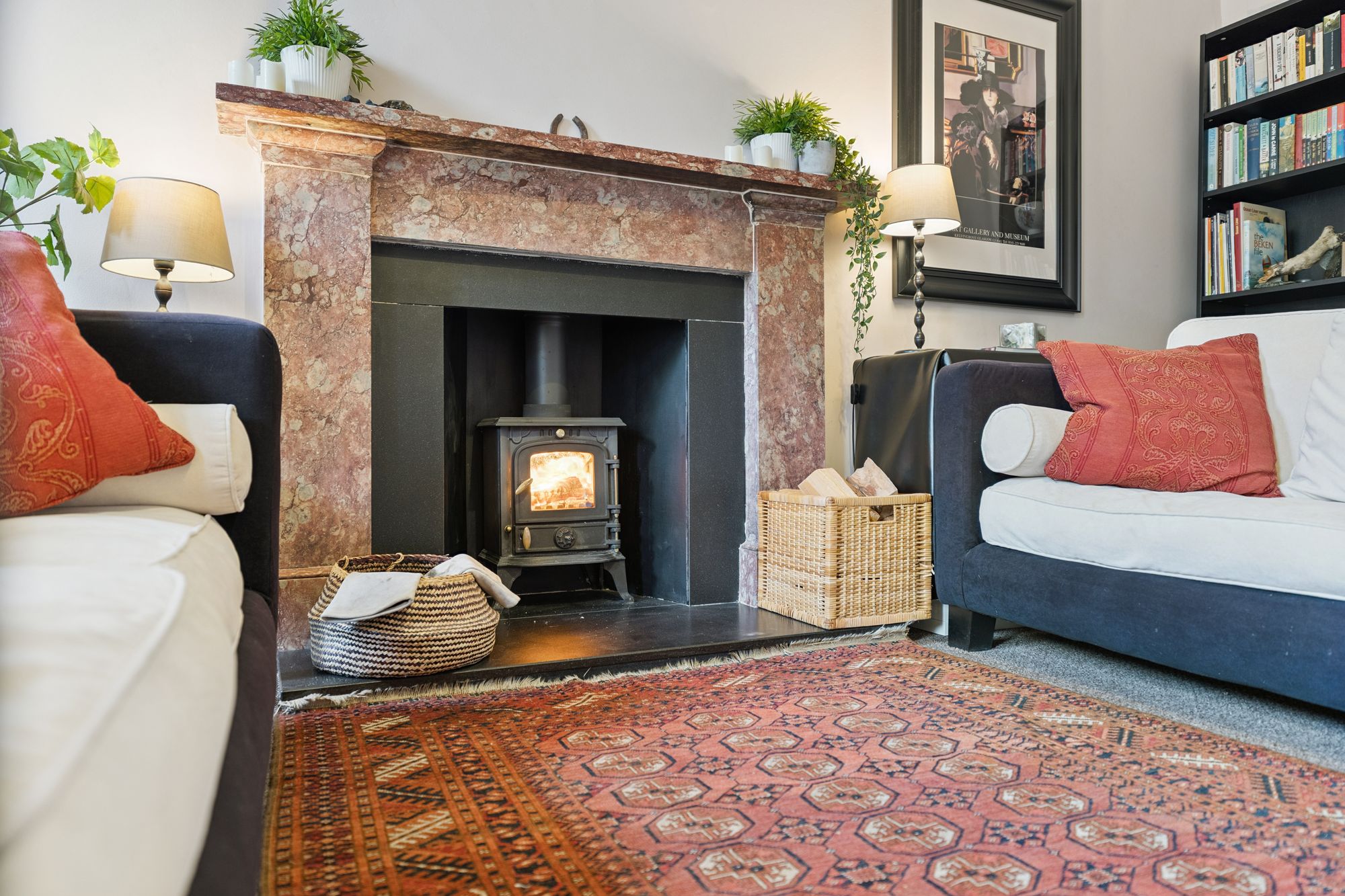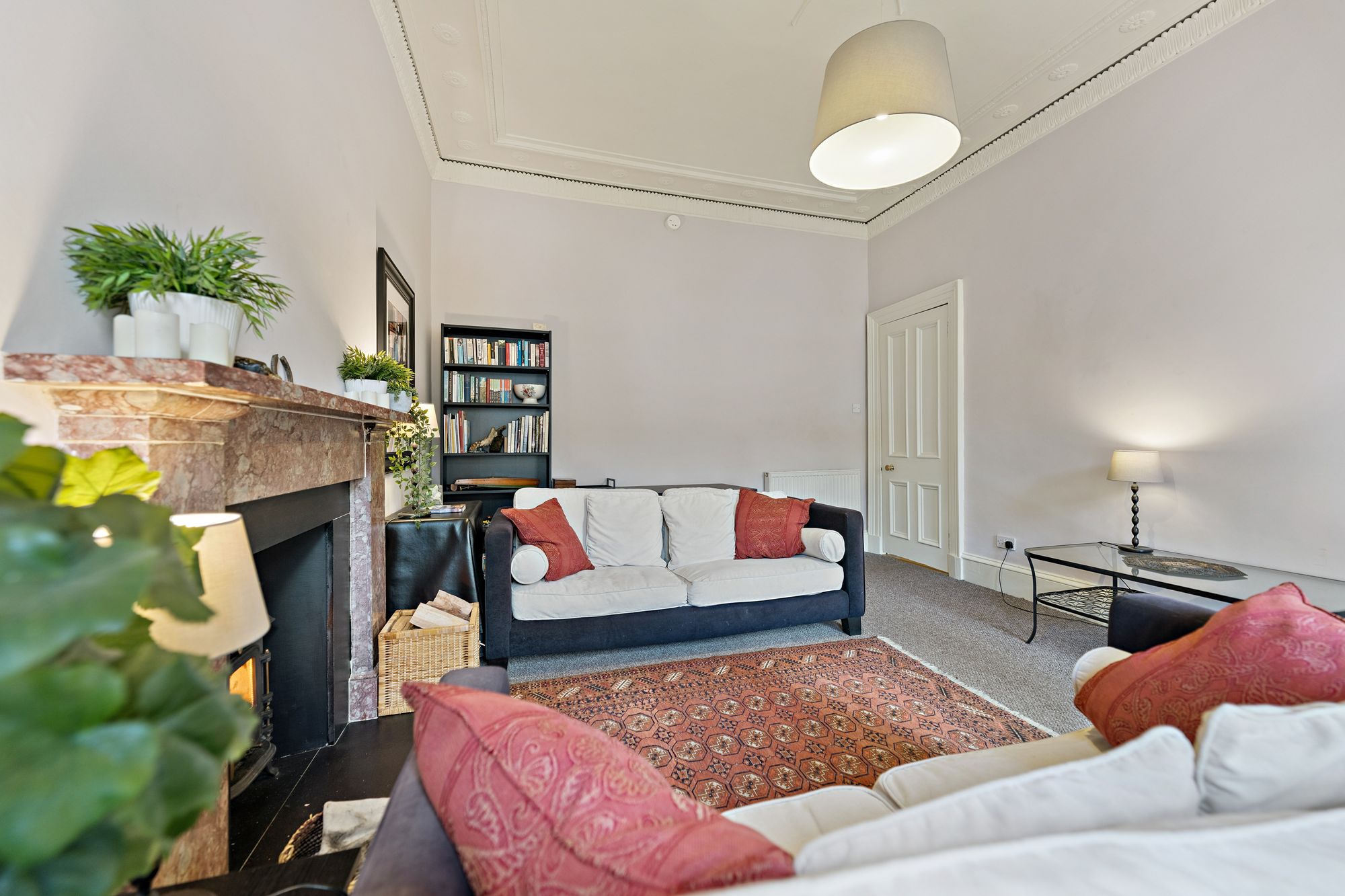 The building is accessed via secure door entry into a well-maintained communal close and stairwell, a real credit to the residents. Internally, the accommodation is both generous and tastefully presented throughout. A welcoming reception hallway with wood effect flooring leads to a particularly impressive lounge, enjoying a bright double aspect, ornate cornicing, and a charming woodburning stove set within a marble surround, complete with bespoke alcove shelving.