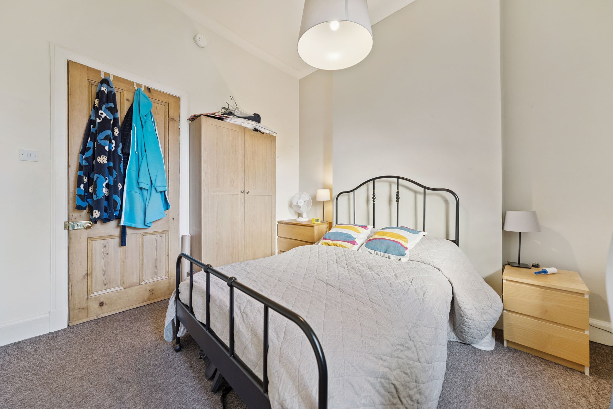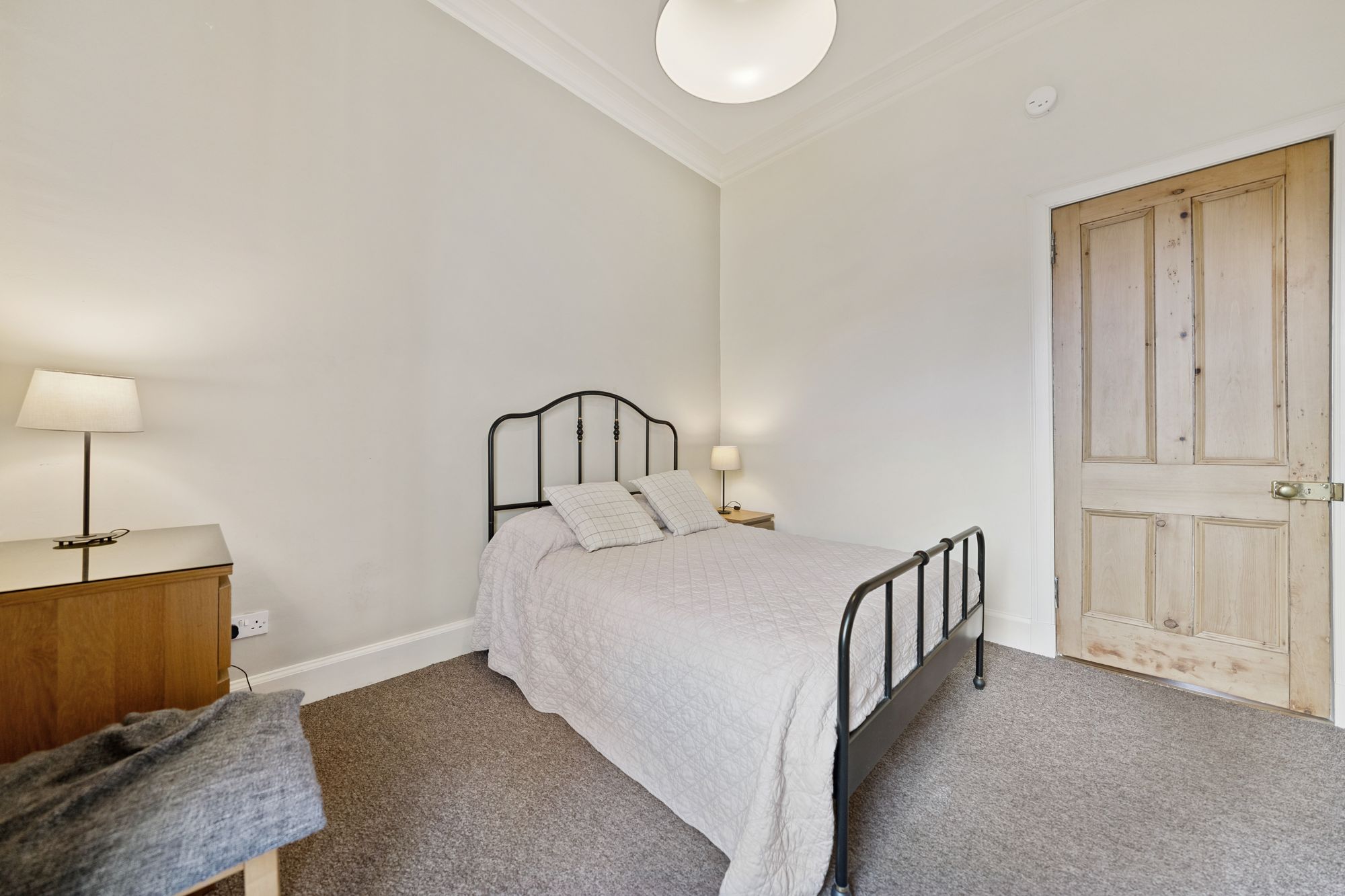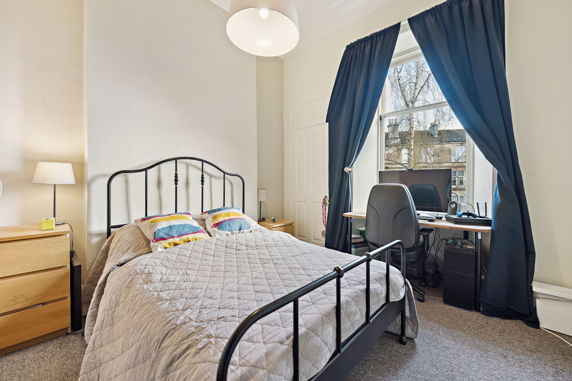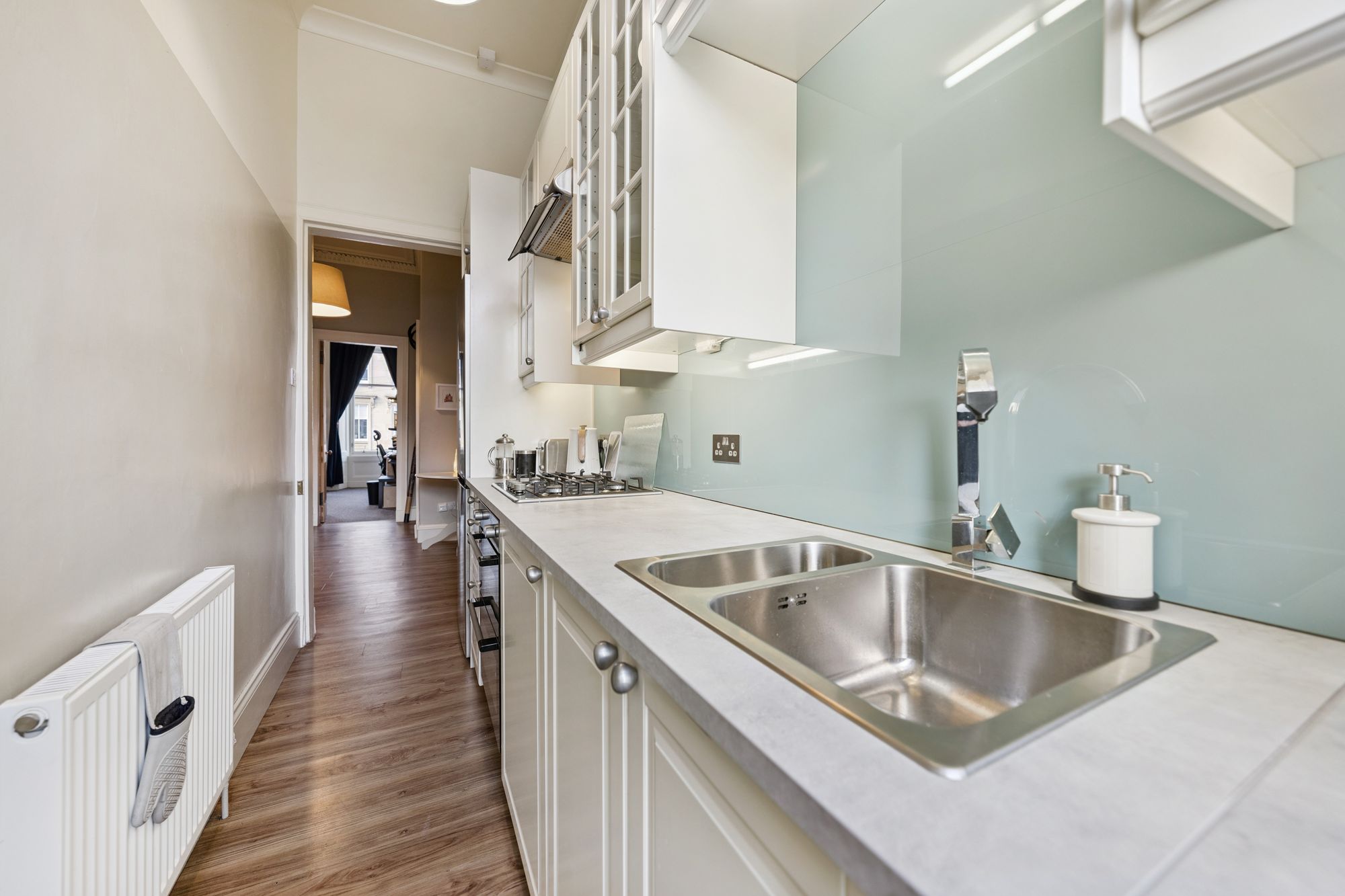 The building is accessed via secure door entry into a well-maintained communal close and stairwell, a real credit to the residents. Internally, the accommodation is both generous and tastefully presented throughout. A welcoming reception hallway with wood effect flooring leads to a particularly impressive lounge, enjoying a bright double aspect, ornate cornicing, and a charming woodburning stove set within a marble surround, complete with bespoke alcove shelving.