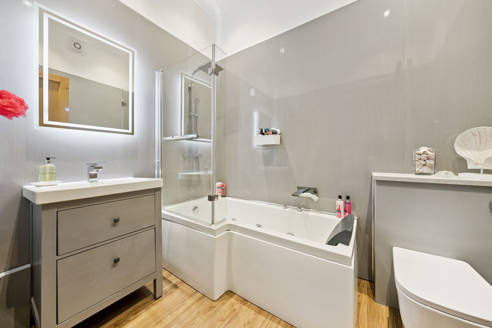 There are three well-proportioned bedrooms, with bedroom one benefitting from fitted alcove shelving. The accommodation is completed by a modern, refurbished bathroom featuring high gloss wall panelling, a shower over whirlpool bath, and a white three-piece suite.