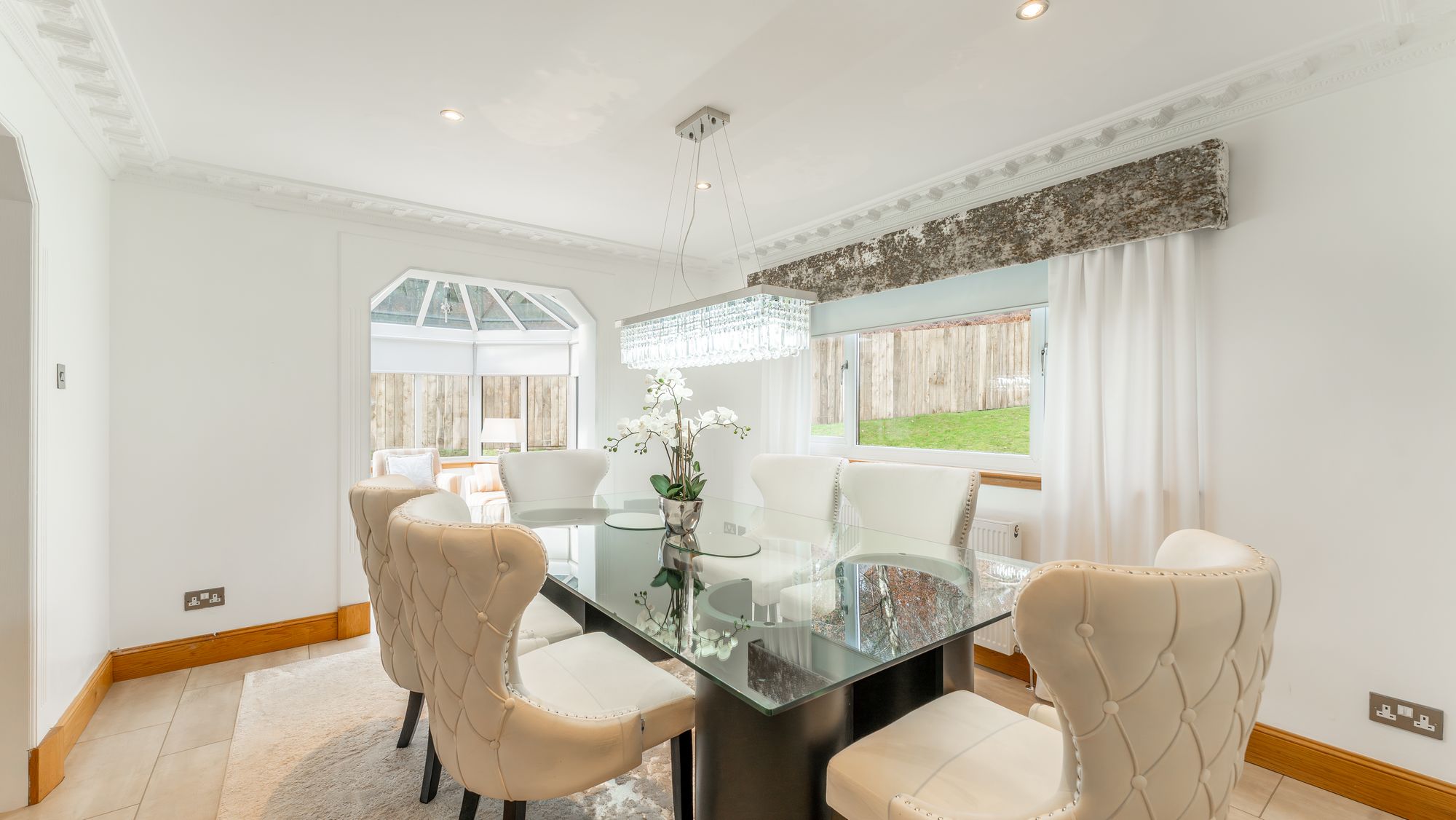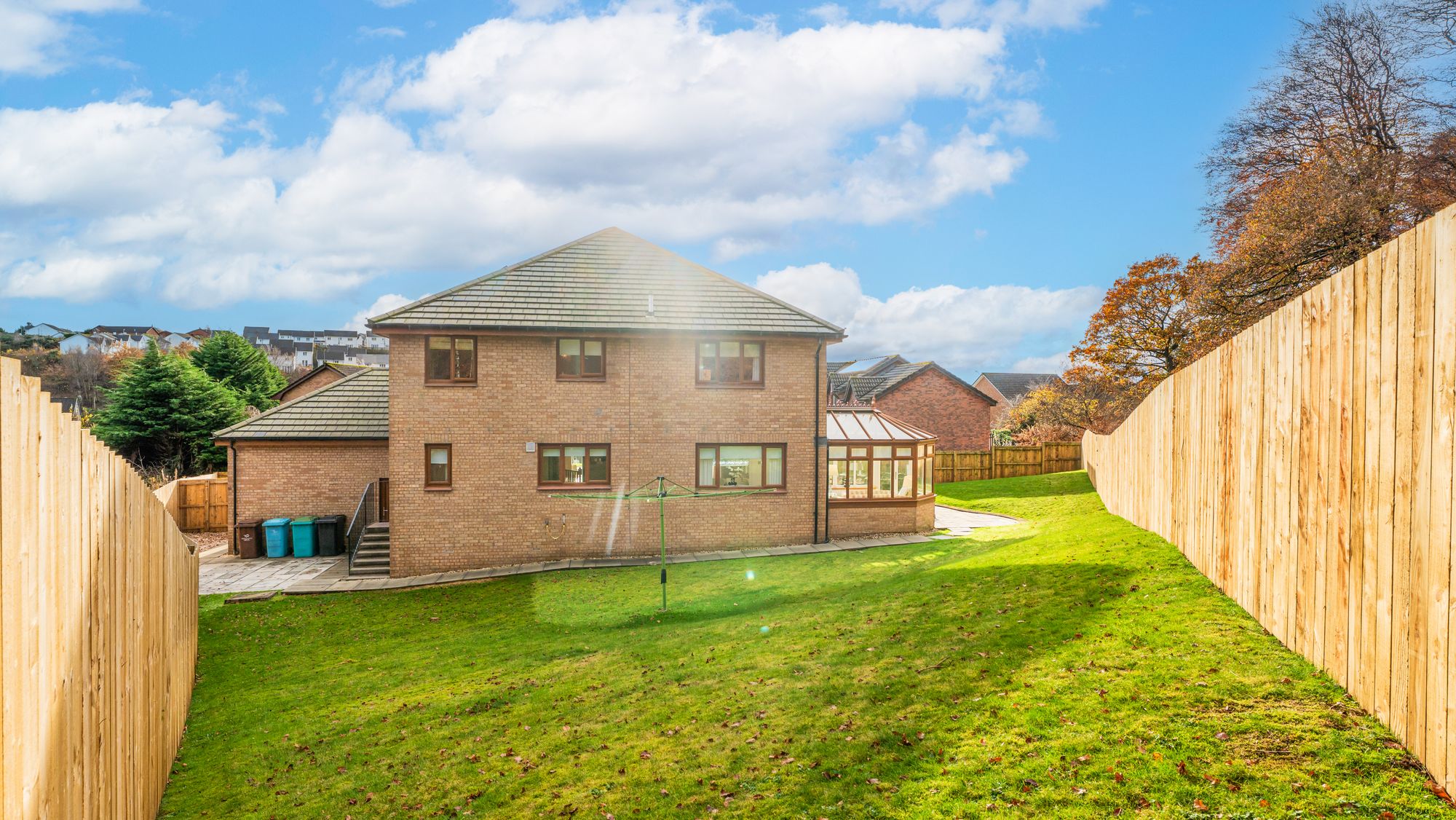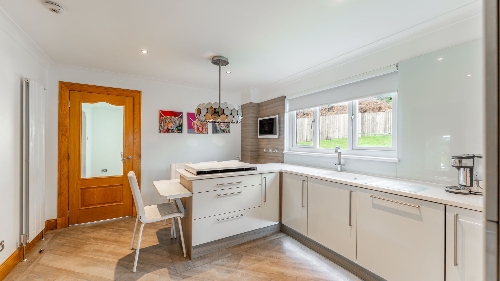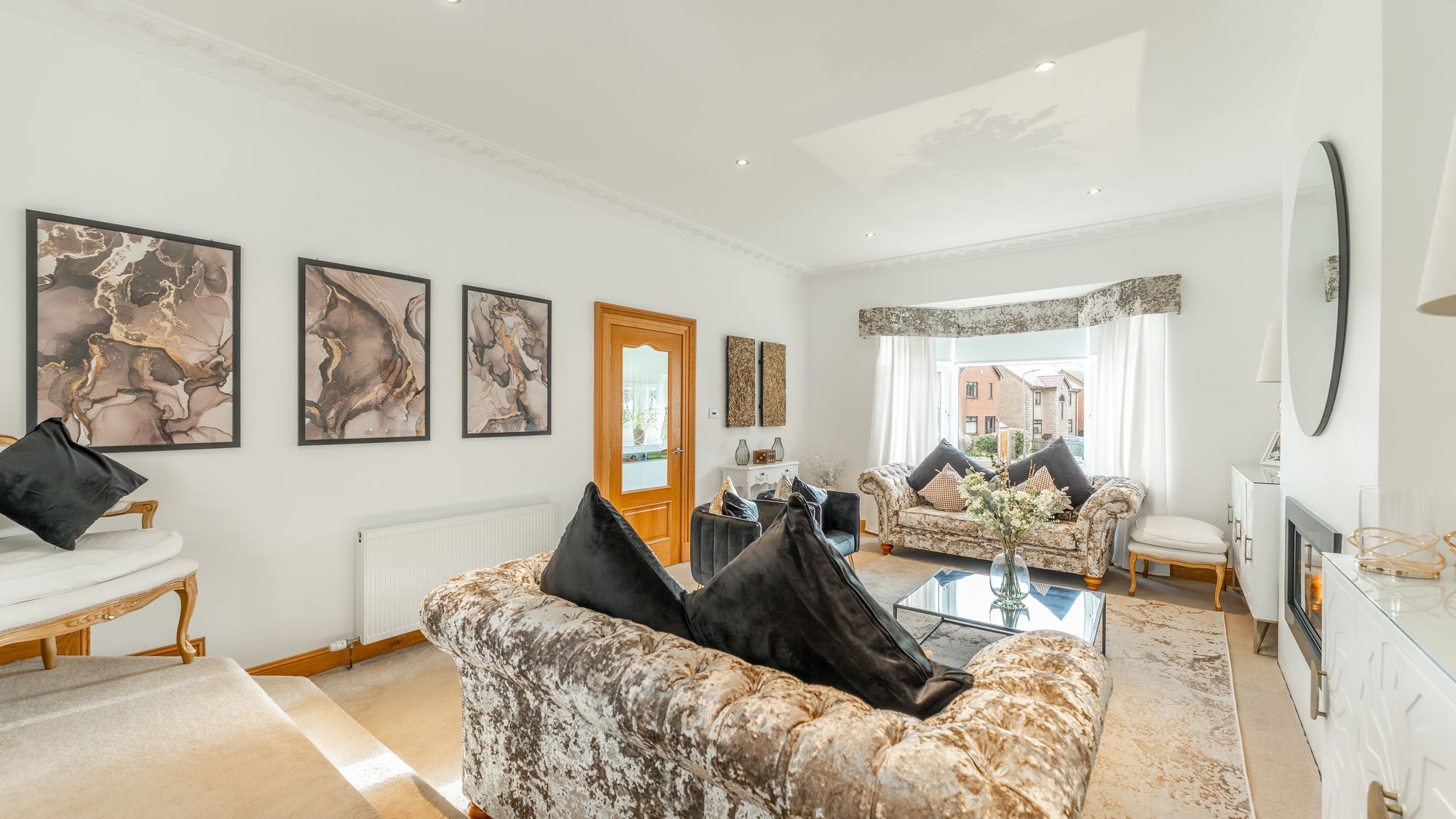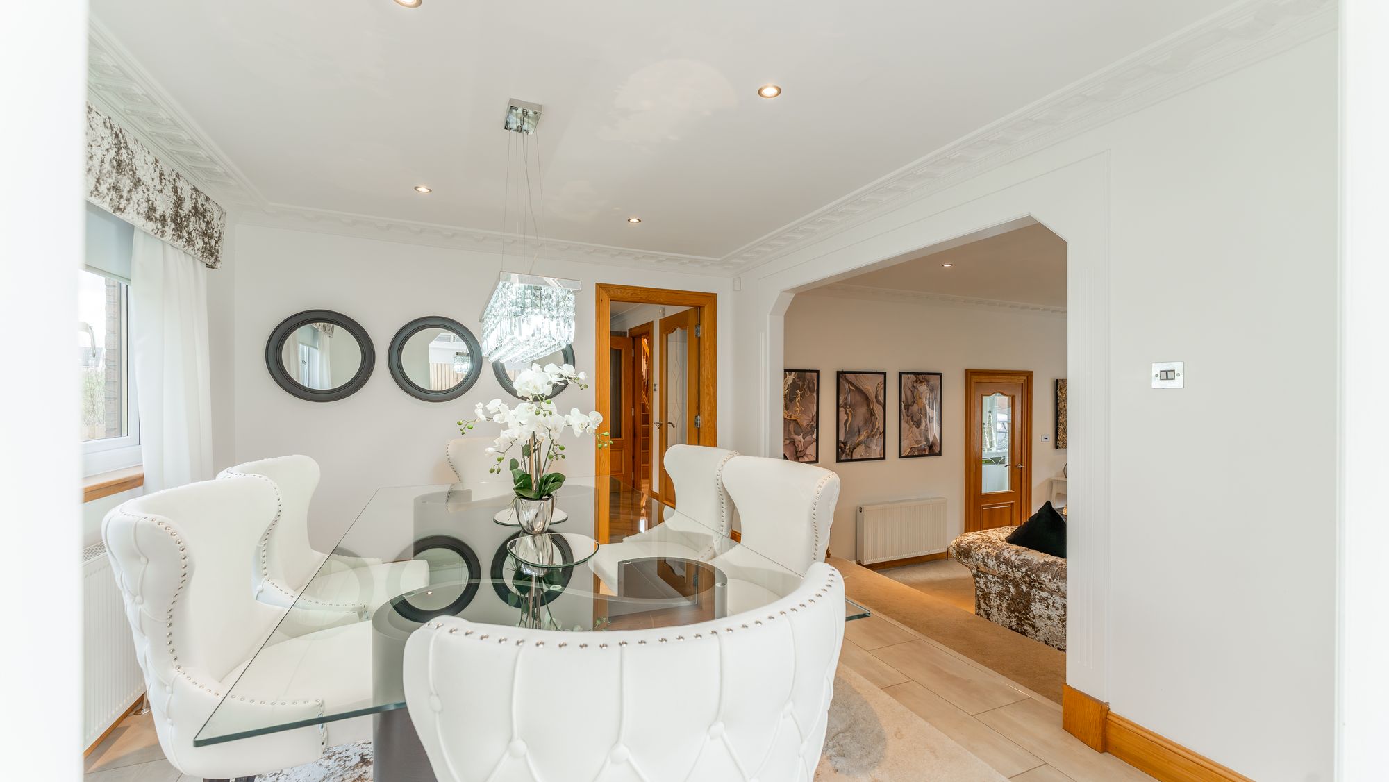 Set within a highly desirable residential area of Kilsyth, this impressive four/five bedroom detached home combines generous proportions, contemporary style, and modern comfort, making it ideal for family living. The welcoming reception hall leads to a beautifully presented bay windowed lounge filled with natural light and featuring a living flame gas fire. This space flows seamlessly into the dining room, which in turn opens into a bright and airy sunroom with direct access to the rear garden. The property also boasts a stunning fitted kitchen with sleek white gloss cabinetry complemented by walnut finishes, a convenient breakfast bar, Silestone sink and worktops, and a range of integrated appliances. Off the hallway, there is an additional lounge offering flexible use—ideal as a fifth bedroom or home office—while a utility room and a fully tiled downstairs WC complete the ground floor.