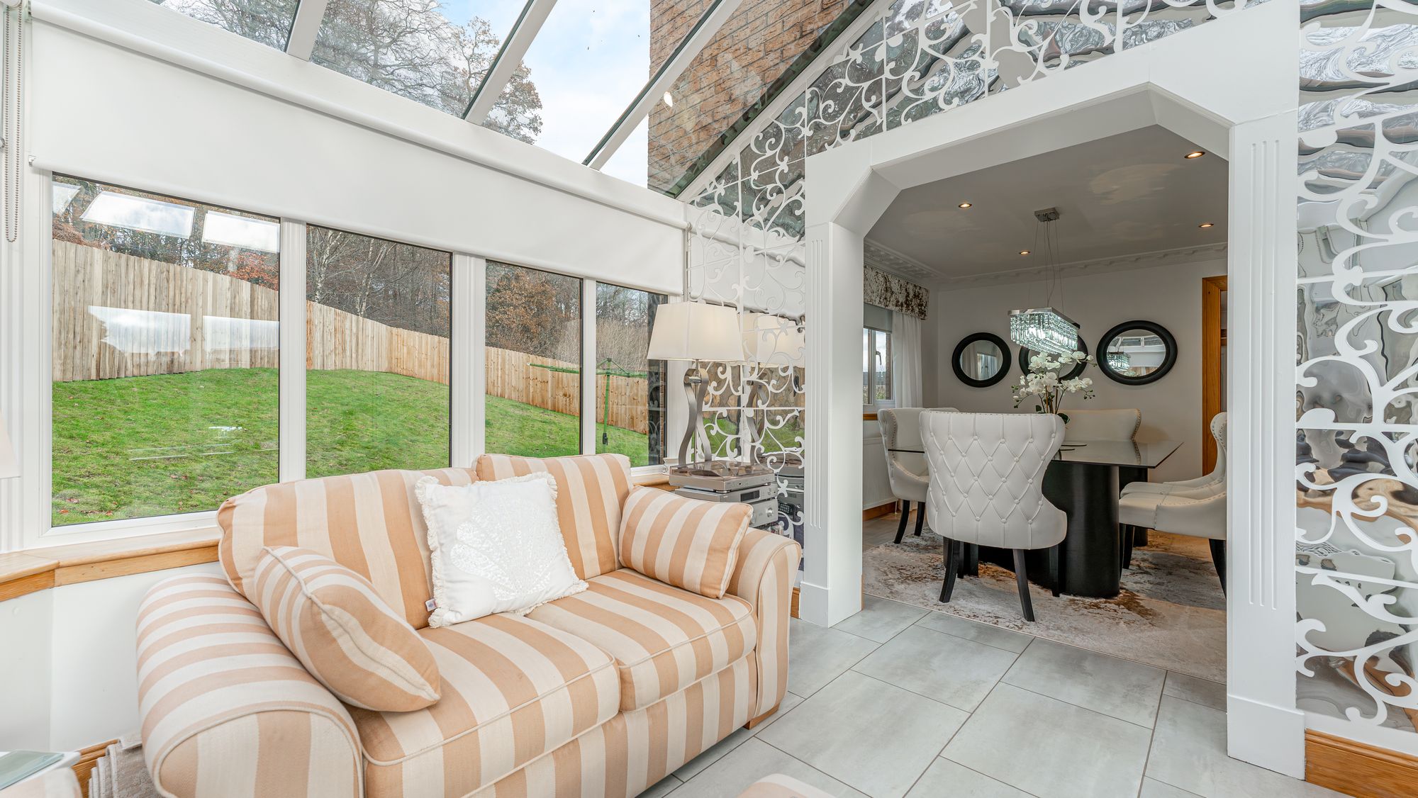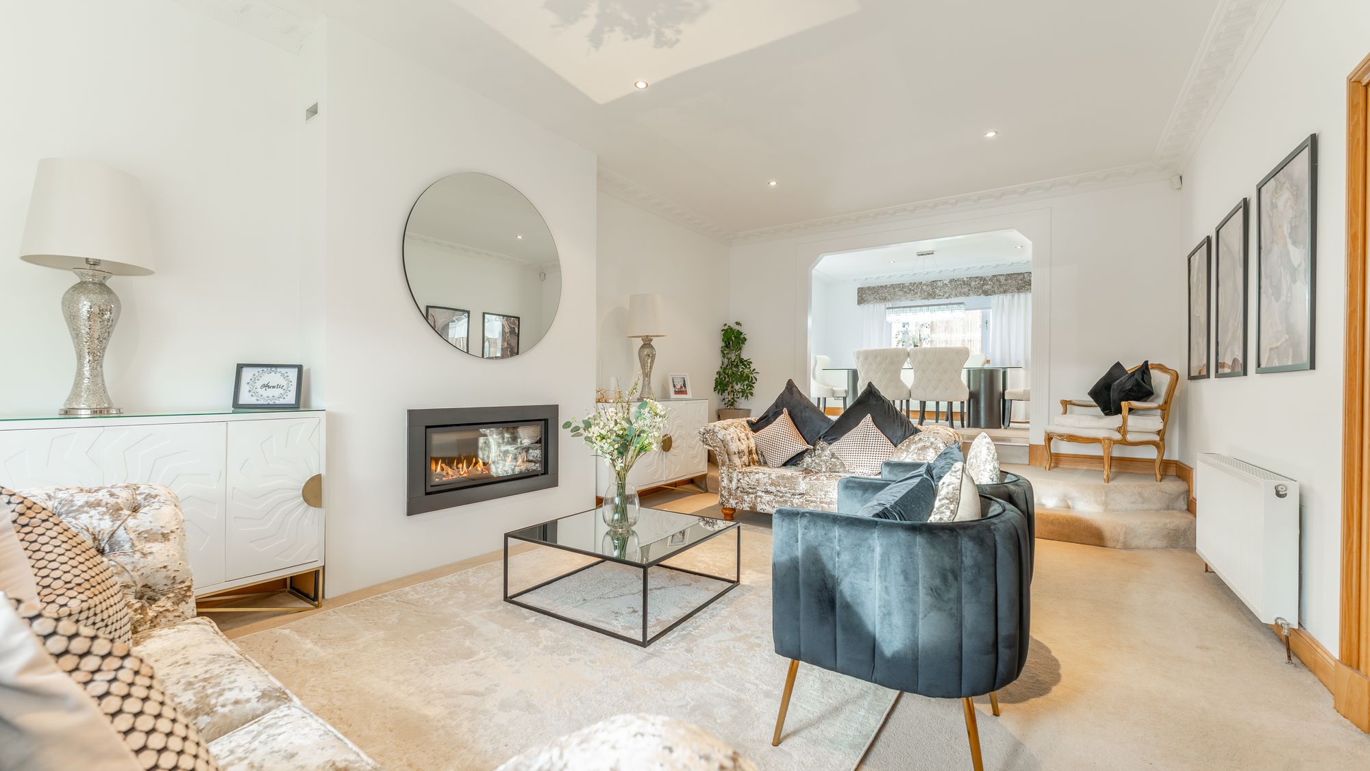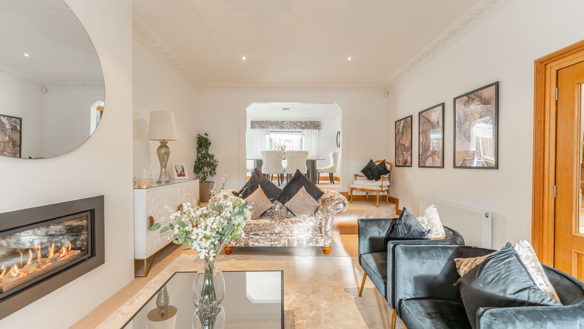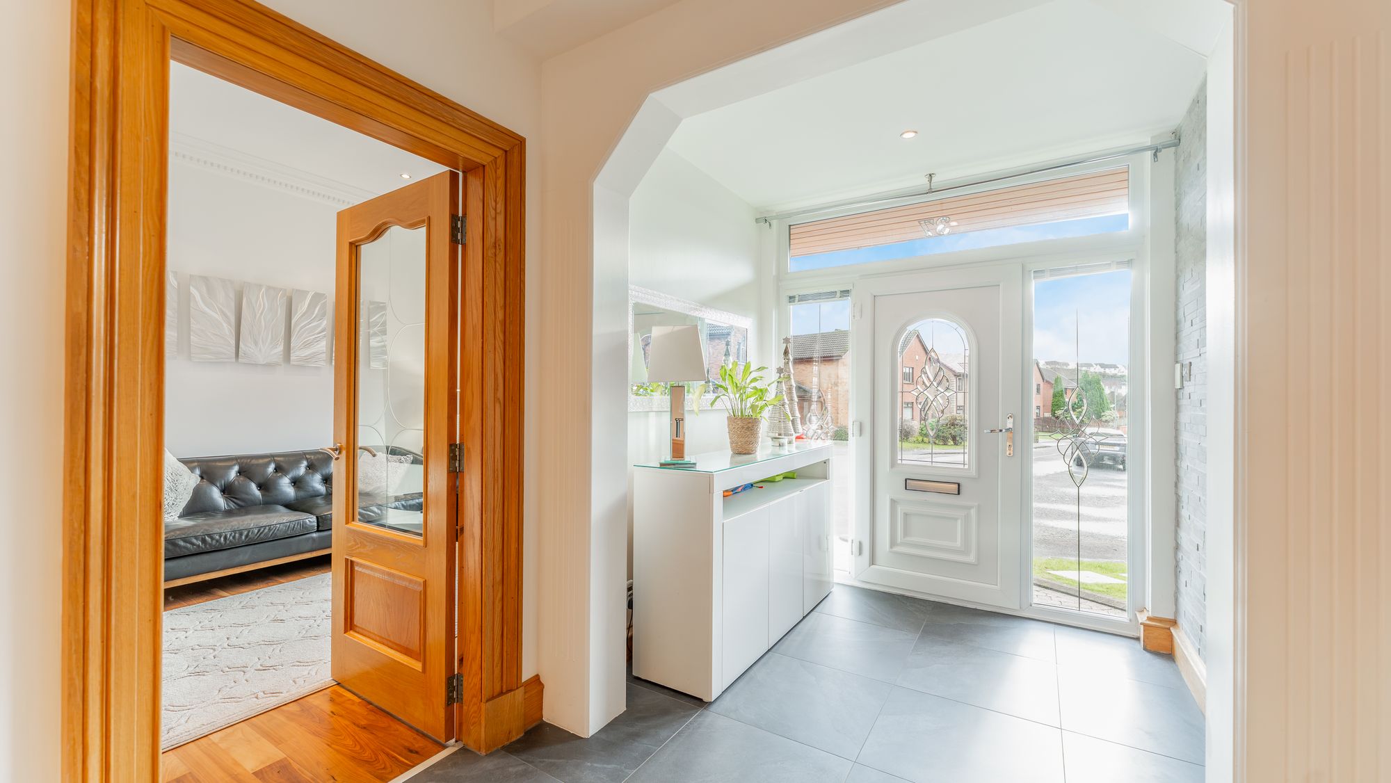Set within a highly desirable residential area of Kilsyth, this impressive four/five bedroom detached home combines generous proportions, contemporary style, and modern comfort, making it ideal for family living. The welcoming reception hall leads to a beautifully presented bay windowed lounge filled with natural light and featuring a living flame gas fire. This space flows seamlessly into the dining room, which in turn opens into a bright and airy sunroom with direct access to the rear garden. The property also boasts a stunning fitted kitchen with sleek white gloss cabinetry complemented by walnut finishes, a convenient breakfast bar, Silestone sink and worktops, and a range of integrated appliances. Off the hallway, there is an additional lounge offering flexible use—ideal as a fifth bedroom or home office—while a utility room and a fully tiled downstairs WC complete the ground floor.