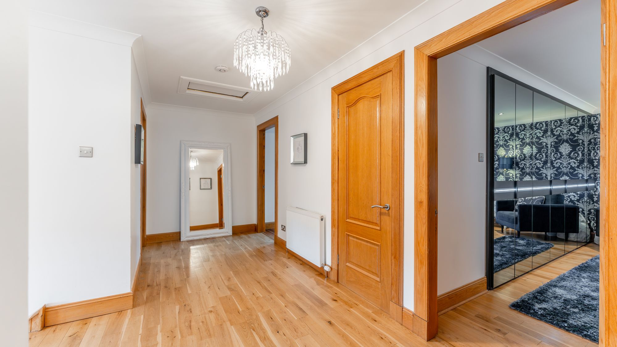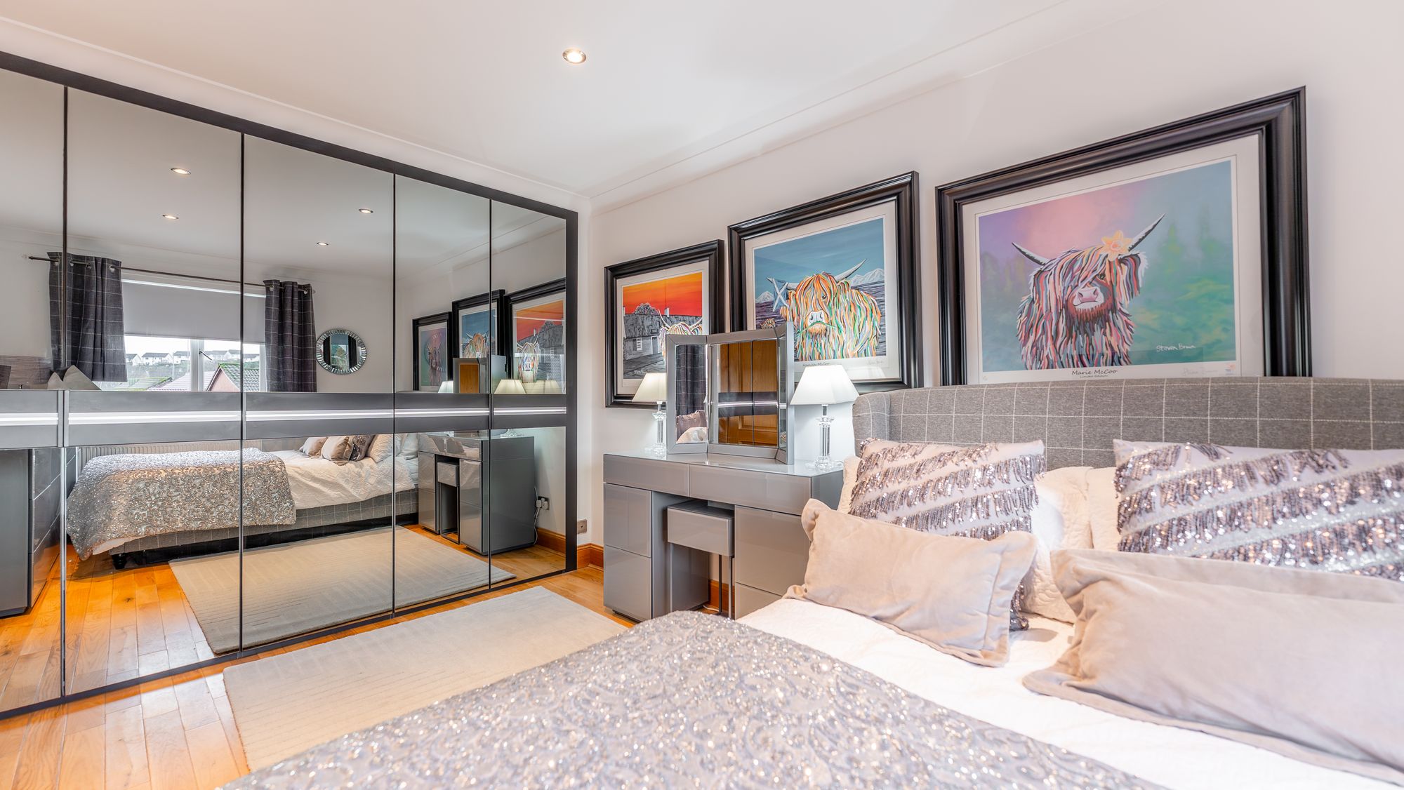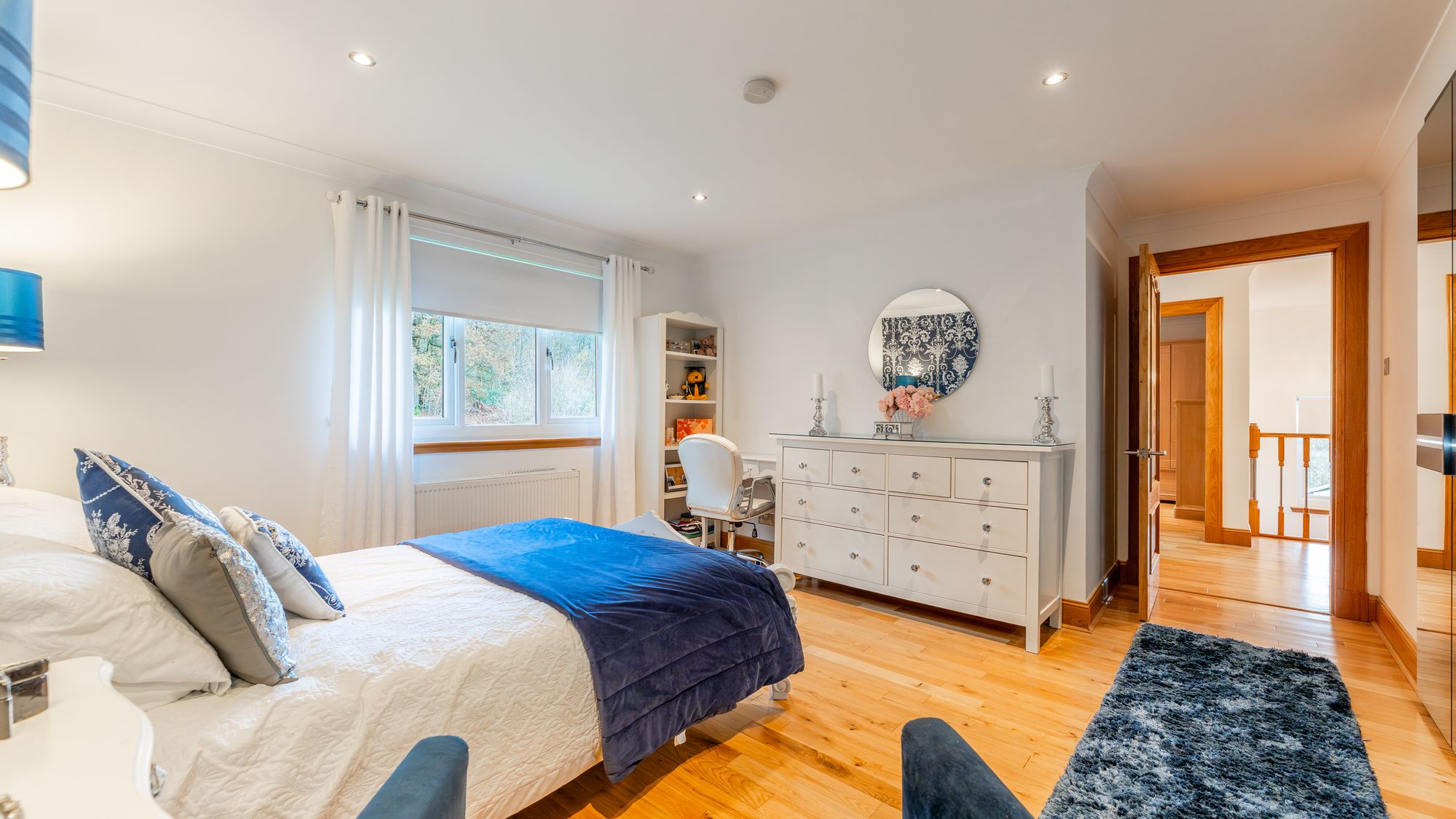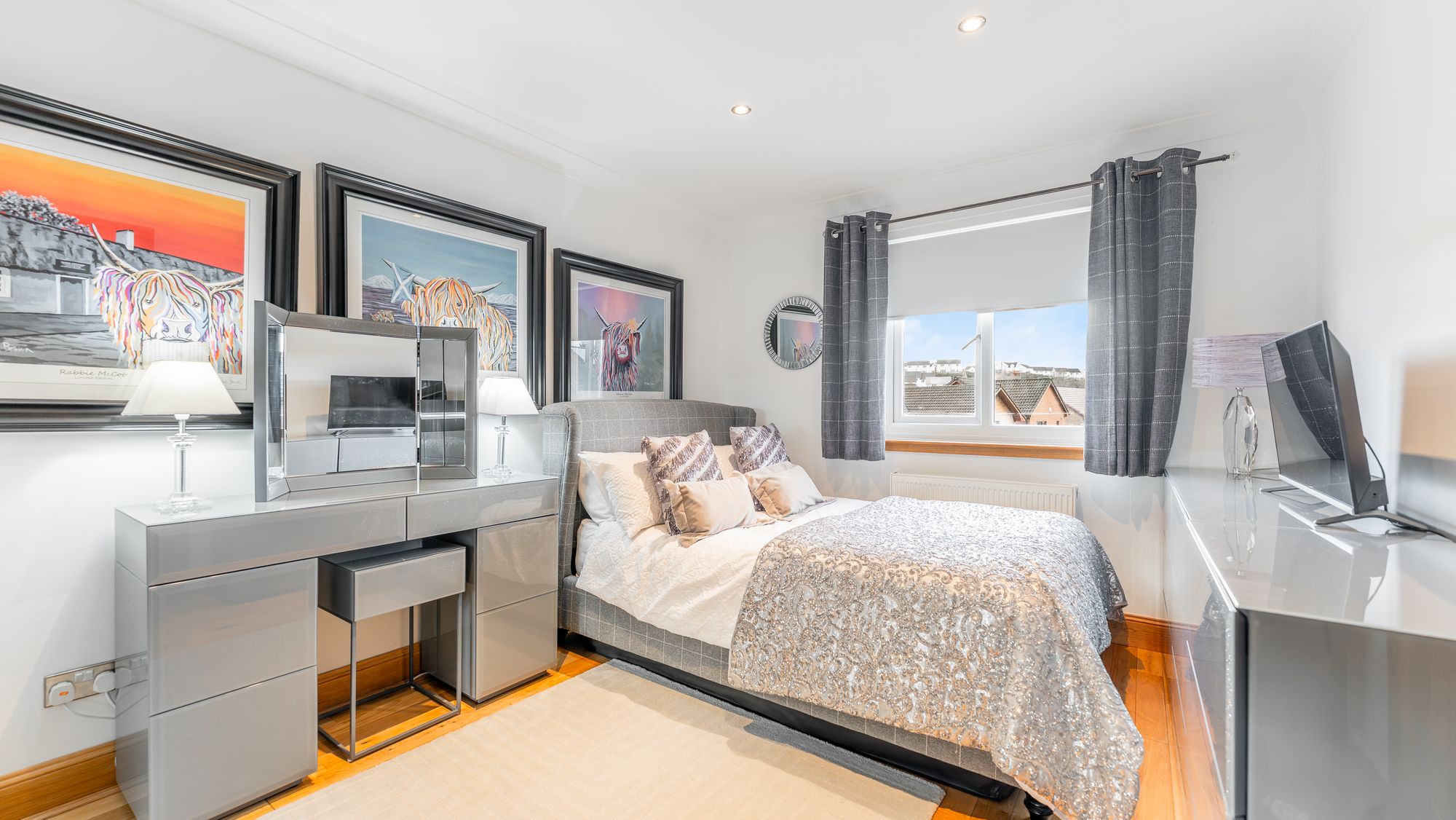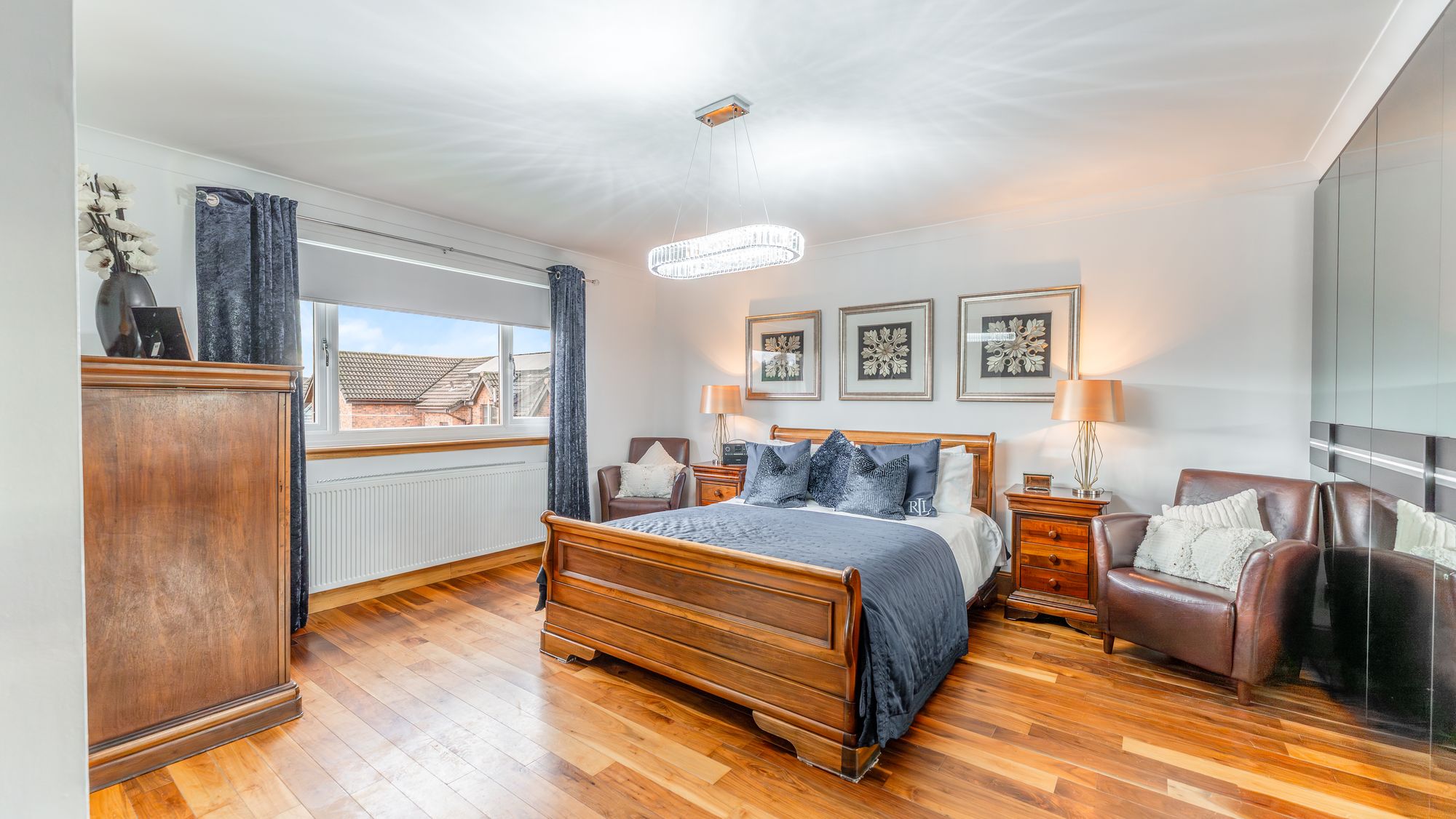 Set within a highly desirable residential area of Kilsyth, this impressive four/five bedroom detached home combines generous proportions, contemporary style, and modern comfort, making it ideal for family living. The welcoming reception hall leads to a beautifully presented bay windowed lounge filled with natural light and featuring a living flame gas fire. This space flows seamlessly into the dining room, which in turn opens into a bright and airy sunroom with direct access to the rear garden. The property also boasts a stunning fitted kitchen with sleek white gloss cabinetry complemented by walnut finishes, a convenient breakfast bar, Silestone sink and worktops, and a range of integrated appliances. Off the hallway, there is an additional lounge offering flexible use—ideal as a fifth bedroom or home office—while a utility room and a fully tiled downstairs WC complete the ground floor.