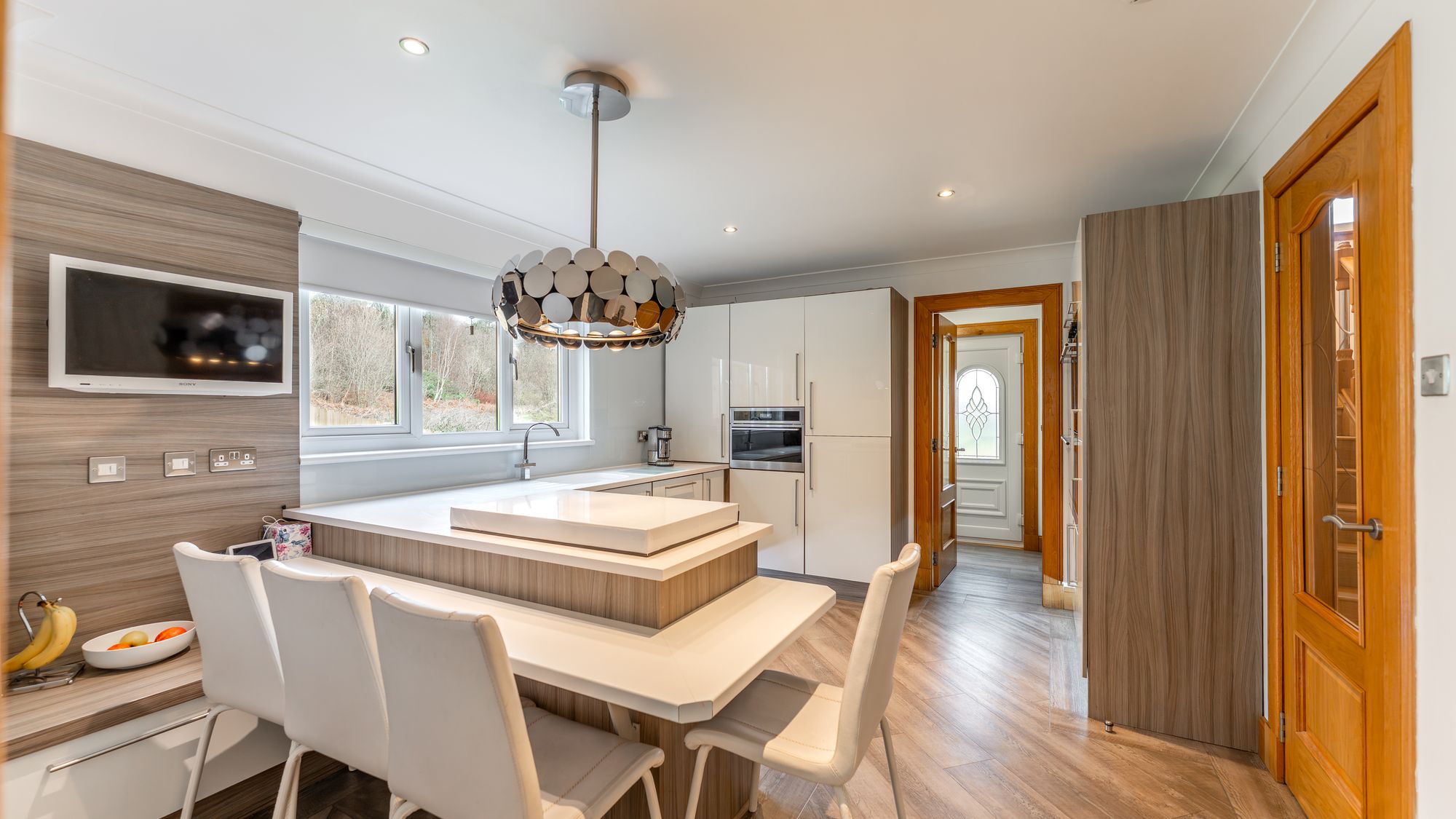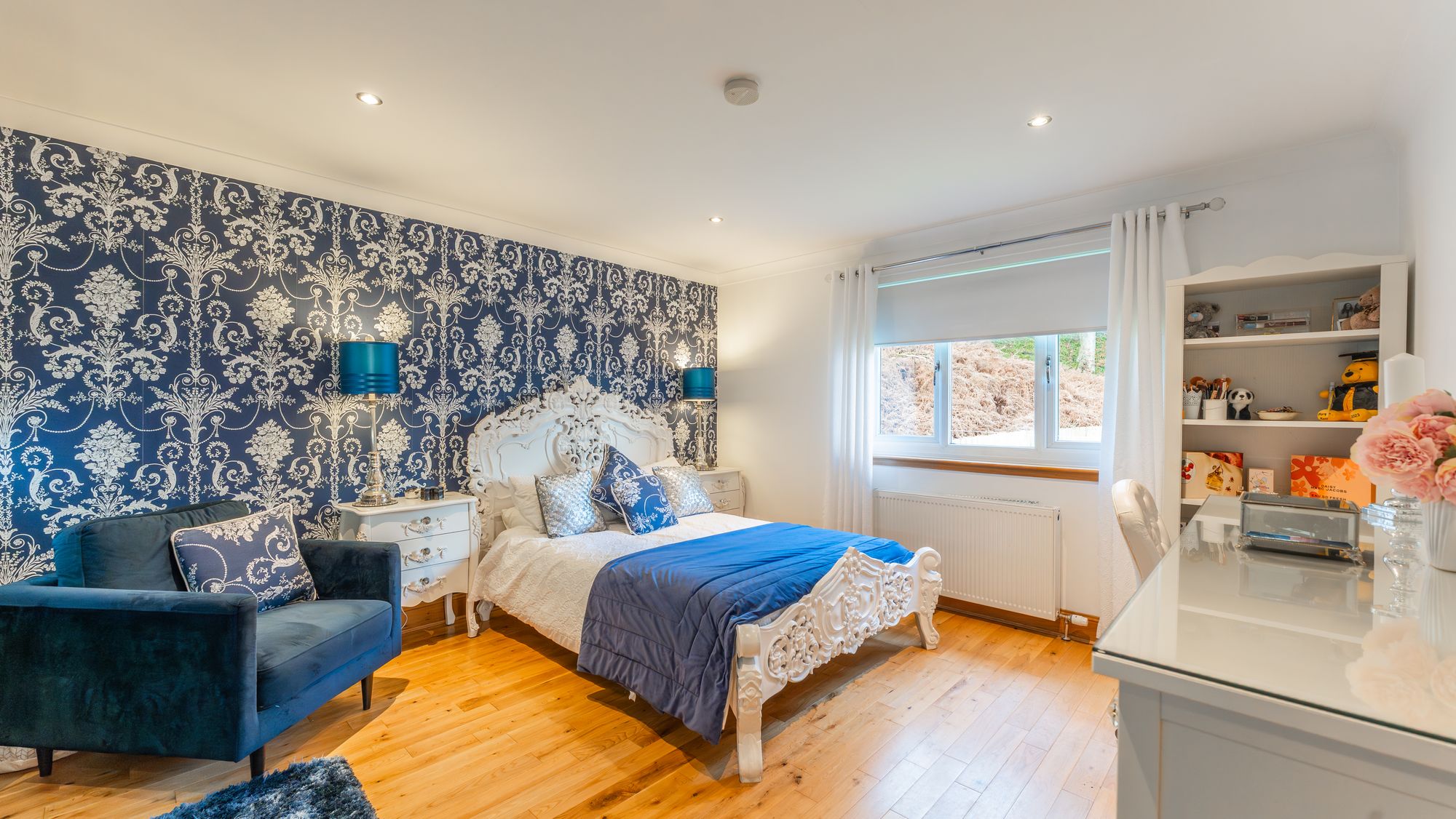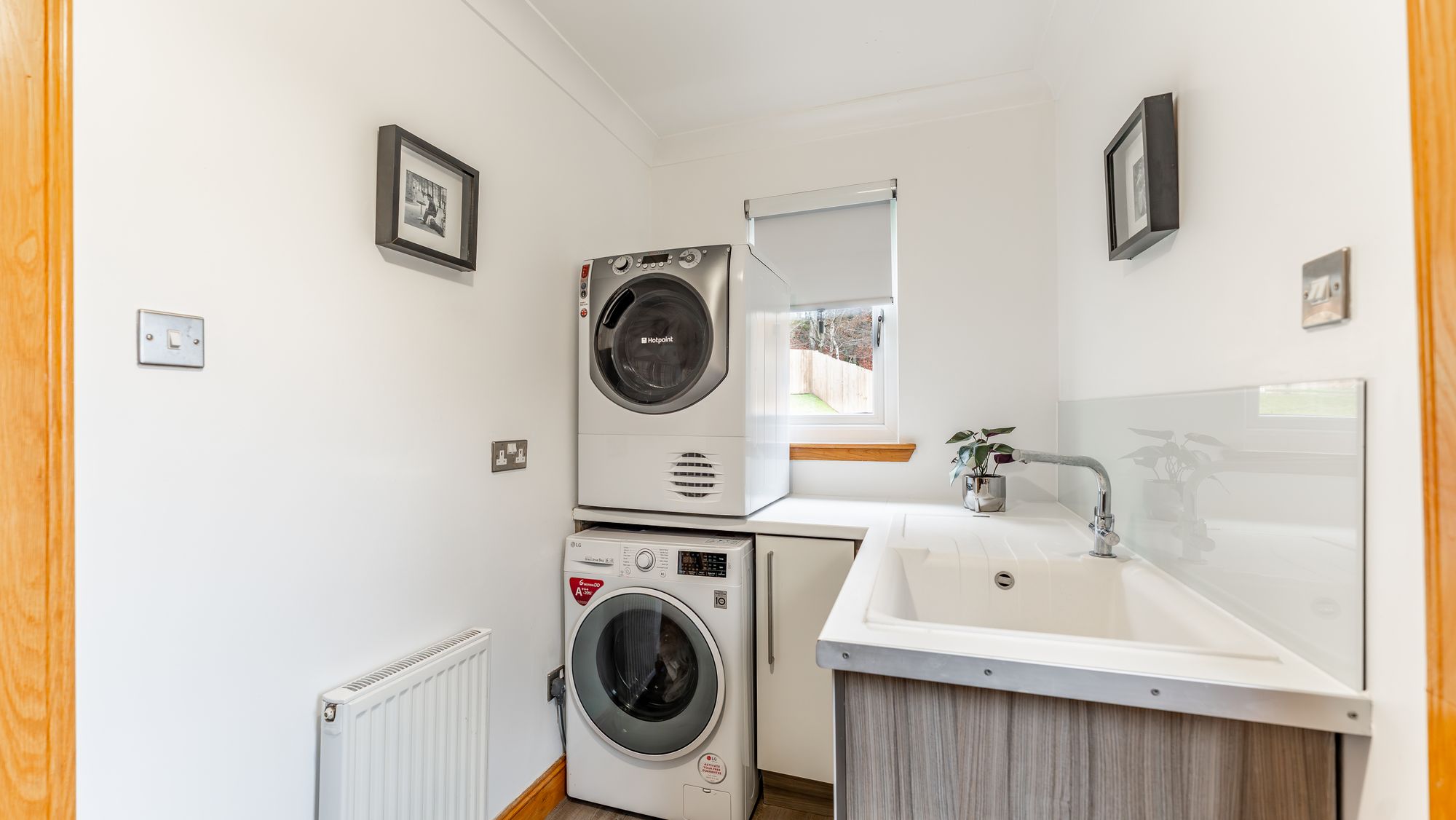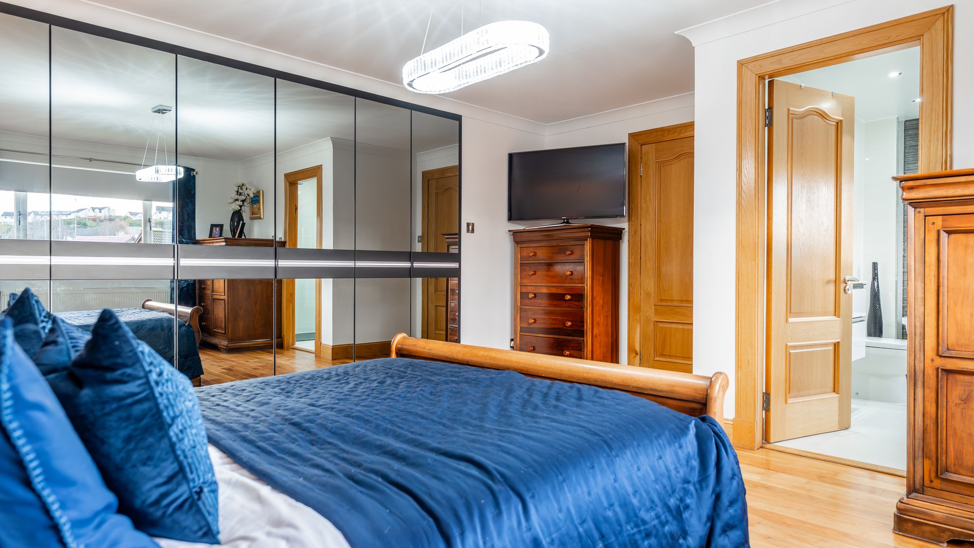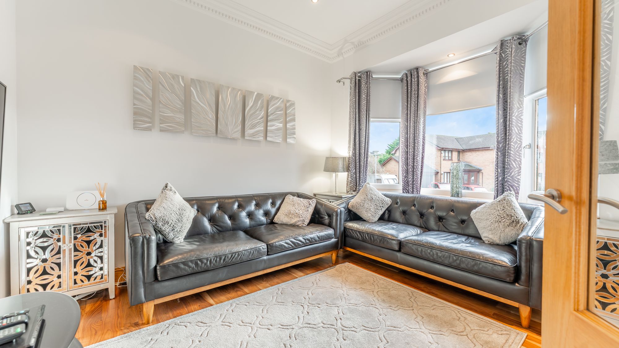 Set within a highly desirable residential area of Kilsyth, this impressive four/five bedroom detached home combines generous proportions, contemporary style, and modern comfort, making it ideal for family living. The welcoming reception hall leads to a beautifully presented bay windowed lounge filled with natural light and featuring a living flame gas fire. This space flows seamlessly into the dining room, which in turn opens into a bright and airy sunroom with direct access to the rear garden. The property also boasts a stunning fitted kitchen with sleek white gloss cabinetry complemented by walnut finishes, a convenient breakfast bar, Silestone sink and worktops, and a range of integrated appliances. Off the hallway, there is an additional lounge offering flexible use—ideal as a fifth bedroom or home office—while a utility room and a fully tiled downstairs WC complete the ground floor.