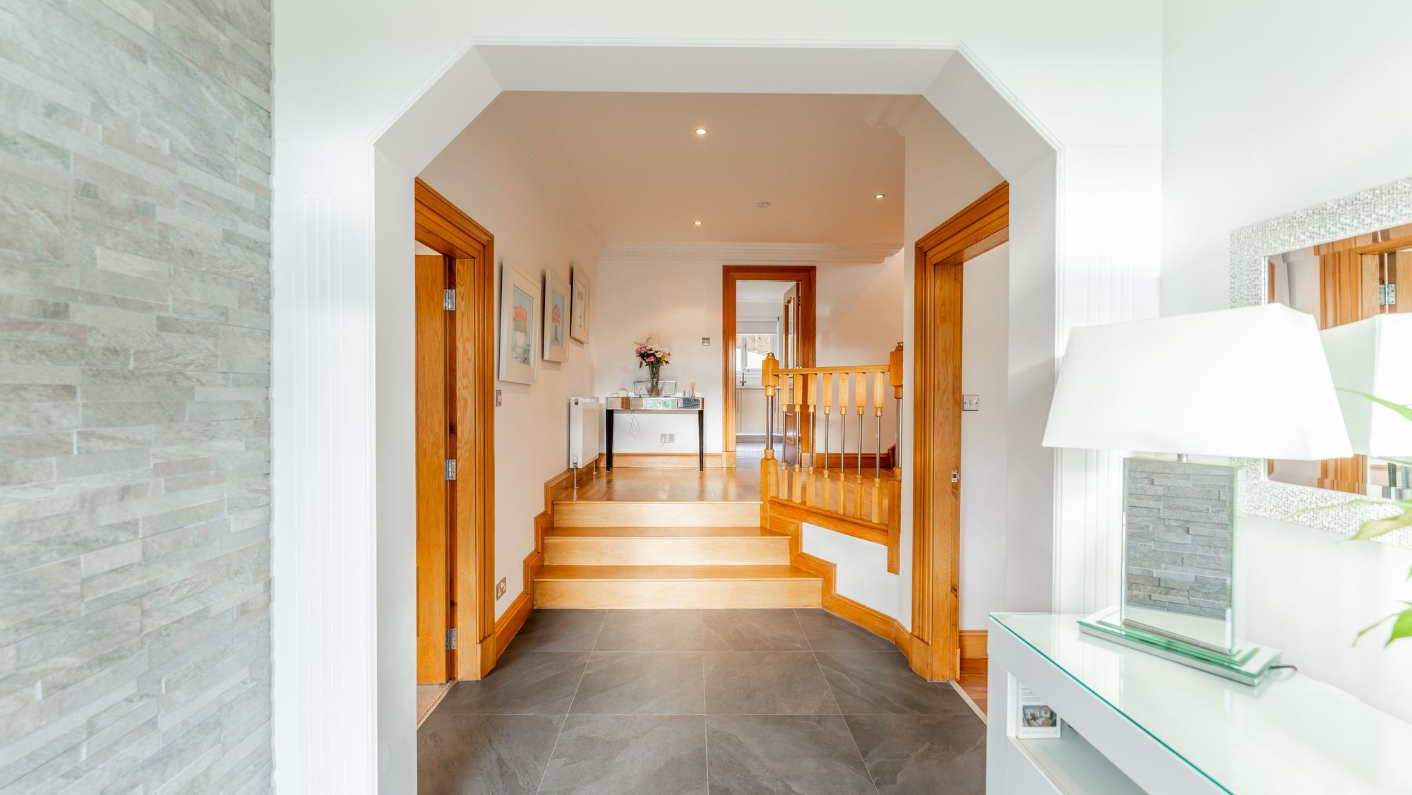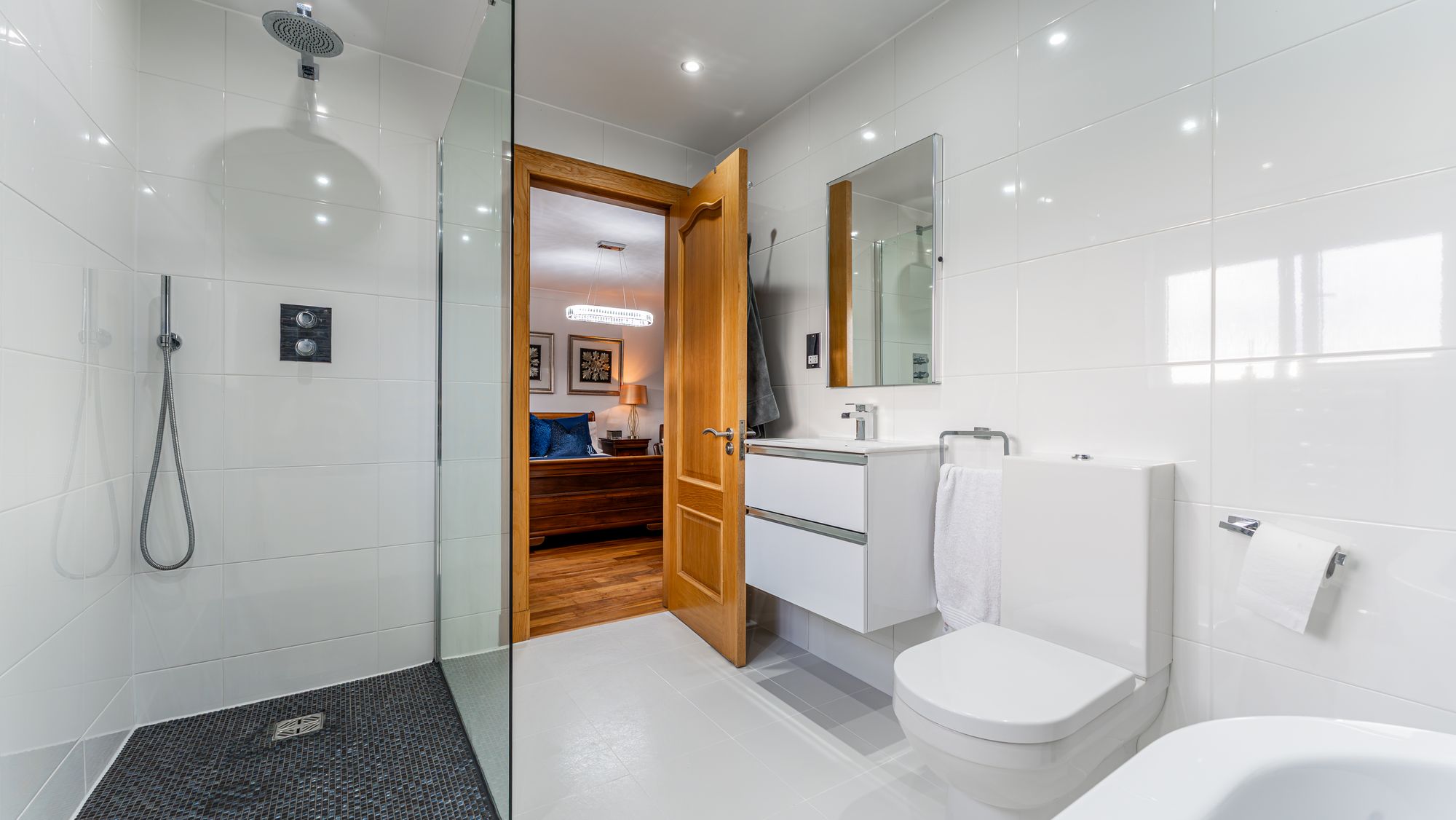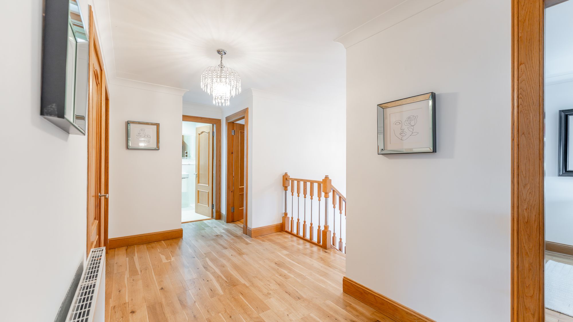 Upstairs, the elegant landing leads to four well-proportioned bedrooms. The principal bedroom features luxury fitted wardrobes and a sumptuous en-suite shower room complete with a walk-in shower and freestanding bath. The remaining bedrooms are served by a beautifully designed, fully tiled family bathroom, both bathrooms by Porcelanosa, featuring a stylish four-piece white suite.