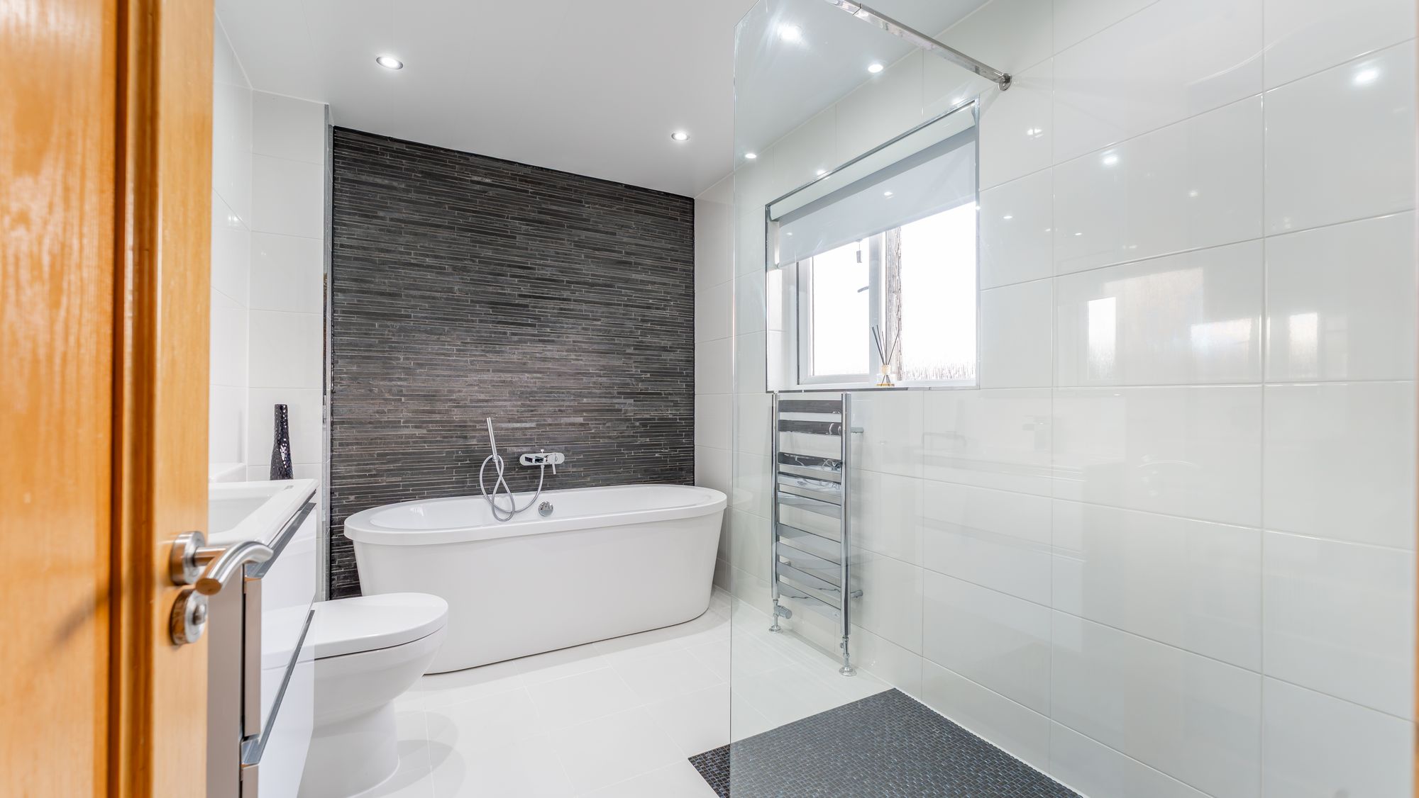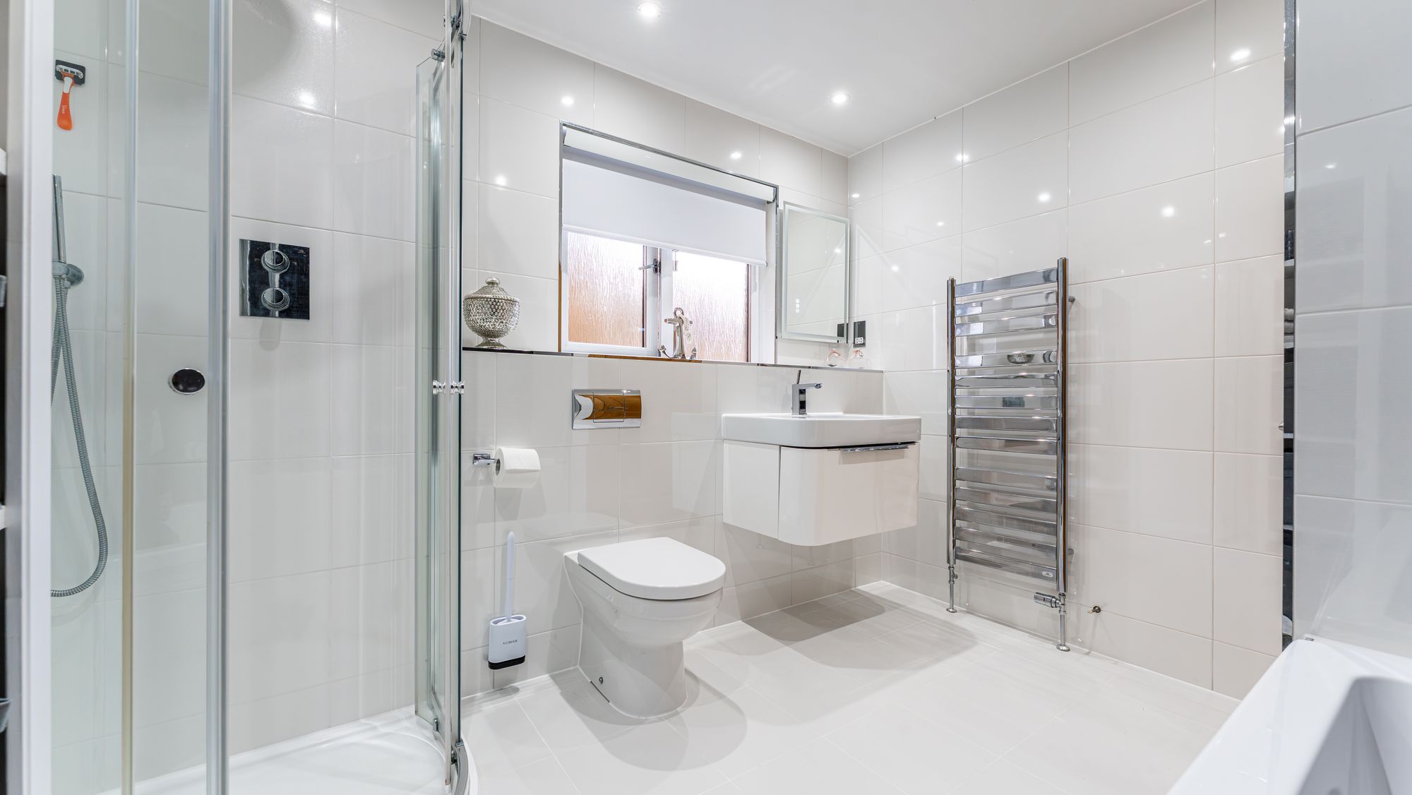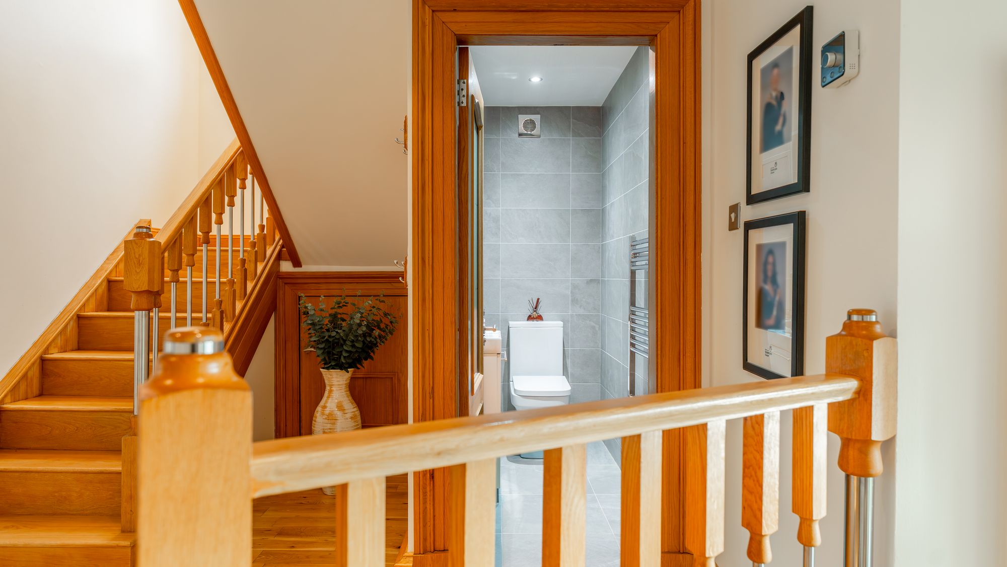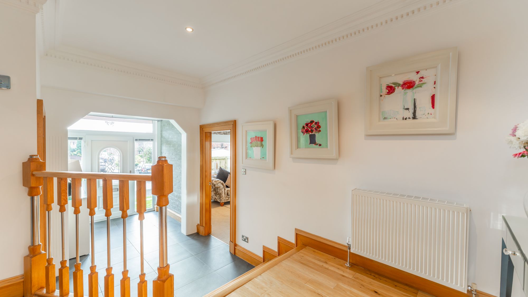 Upstairs, the elegant landing leads to four well-proportioned bedrooms. The principal bedroom features luxury fitted wardrobes and a sumptuous en-suite shower room complete with a walk-in shower and freestanding bath. The remaining bedrooms are served by a beautifully designed, fully tiled family bathroom, both bathrooms by Porcelanosa, featuring a stylish four-piece white suite.