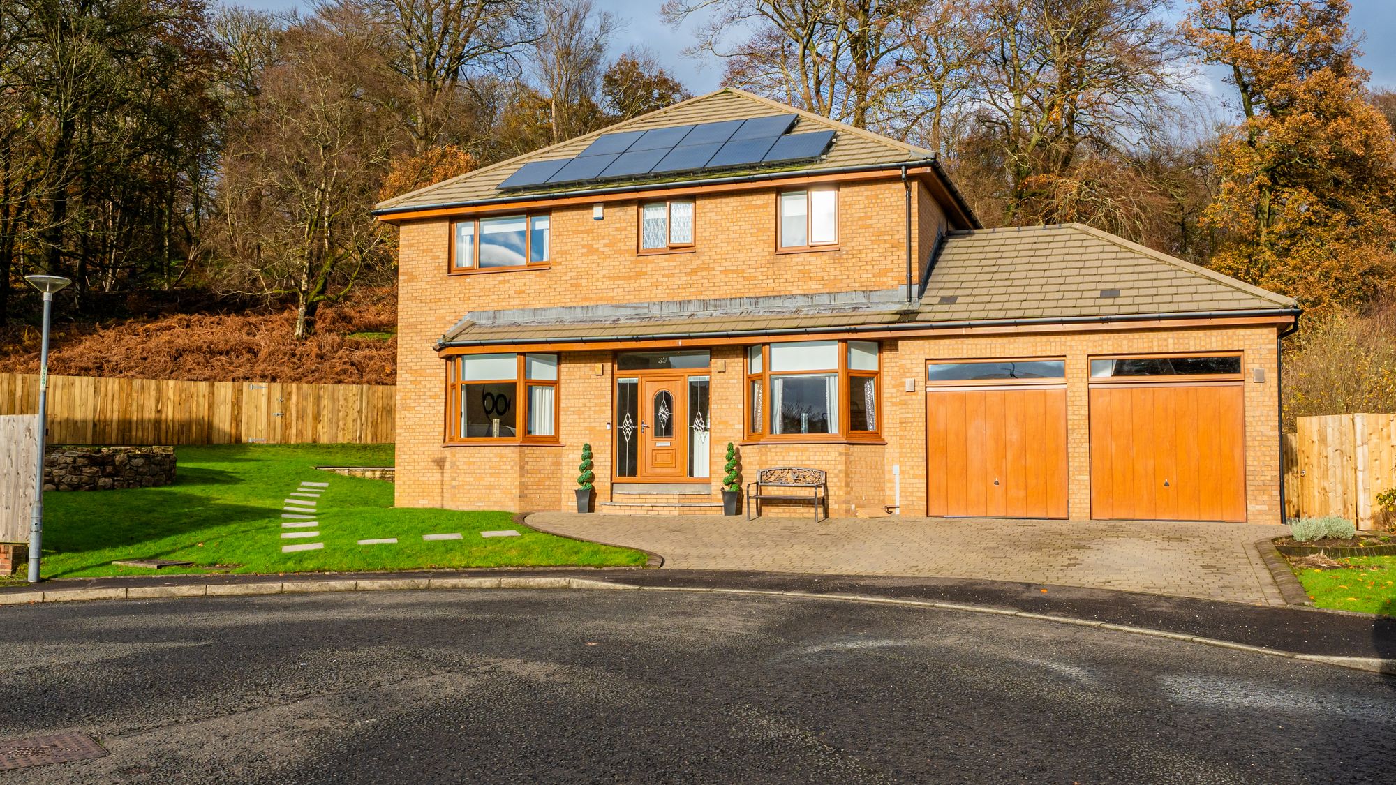 Externally, the property enjoys a substantial enclosed rear garden bordered by woodland, providing privacy and an ideal setting for outdoor entertaining, with two large patio areas offering ample space for relaxation and al fresco dining. To the front, an expansive driveway offers ample parking and leads to an integral double garage. Further benefits include solar panels, gas central heating, and PVC double glazing, ensuring energy efficiency and year-round comfort.