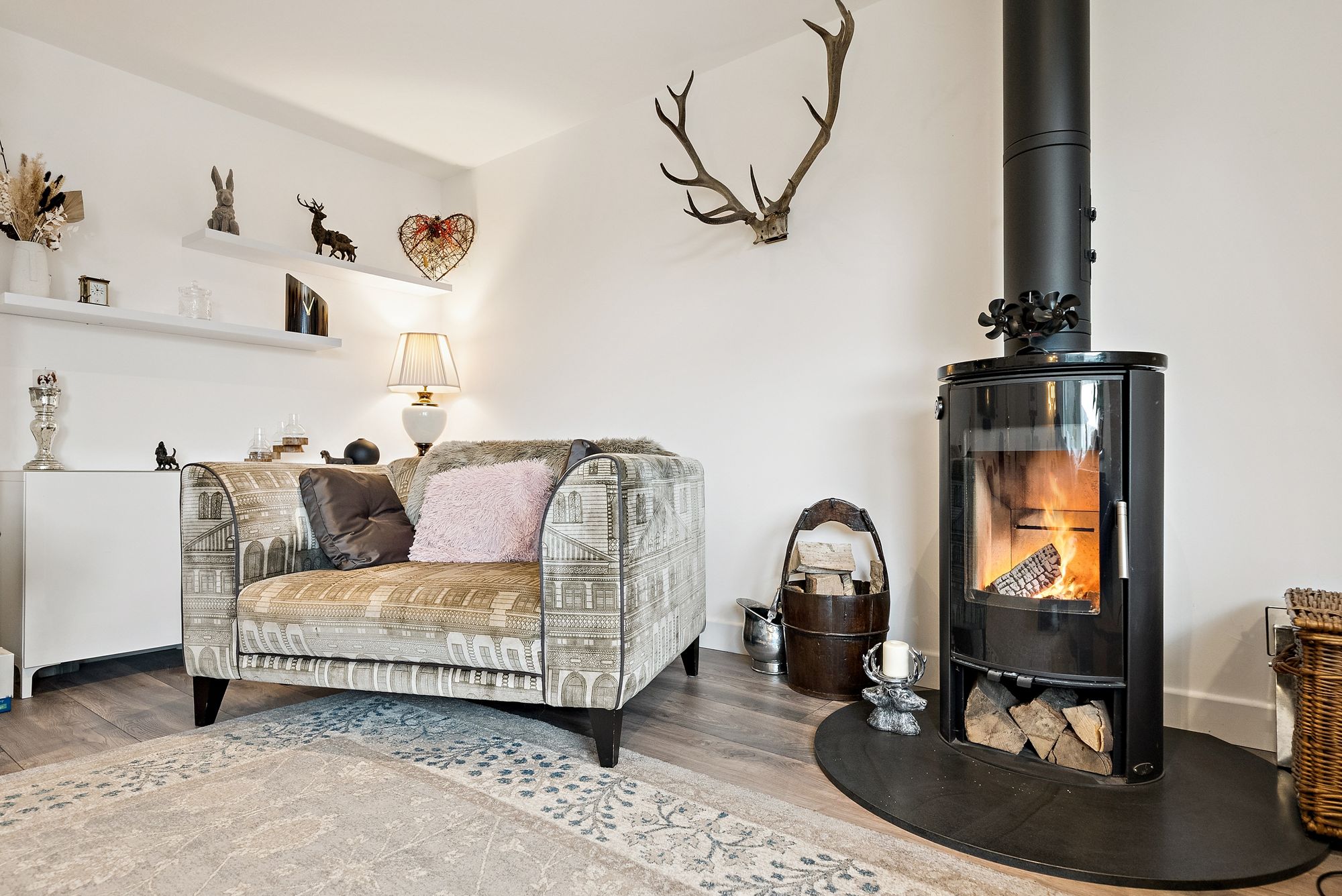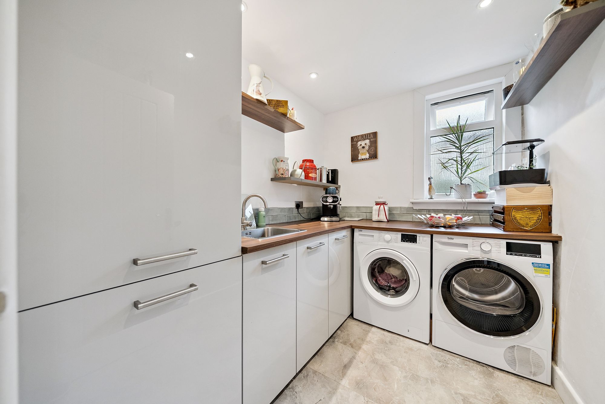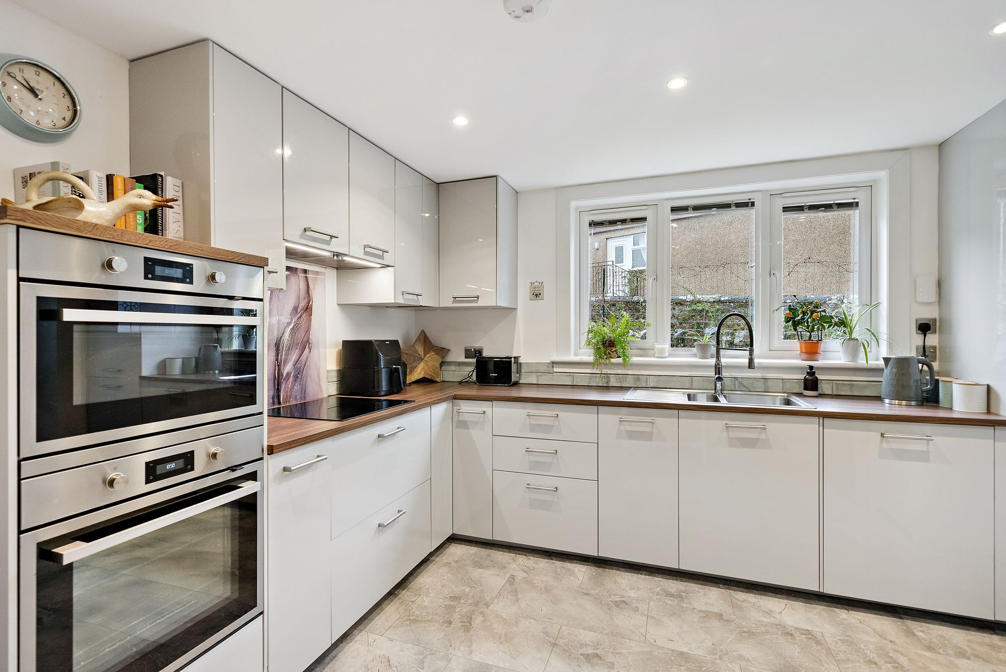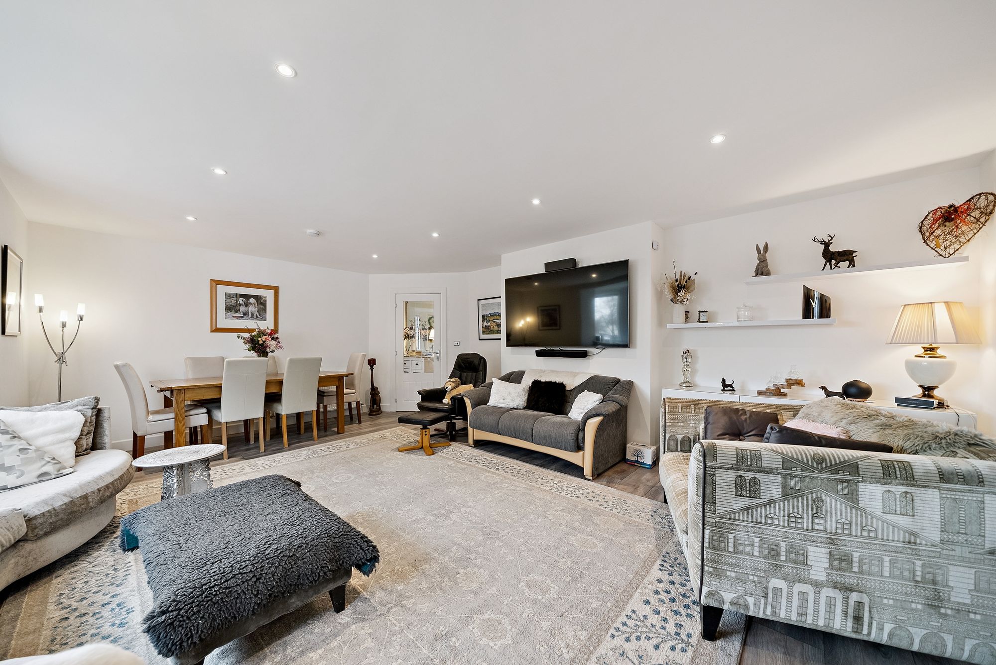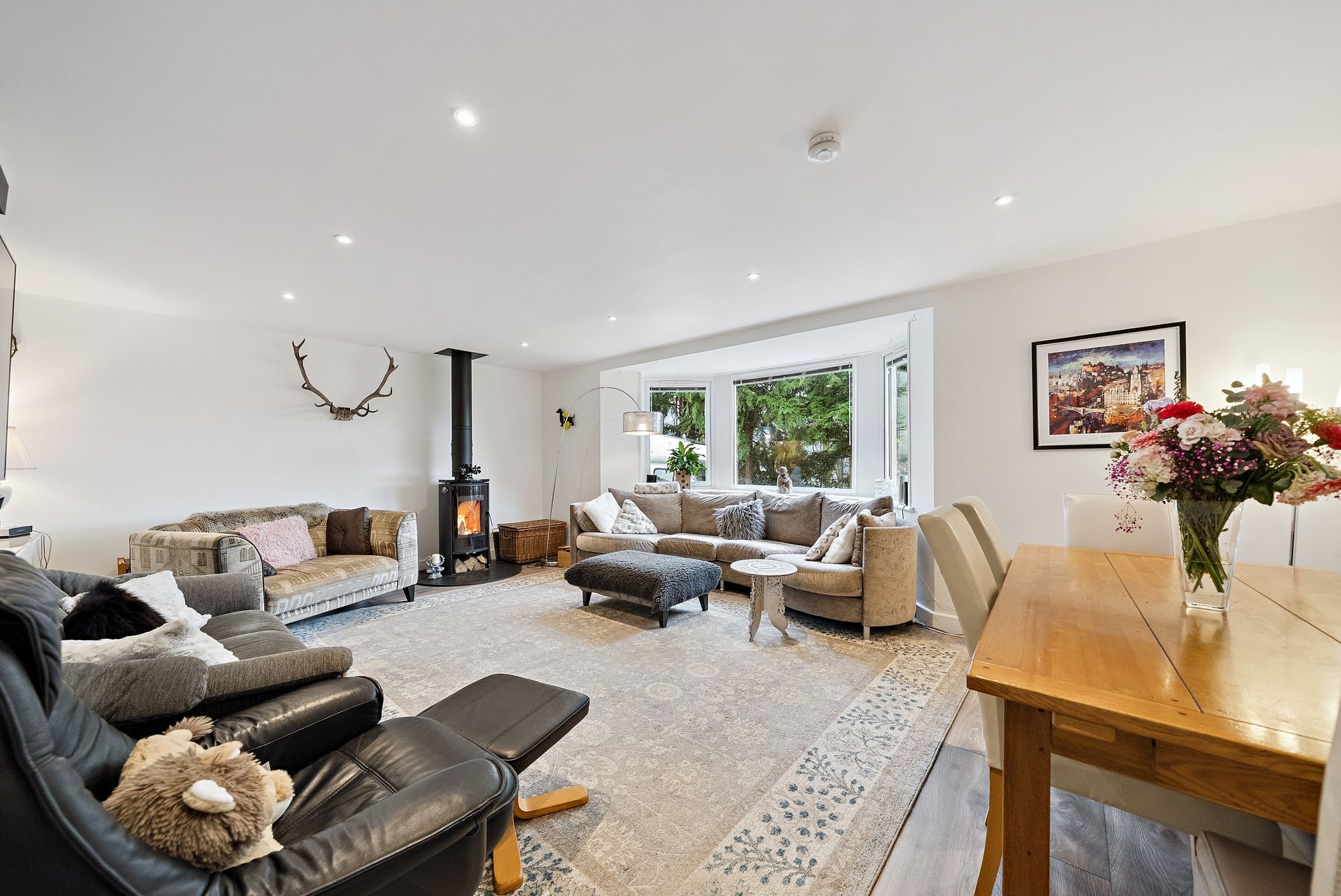 The accommodation on the ground floor is both generous and well-balanced, with a welcoming entrance hall leading through to a spacious lounge that provides a warm and inviting focal point for everyday living, enhanced by a solid fuel burning stove which adds both character and comfort. A separate sitting room offers additional versatility, ideal as a formal lounge, family room or even a further bedroom if required. The contemporary kitchen is thoughtfully designed with sleek units, ample worktop space and room for dining, complemented by a separate utility room for added convenience.