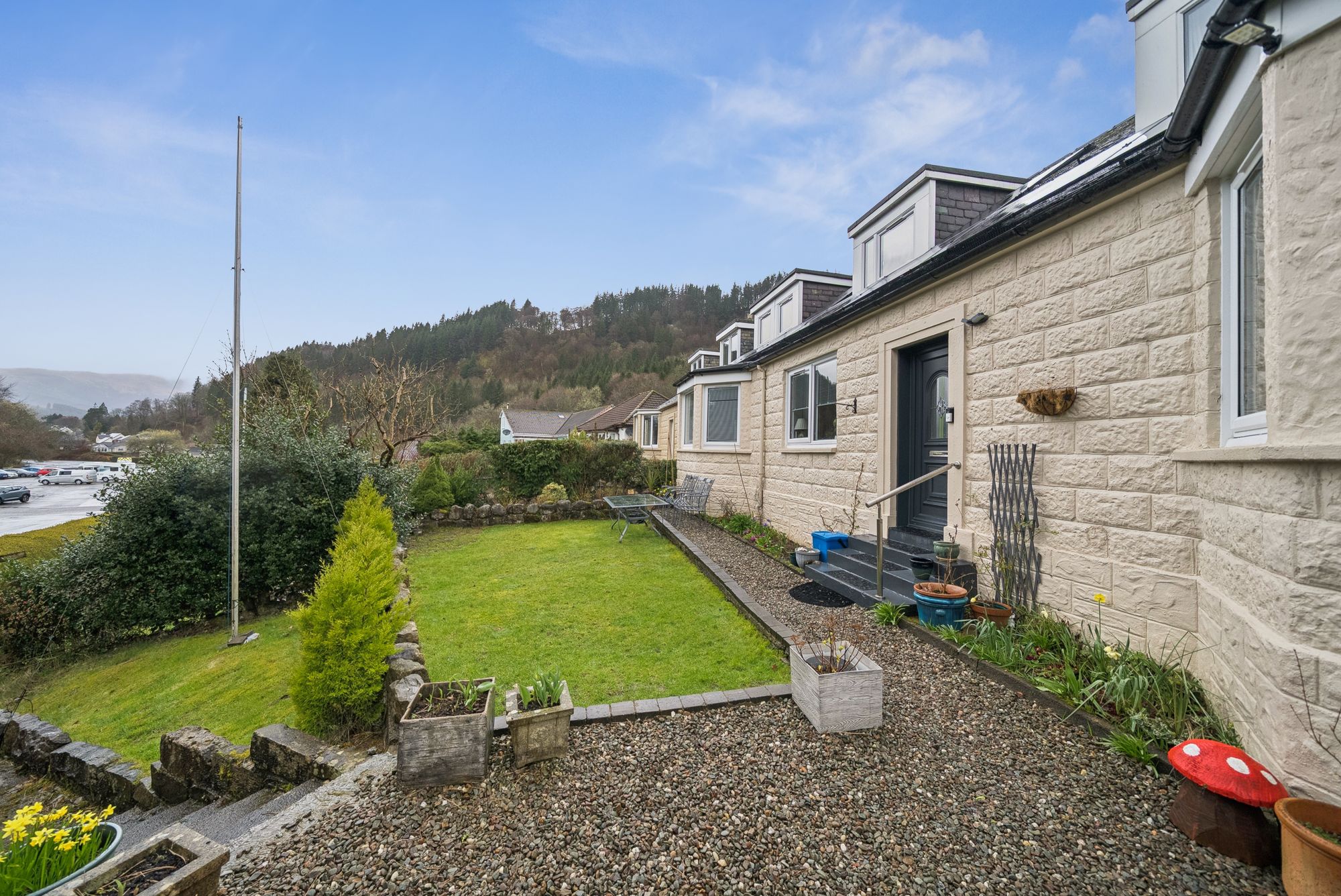 Externally, the property is set within extensive, well stocked garden grounds to the front, side and rear, bounded by attractive stone walls and retaining features that provide both character and privacy. The gardens offer excellent outdoor space for a variety of uses, while a private driveway to the side of the property provides convenient off-street parking.