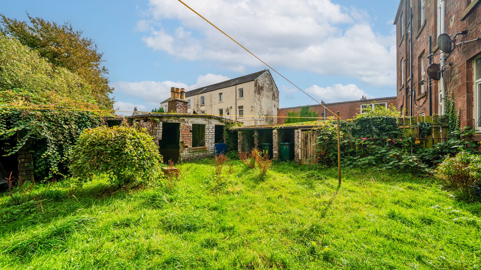 The building is set hard to the pavement at the front and accessed via a communal close and staircase. To the rear, residents enjoy use of a shared, lawned back court with timber fencing and defined boundaries. A row of brick-built garden stores provides useful outdoor storage.
