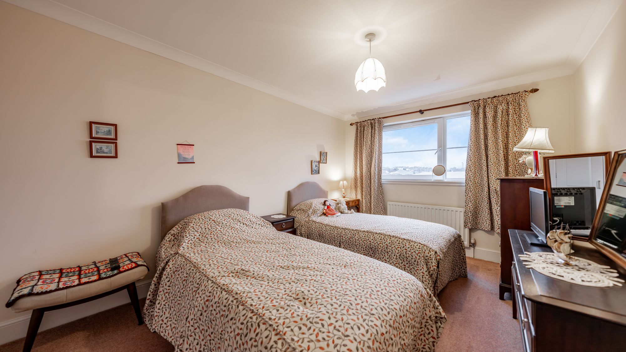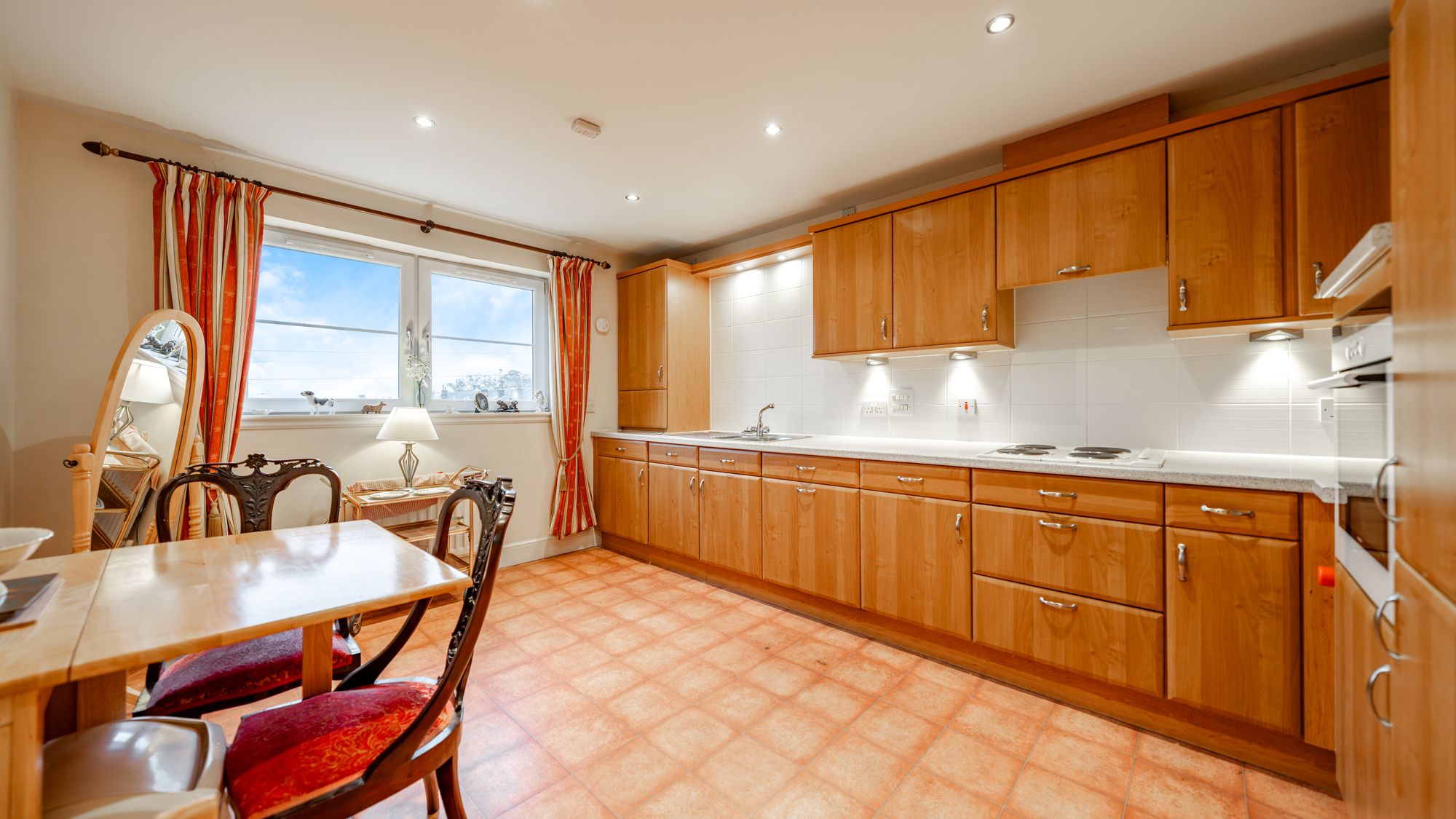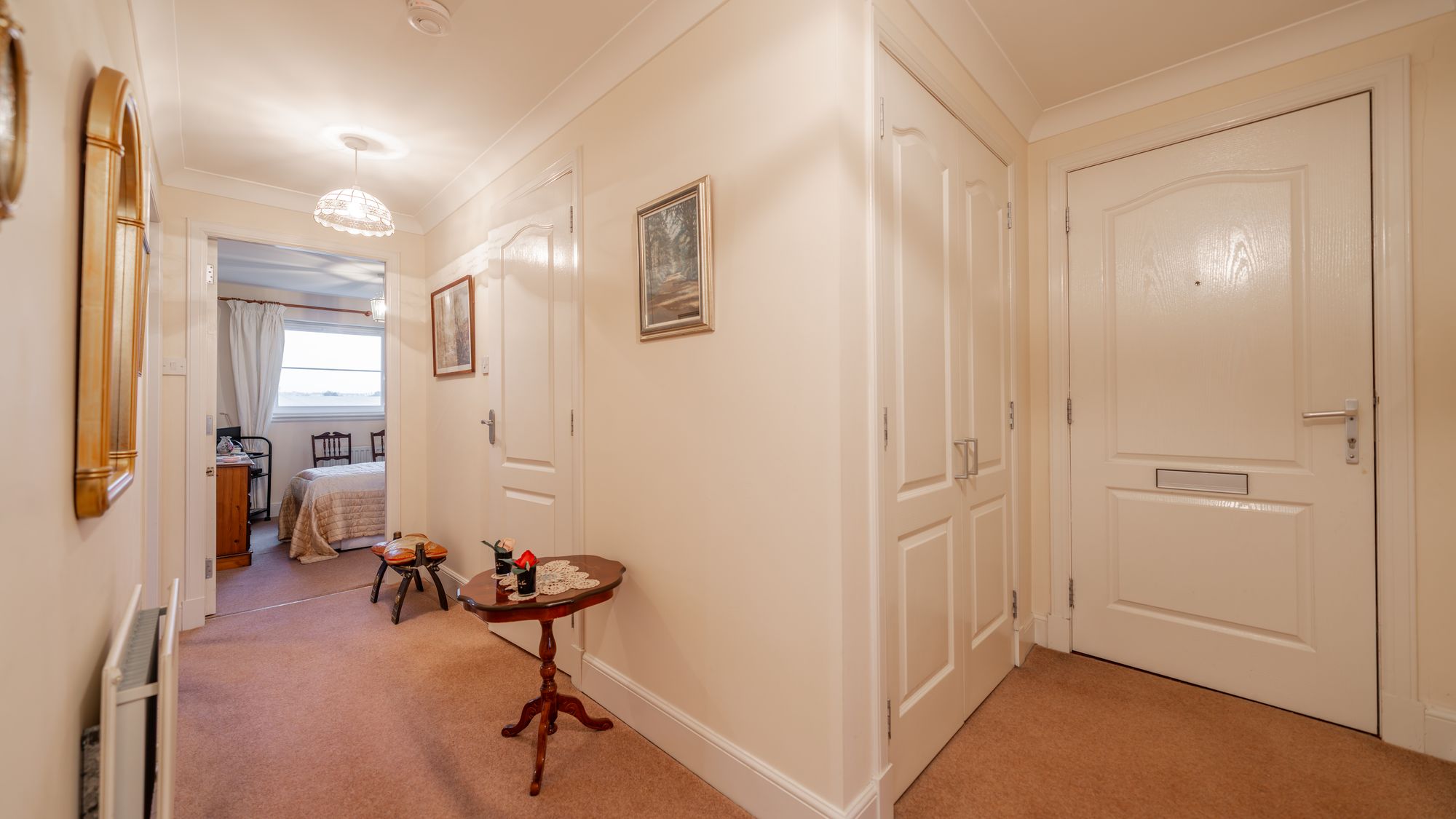 Accessed via a carpeted and secure residents’ stairwell, the accommodation extends to a bright and welcoming reception hallway with two generous storage cupboards. From here, you are led into a wonderfully expansive lounge decorated in neutral tones, the generously sized dining kitchen is well-equipped with a range of modern units and integrated appliances. The master bedroom is impressively proportioned and benefits from built-in wardrobes and a contemporary en suite shower room. A second double bedroom, also with fitted wardrobes, is quietly situated also to the rear. Completing the internal layout is a well-appointed main bathroom featuring a three-piece suite with shower over bath.
