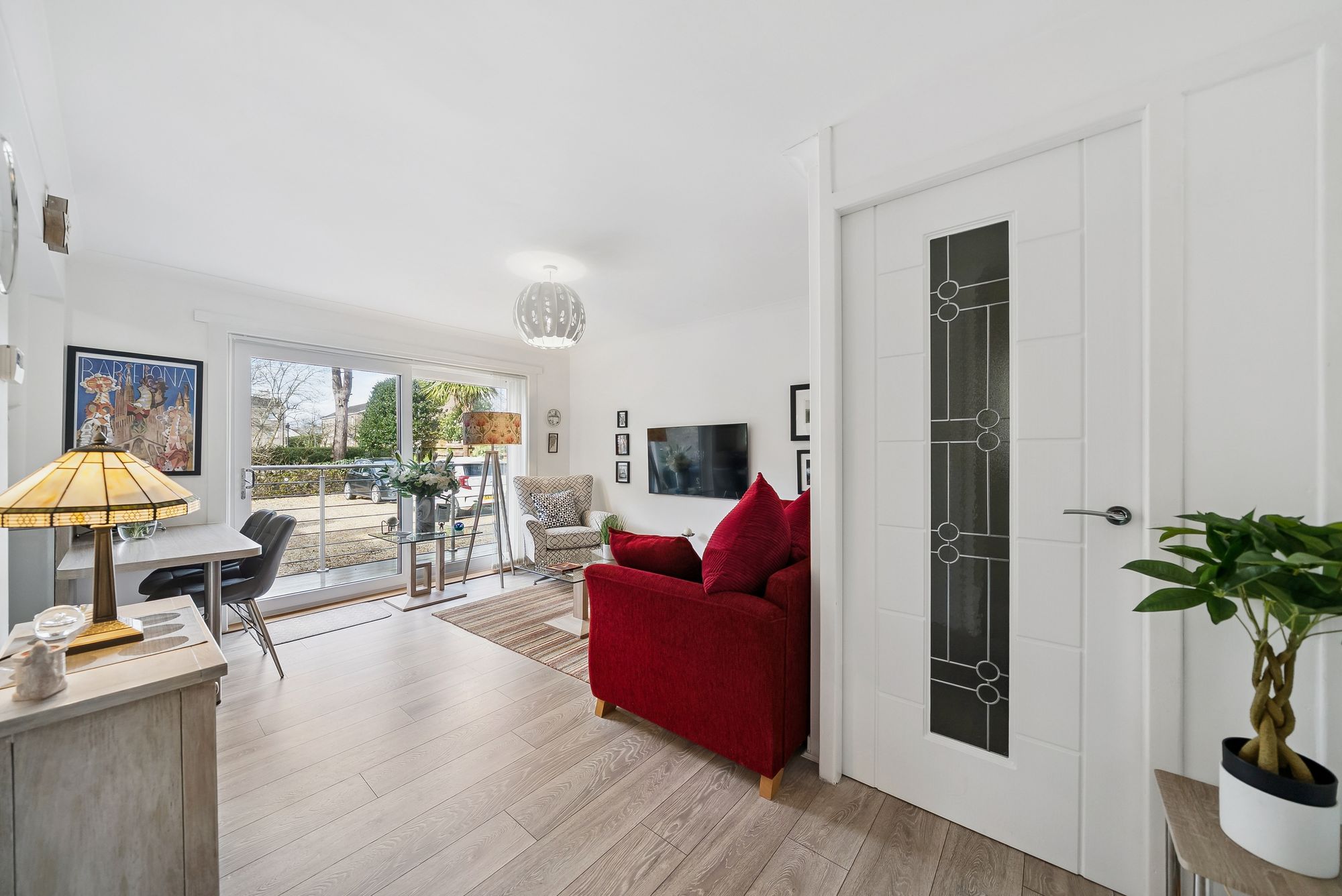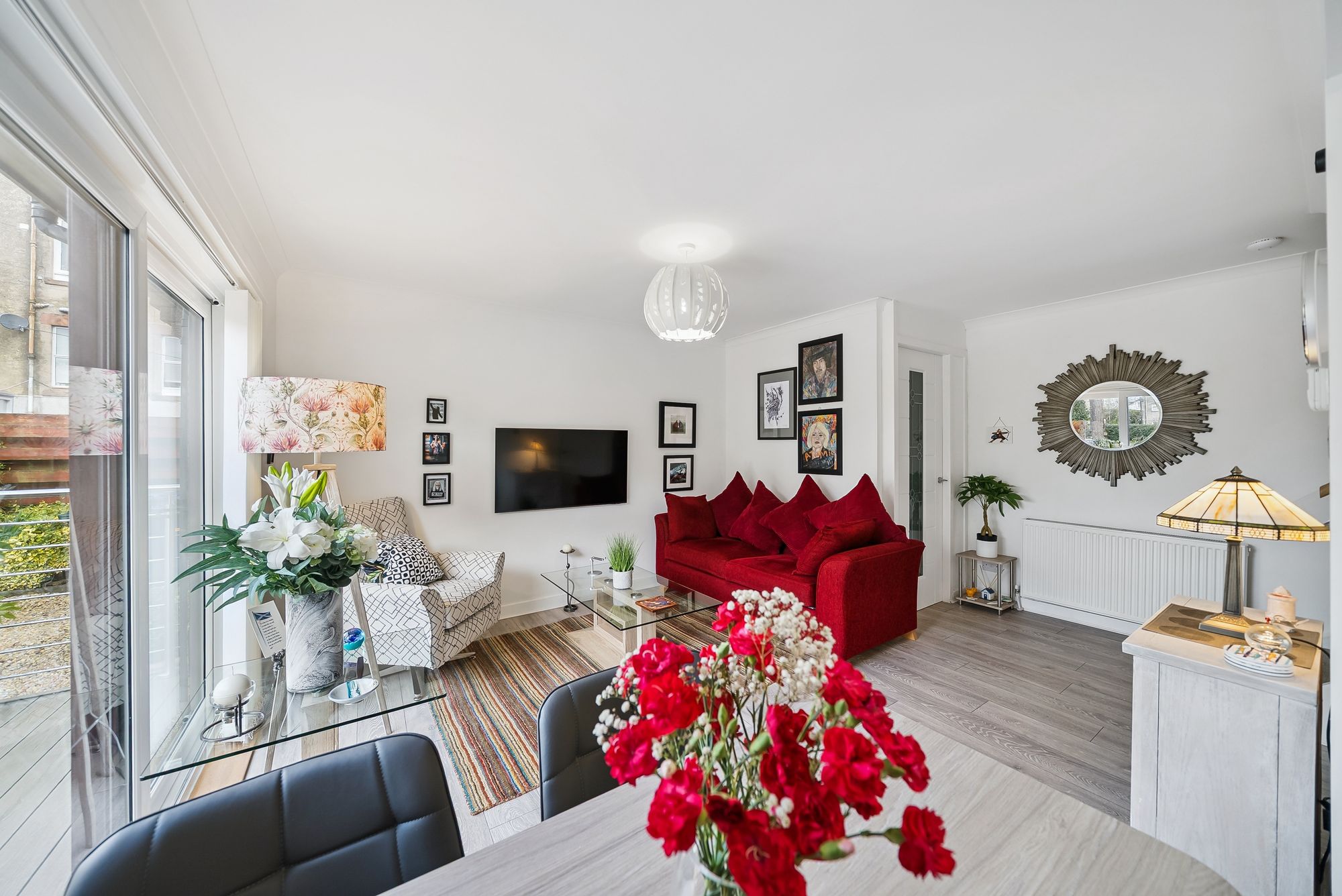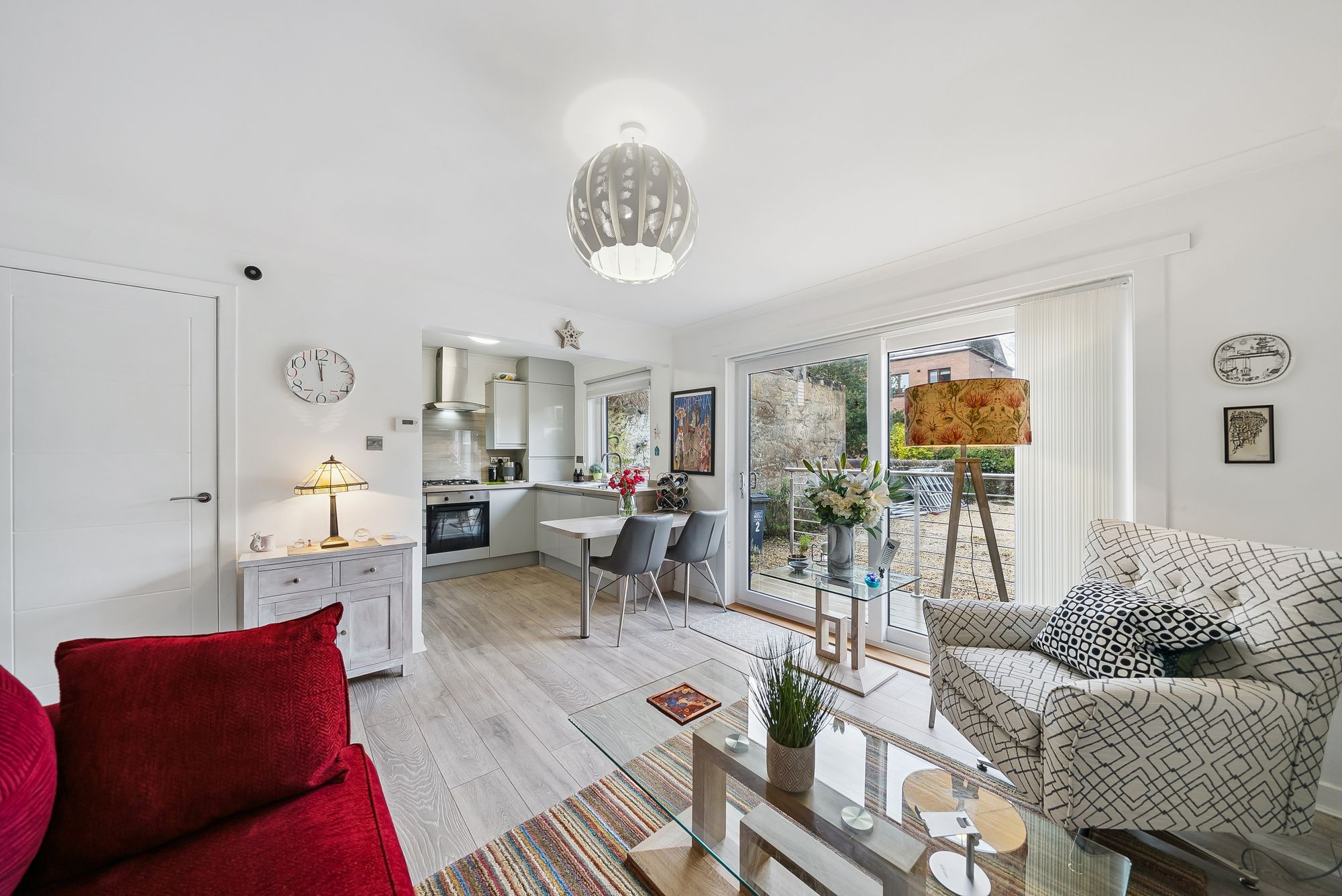 Nestled in the charming coastal town of Helensburgh, this modern, split-level apartment at 2 Millburn Mews offers a perfect fusion of contemporary design and thoughtful functionality. Having been extensively upgraded and refitted buy the current vendors to an extremely high standard, the accommodation is spread across two levels, with the property welcoming one on the ground floor with a cozy entrance hall which leads into a beautifully presented lounge. Large glass doors open onto a sleek composite deck overlooking a rear garden and chipped parking area—an ideal spot for relaxing outdoors. The open-plan, refitted kitchen boasts a wide range of floor and wall units, integrated appliances, and crisp, modern lighting. Under-stair storage adds extra practicality, and a staircase leads up to the upper floor.