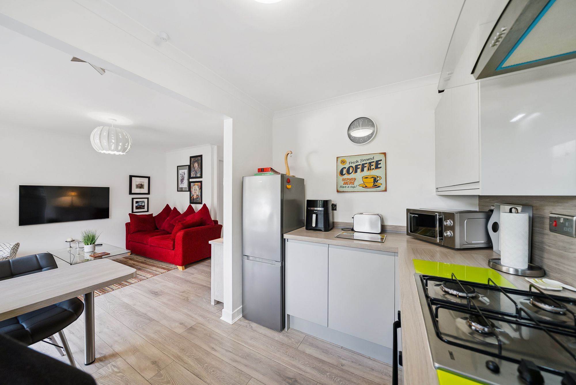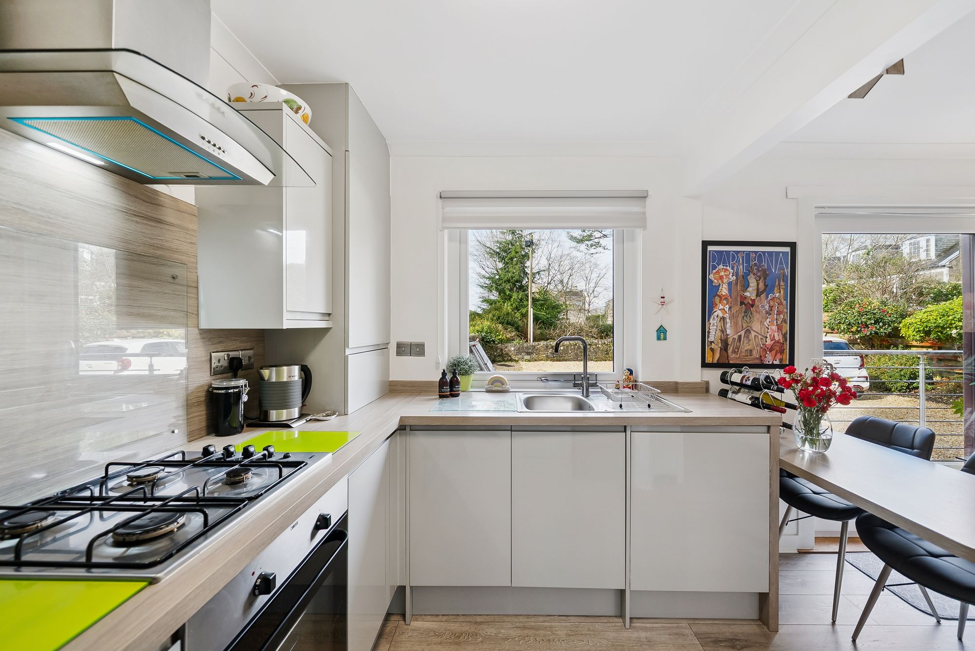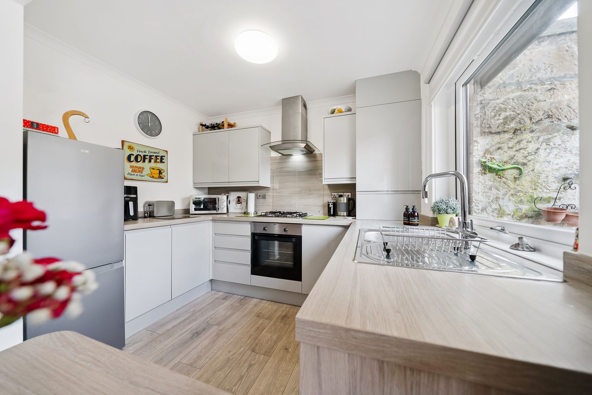 Nestled in the charming coastal town of Helensburgh, this modern, split-level apartment at 2 Millburn Mews offers a perfect fusion of contemporary design and thoughtful functionality. Having been extensively upgraded and refitted buy the current vendors to an extremely high standard, the accommodation is spread across two levels, with the property welcoming one on the ground floor with a cozy entrance hall which leads into a beautifully presented lounge. Large glass doors open onto a sleek composite deck overlooking a rear garden and chipped parking area—an ideal spot for relaxing outdoors. The open-plan, refitted kitchen boasts a wide range of floor and wall units, integrated appliances, and crisp, modern lighting. Under-stair storage adds extra practicality, and a staircase leads up to the upper floor.
