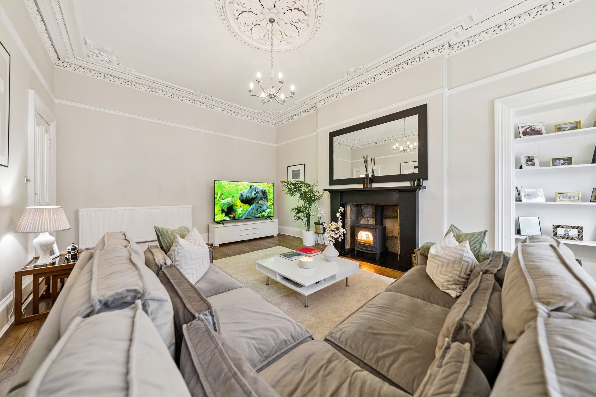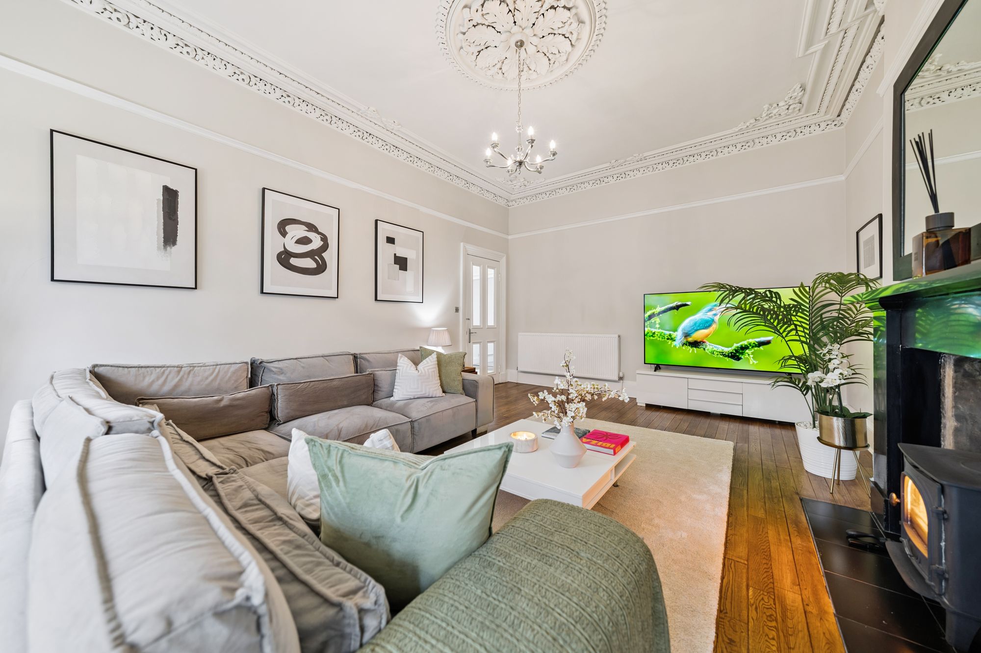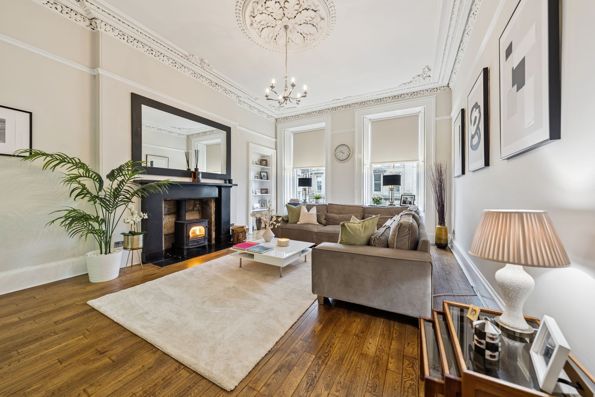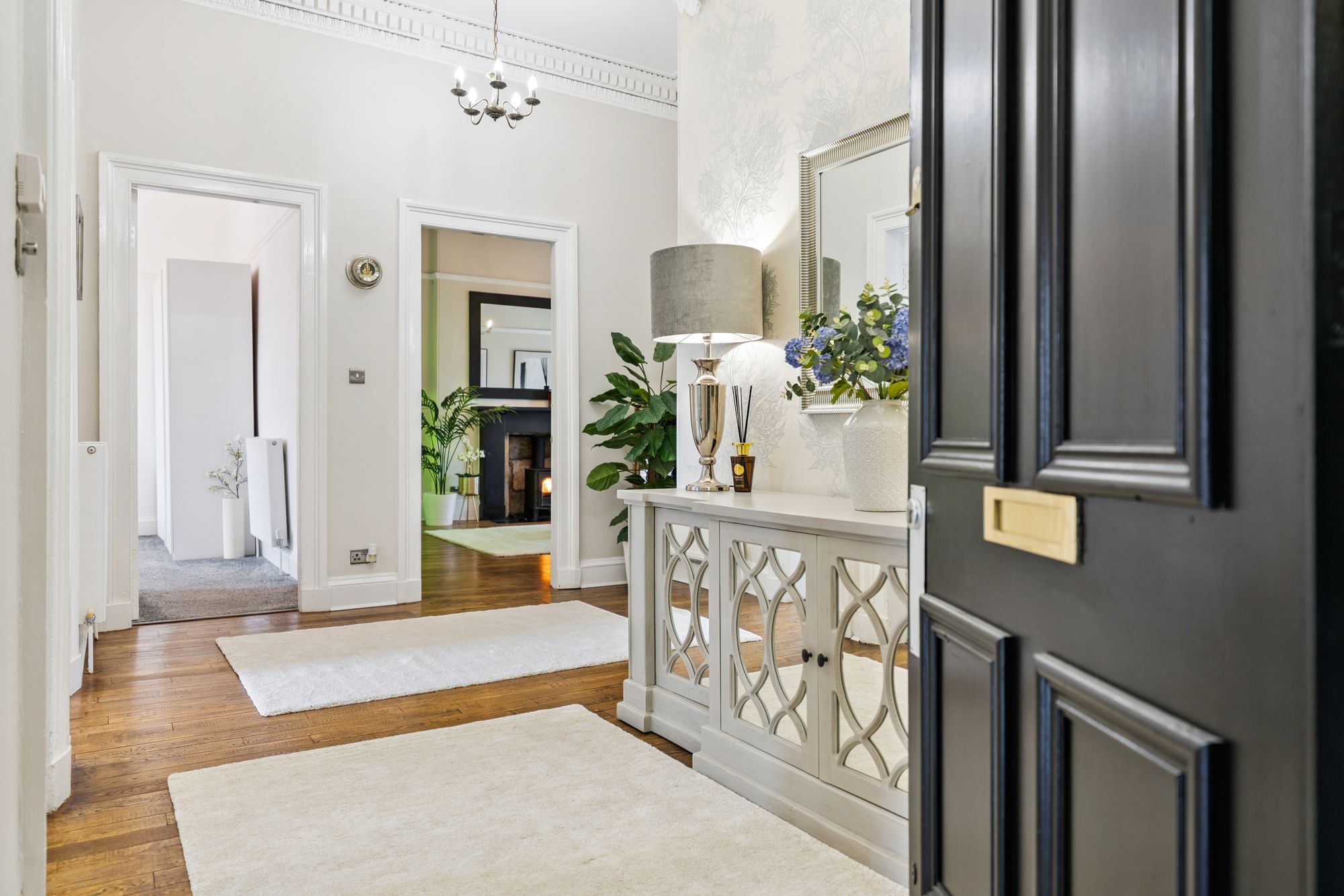 Internally, the flat is modern throughout, however still retains many eye-catching period features including; ornate cornice, ceiling rose, sash windows and fully functioning shutters. The attached photographs, floor plan and HD video tour will give an idea to the size and layout of the flat. However, in brief the accommodation extends to; a welcoming entrance hallway with storage off, a striking living room with an exposed stone fireplace with log burner, a spacious dining sized kitchen with base and wall mounted shaker style units, integrated appliances and a Belfast sink. Three generous double bedrooms, including a wonderful principal room with original fireplace and walk in cupboard. There is a home office, which could also be utilised as a snug, or play room and the accommodation is completed by a fully tiled bathroom with three-piece, shower over the bath and a heated towel rail. The property also benefits from access to shared storage areas which is perfect for additional storage.