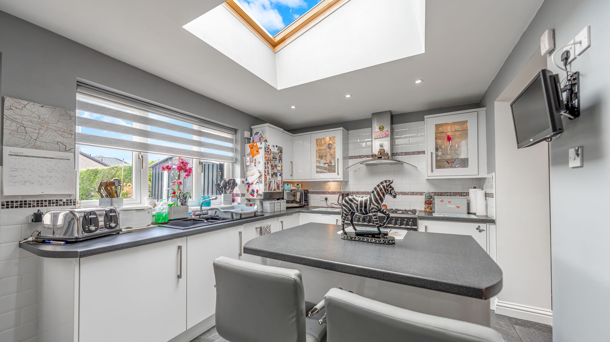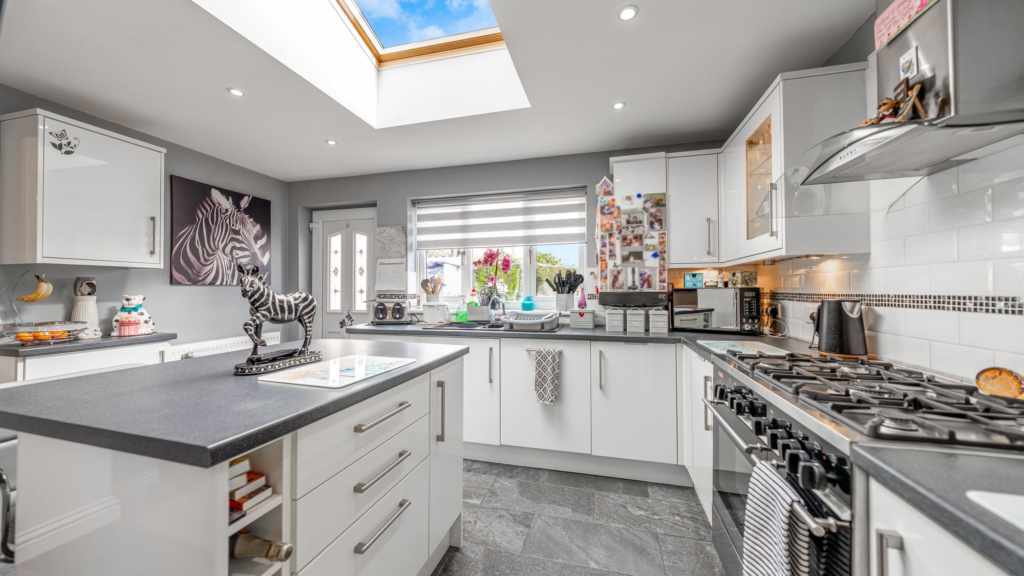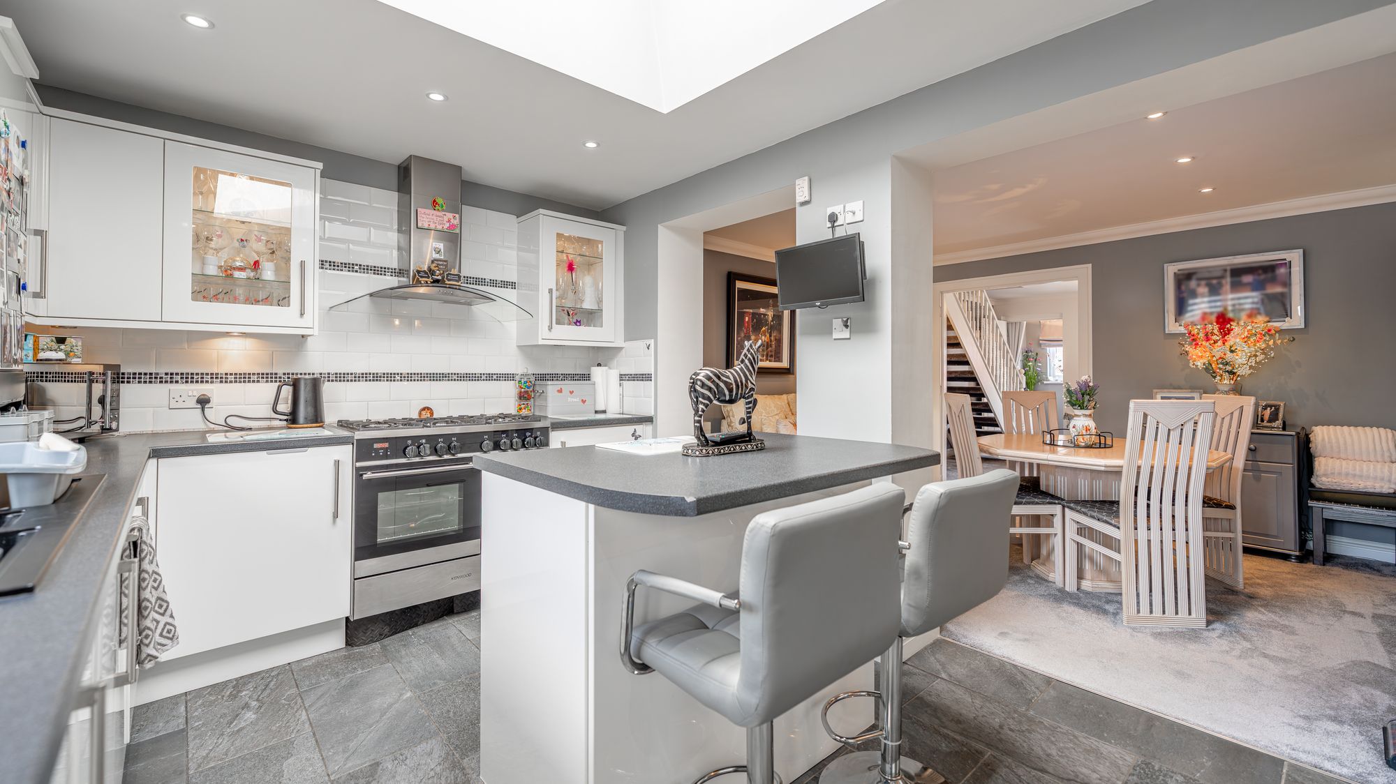 On entering the property, a welcoming vestibule leads into a bright and generously sized living room, complete with open staircase to the upper level. From here, the property flows into a striking open-plan kitchen and dining area, the true centrepiece of the home. With a central island, modern cabinetry, integrated appliances and space for a family dining table, this room is designed for both everyday living and entertaining.
