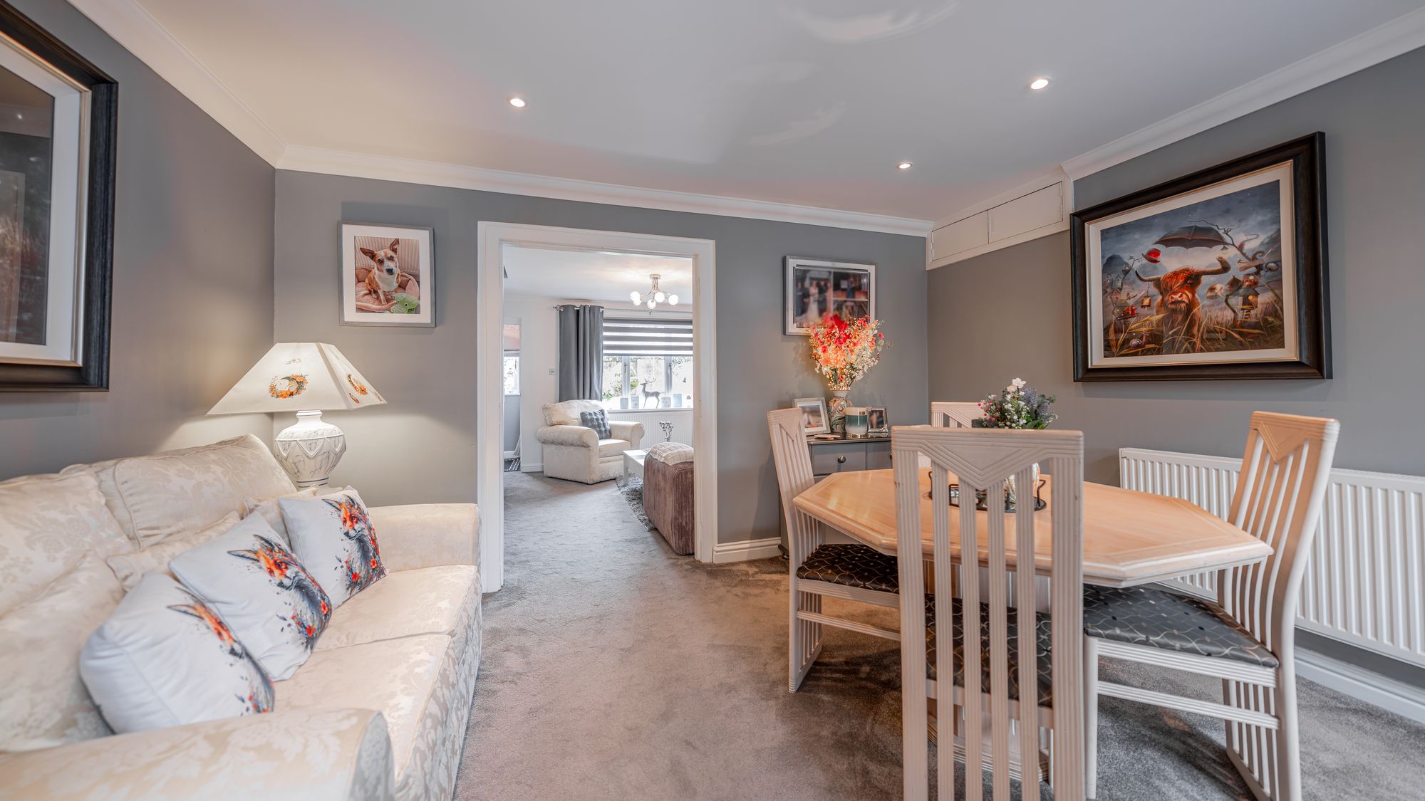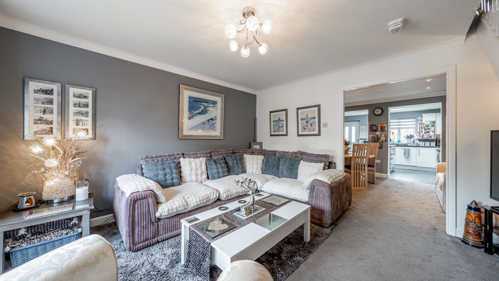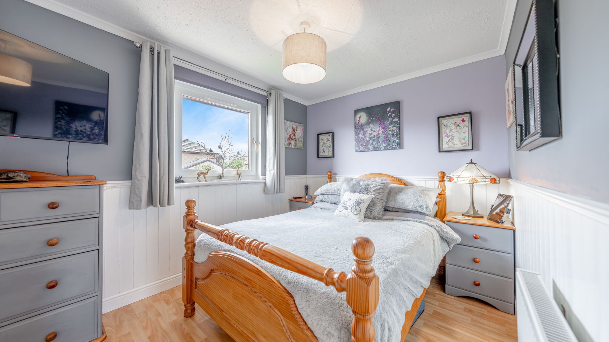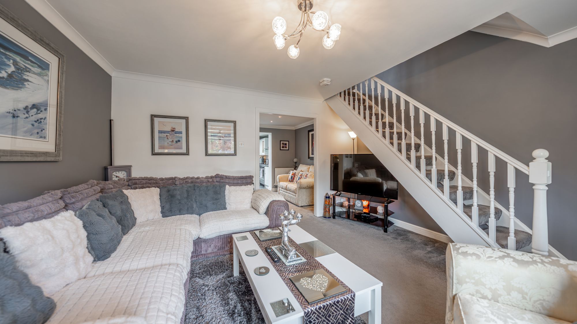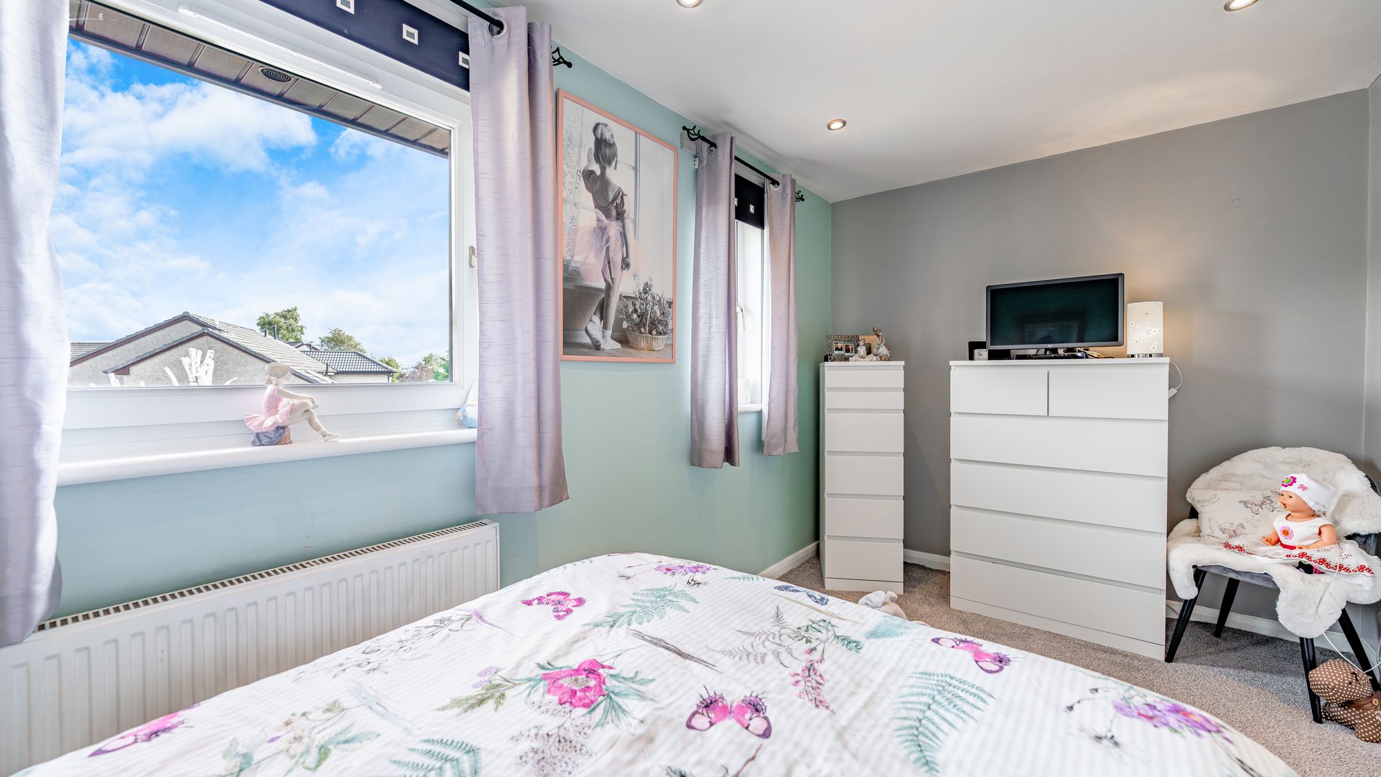 Upstairs, the principal bedroom benefits from fitted wardrobes and an en-suite shower room. Two further well-proportioned bedrooms are served by a stylish family bathroom, complete with a four-piece suite.