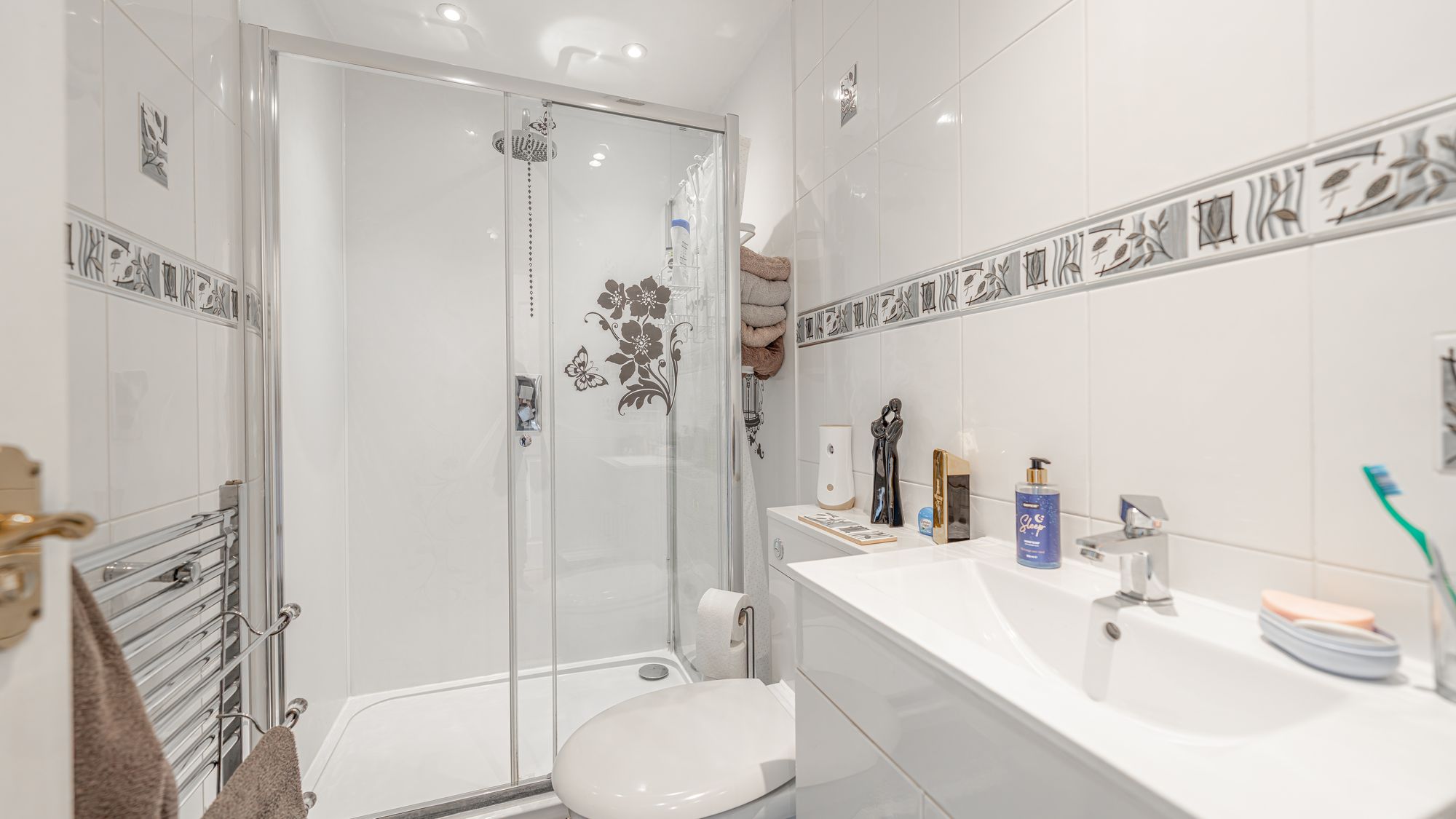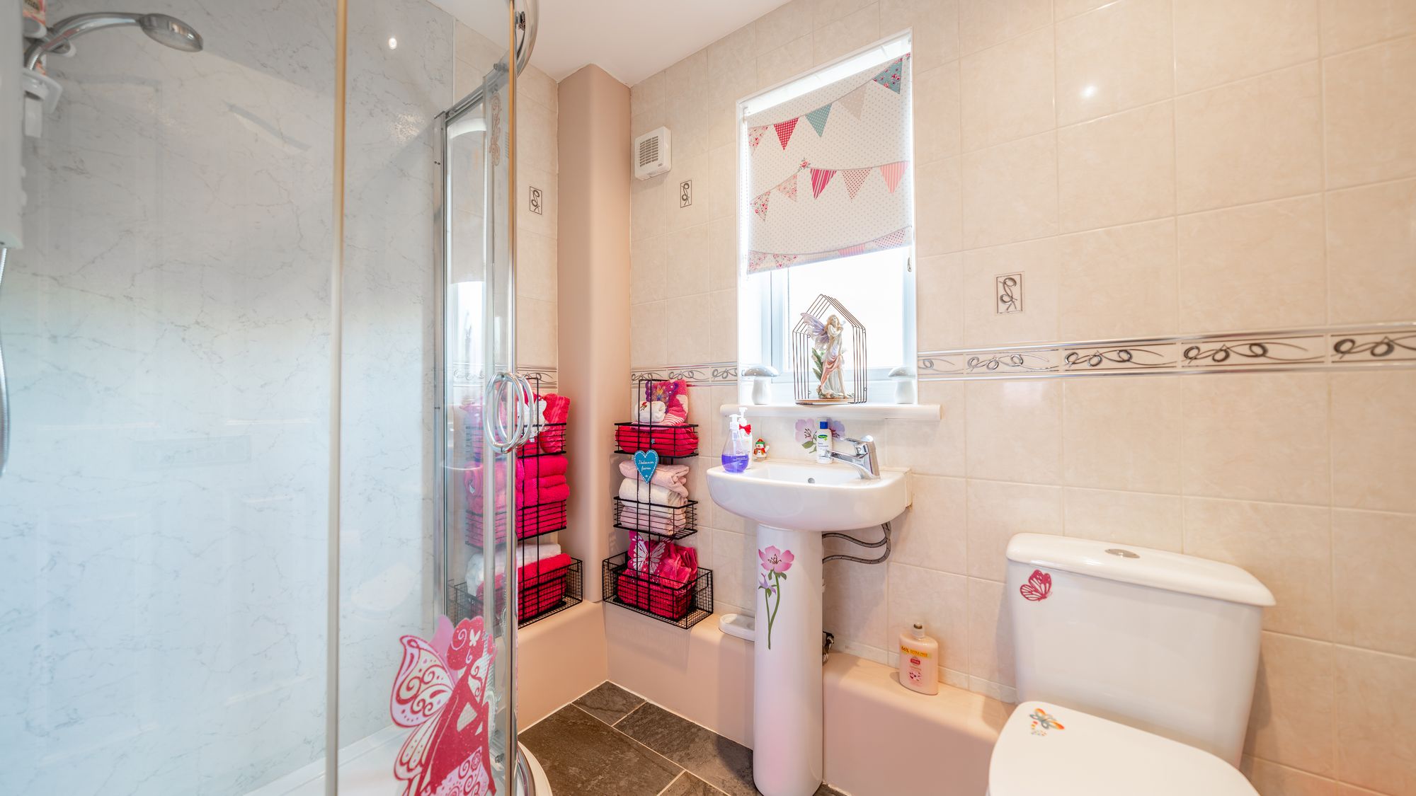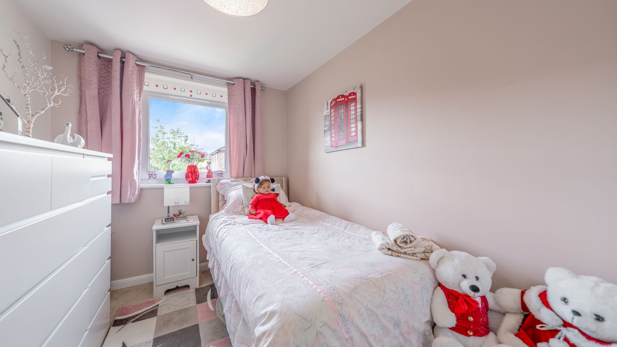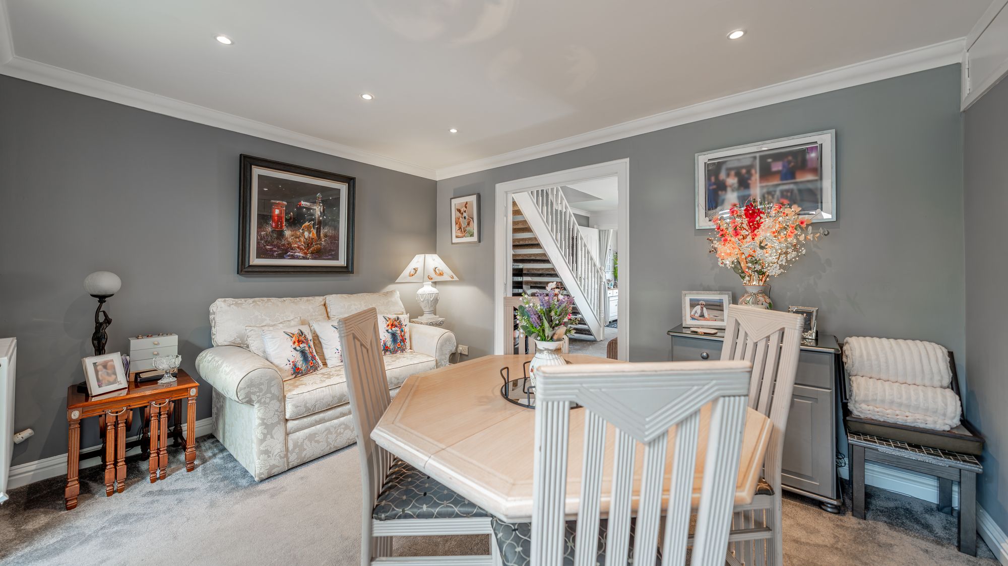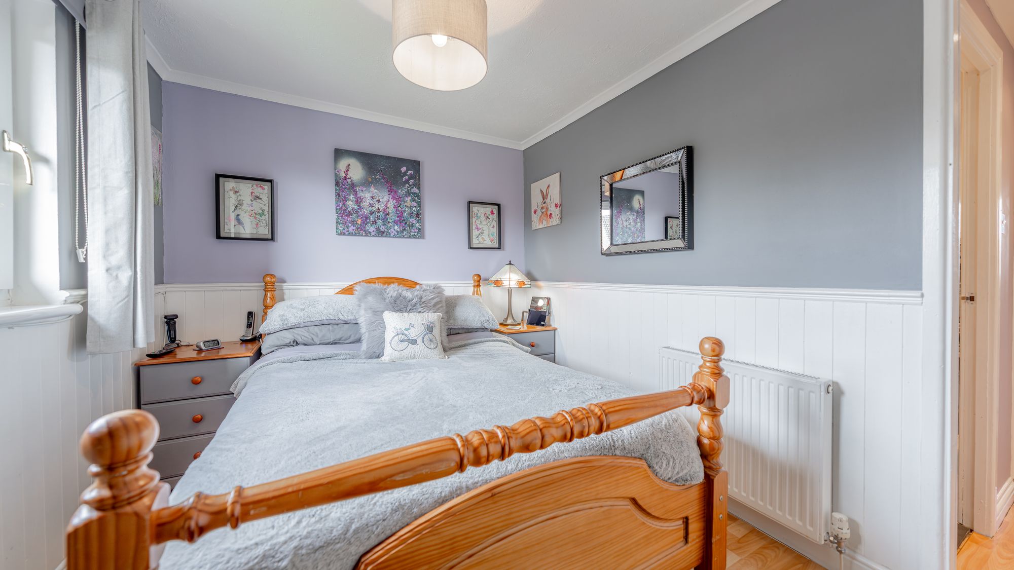 Upstairs, the principal bedroom benefits from fitted wardrobes and an en-suite shower room. Two further well-proportioned bedrooms are served by a stylish family bathroom, complete with a four-piece suite.