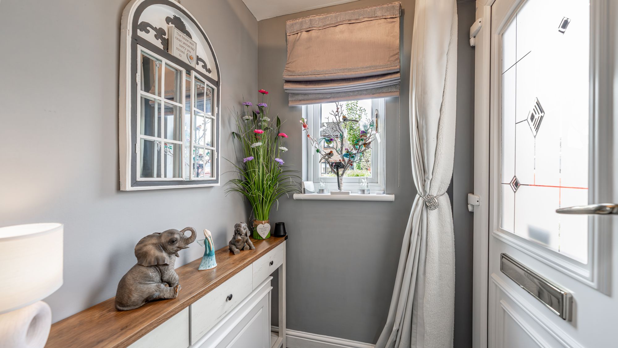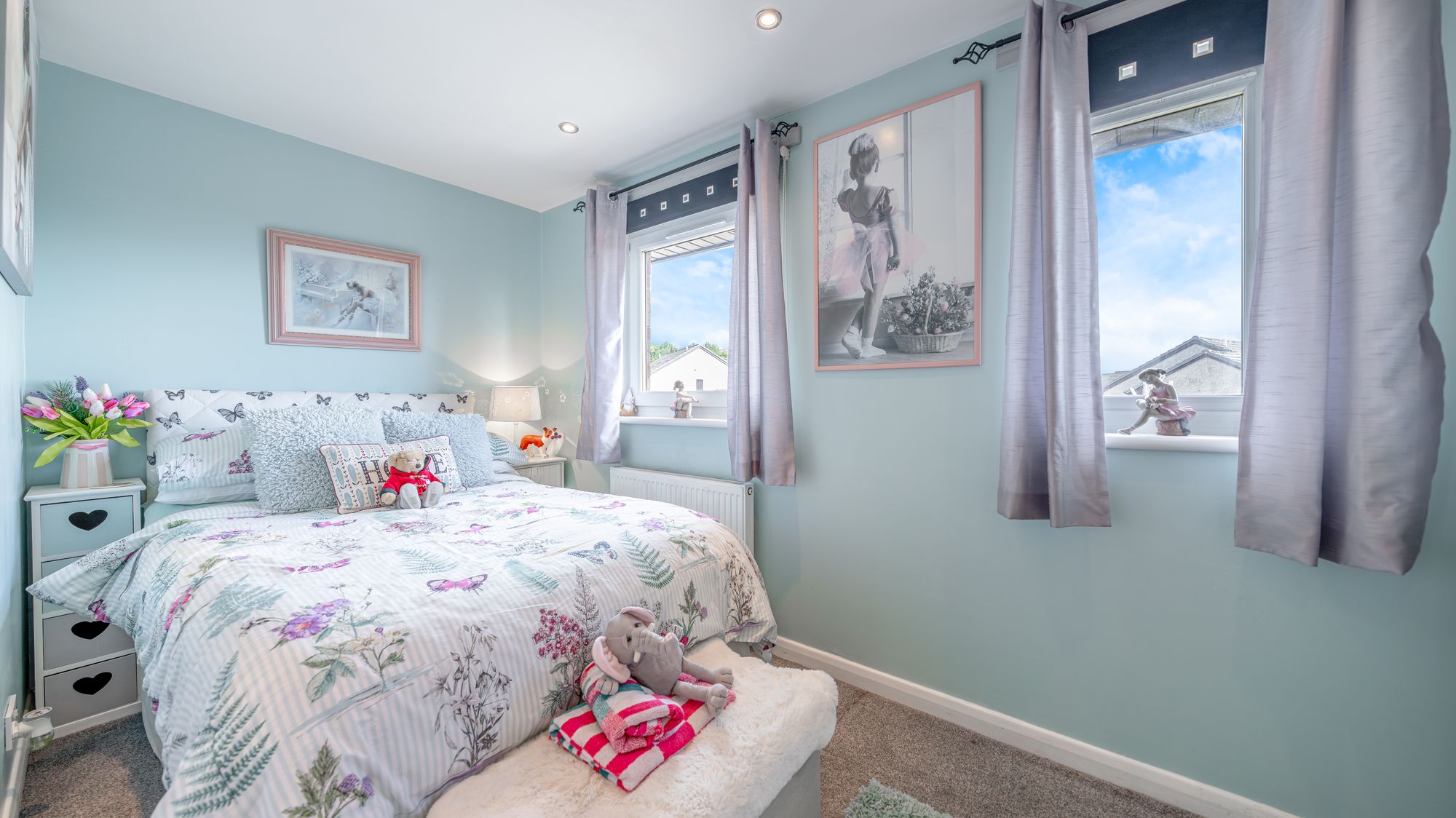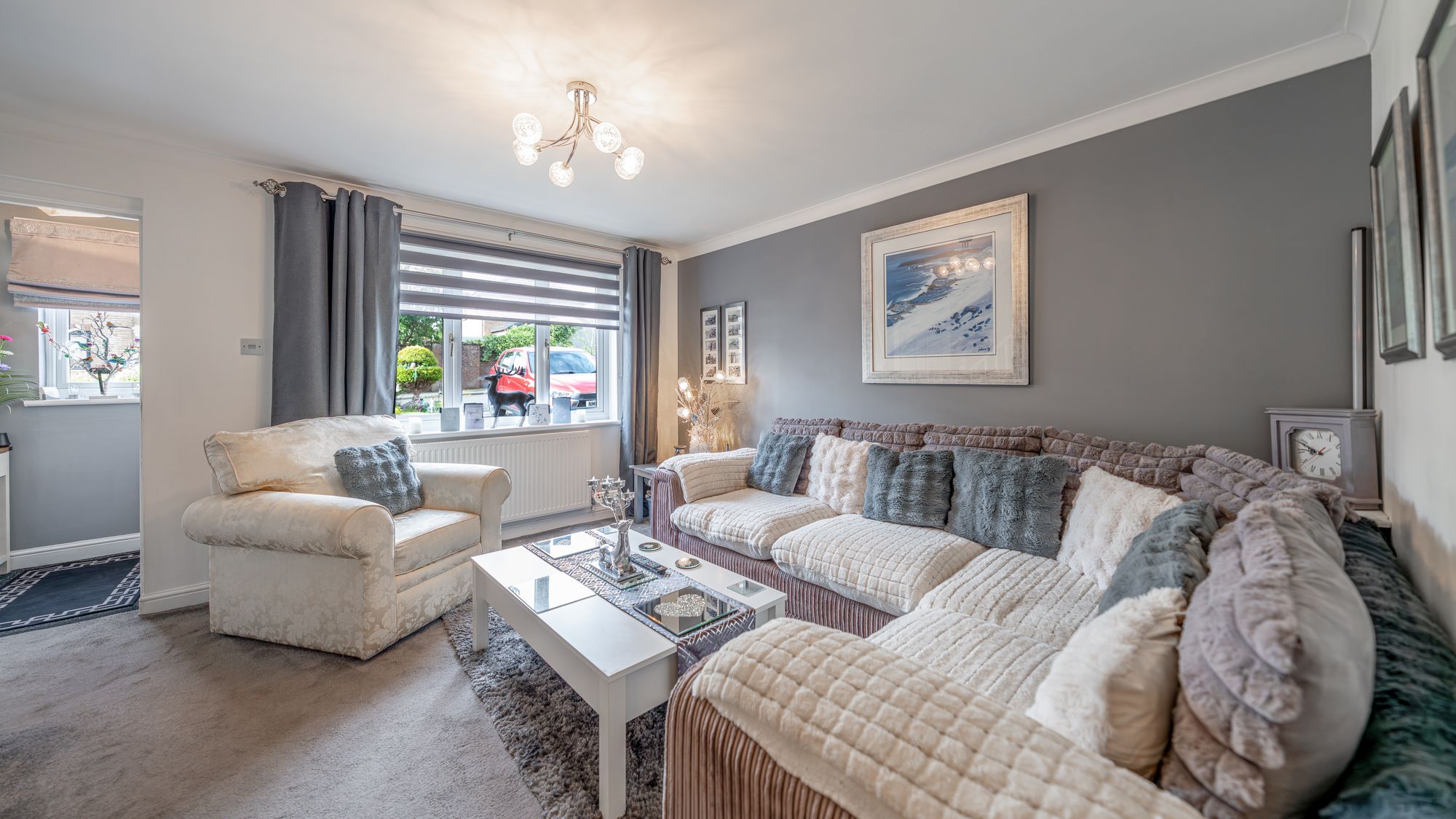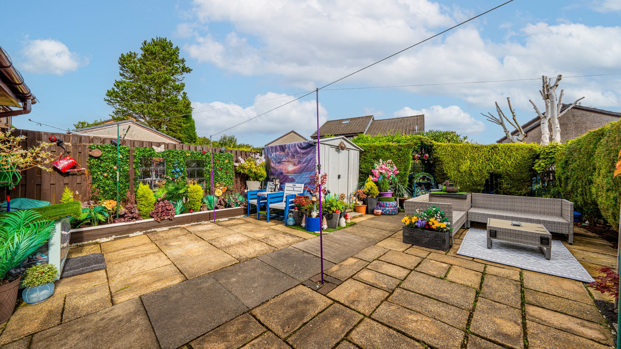 Externally, the home is enhanced by a private driveway to the front, alongside a neatly kept lawn. To the rear, the enclosed garden is level and paved for low-maintenance living, with mature hedging offering privacy and a safe setting for children to play or for hosting outdoor gatherings.