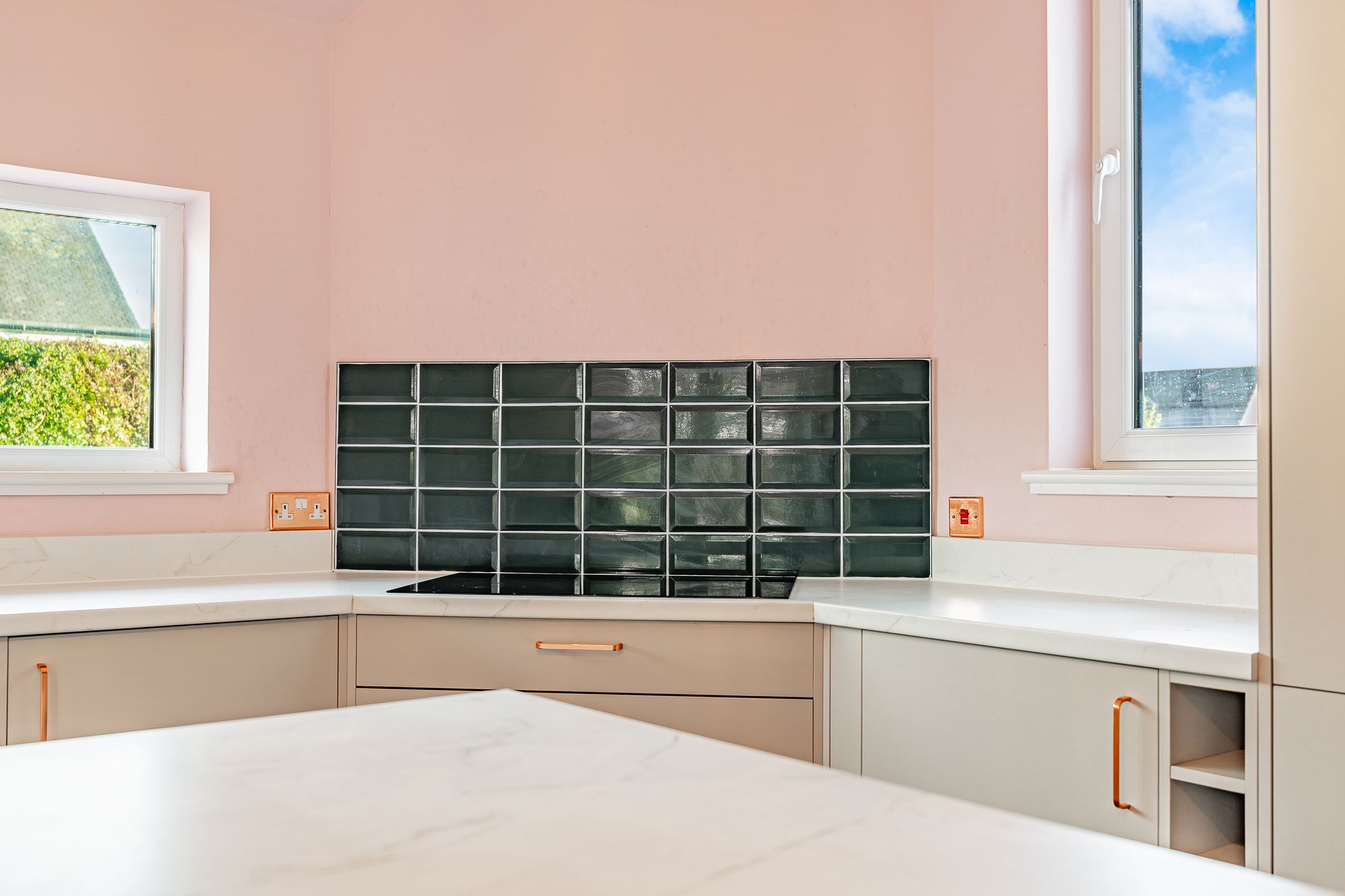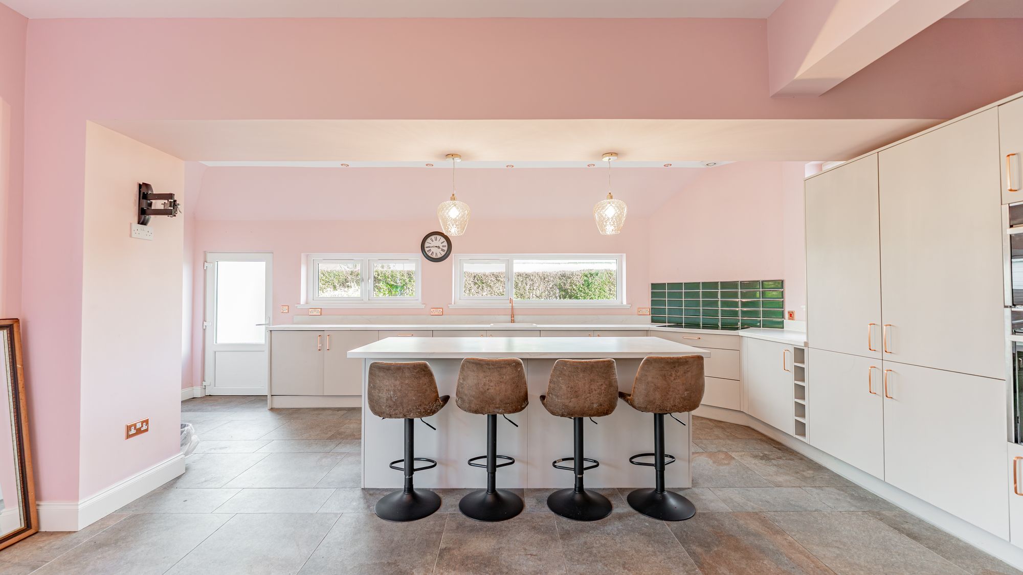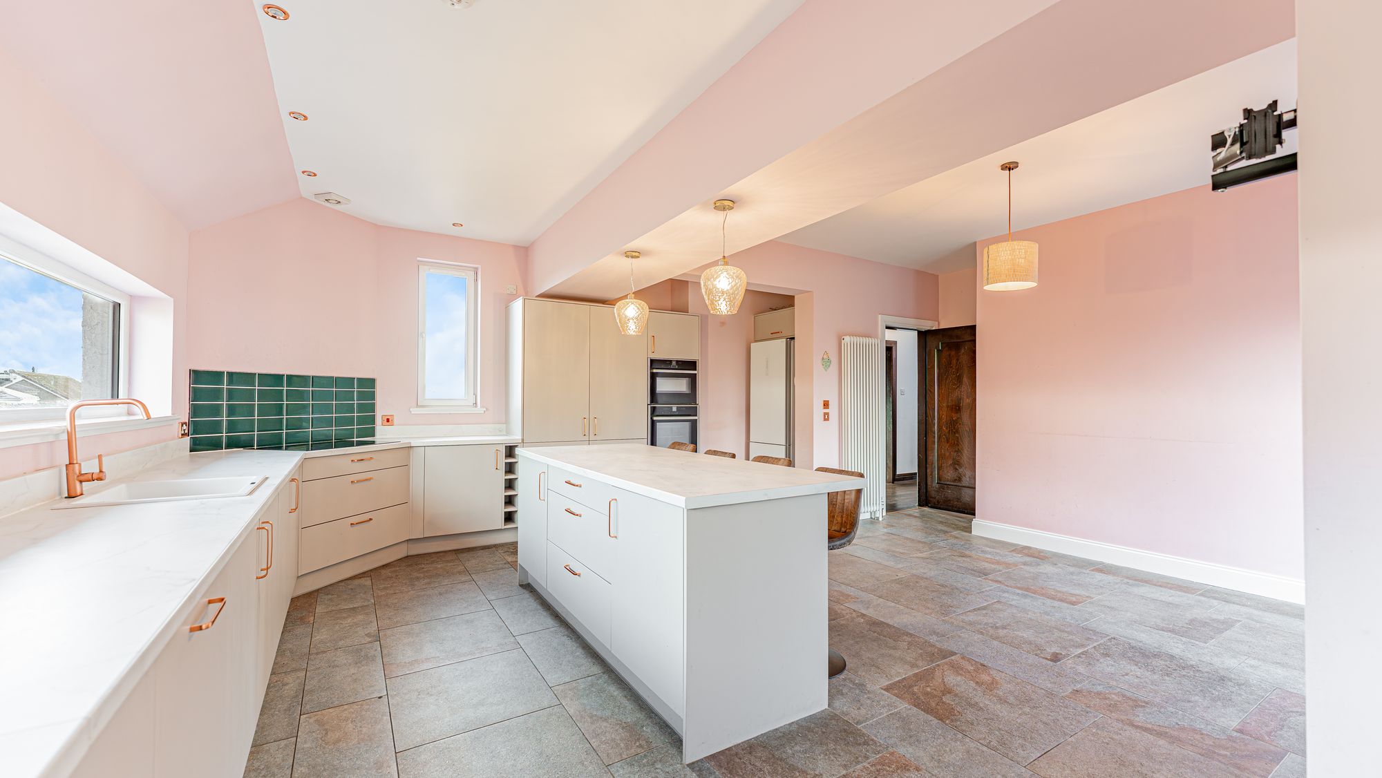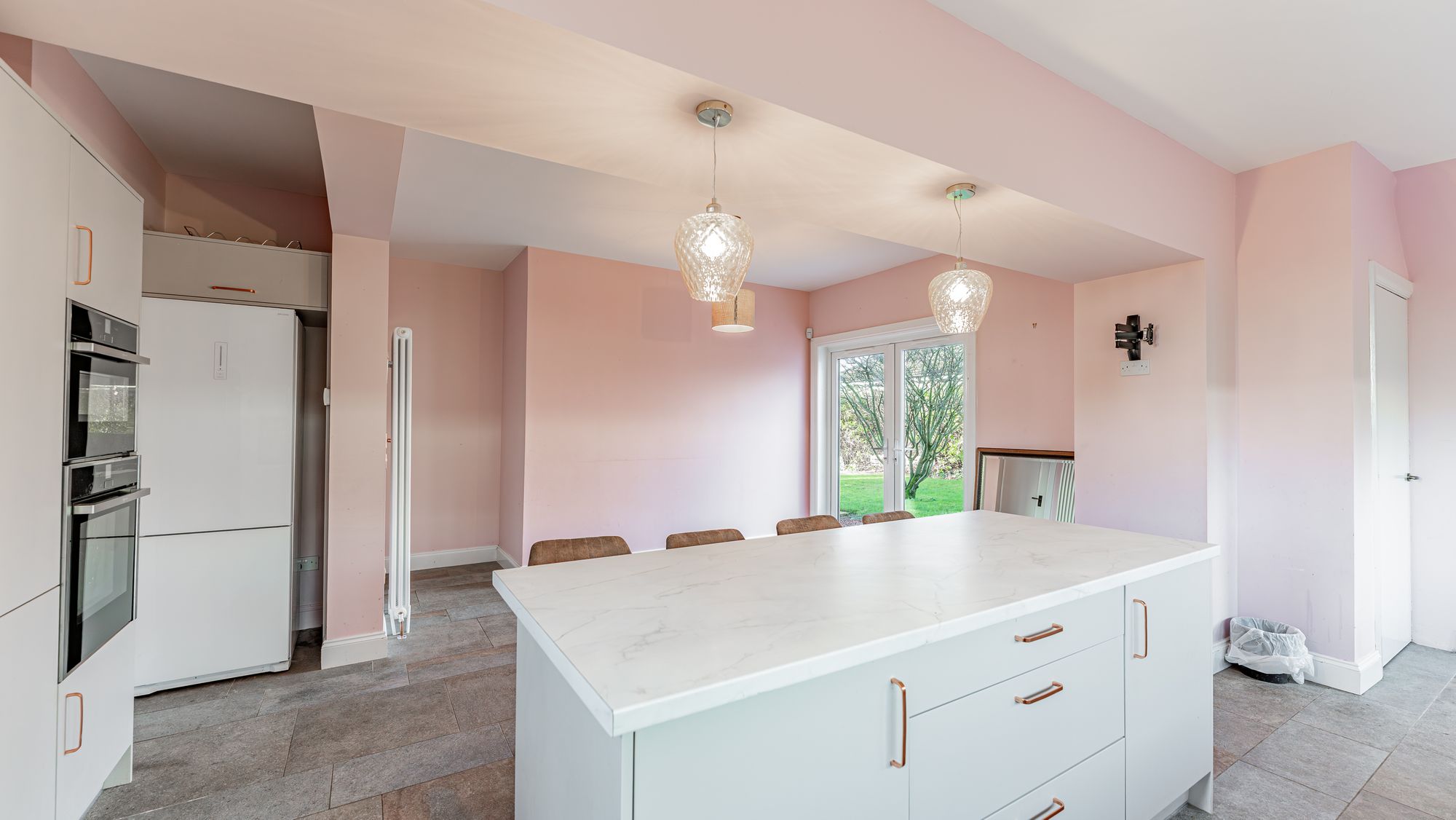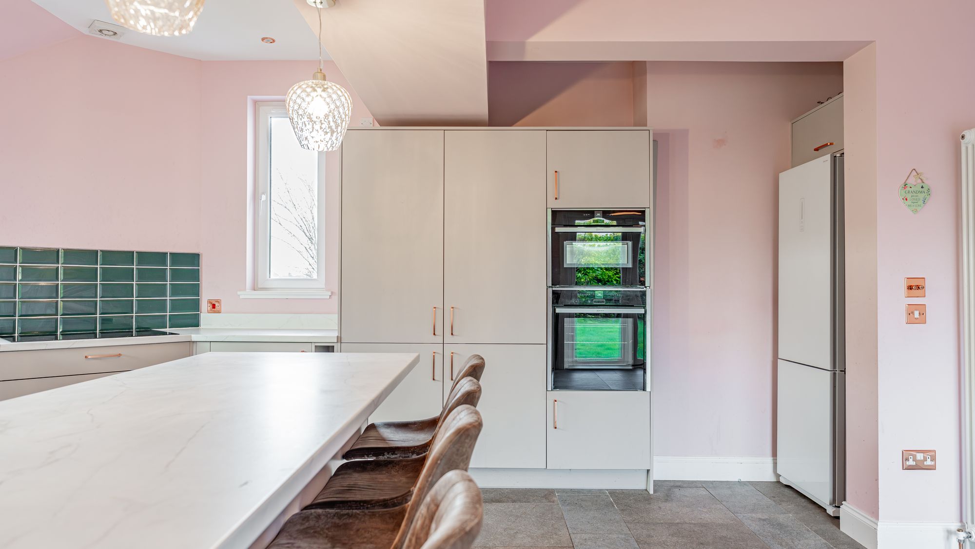 The attached photographs and video provide a sense of scale and layout, but in summary the accommodation begins with an entrance porch leading into a welcoming reception hallway with a generous cloakroom. The formal living room features an oriel window, while the contemporary dining kitchen includes grey cabinetry, a centre island with breakfast bar, and integrated appliances such as a microwave, oven, induction hob, dishwasher, washing machine and tumble dryer. French doors open directly from the kitchen into the rear garden. Also accessed from the hallway is a good-sized bedroom and a beautiful bay-windowed dining room with an original press cupboard and open views.