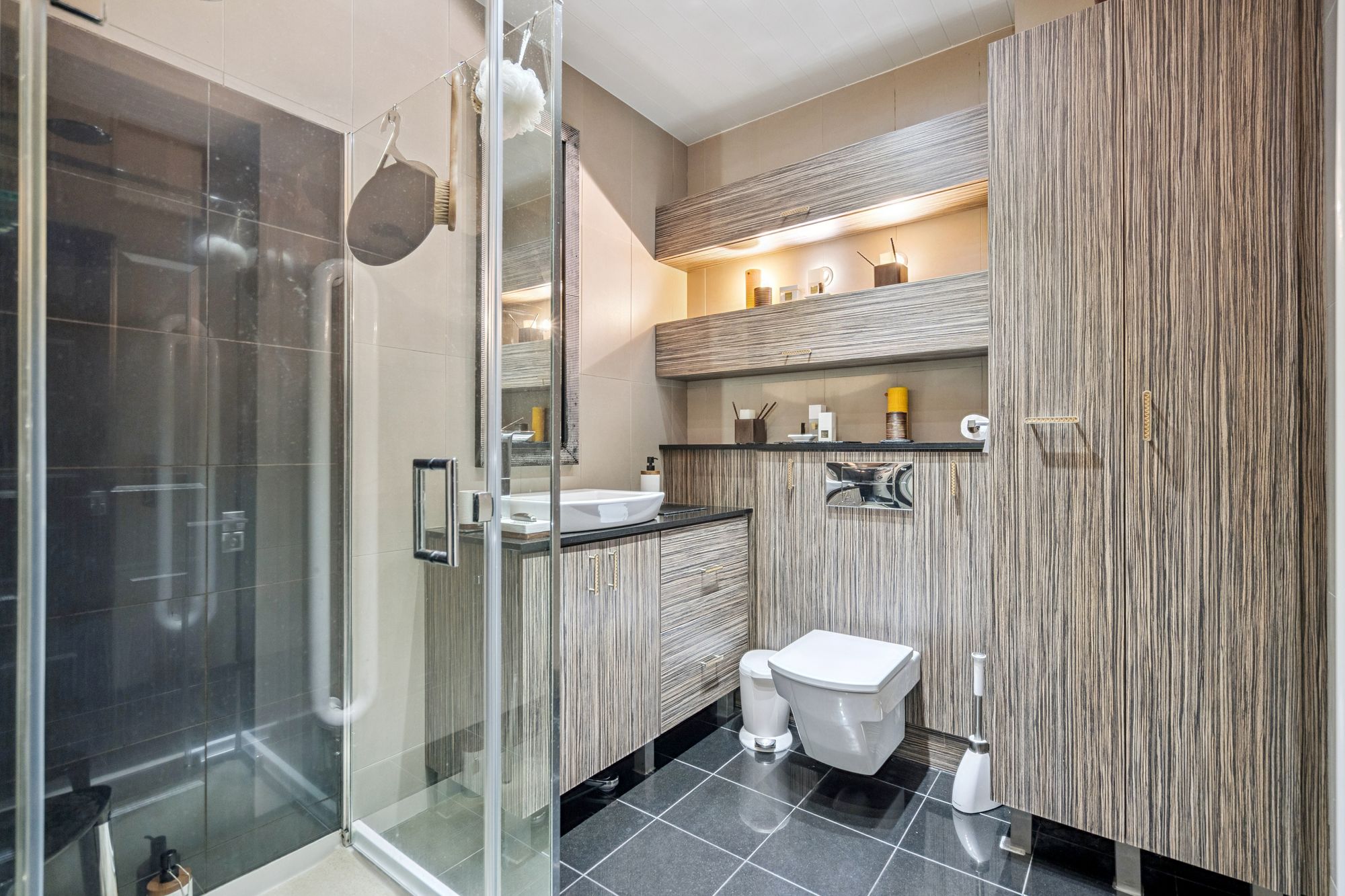 The current owners, who have a keen eye for detail and indeed a talent for interior design, have upgraded to a stunning specification throughout with some of the highlights being newly a fitted kitchen, bathroom and security system. Further upgrades also included double glazed units throughout, new boiler, ‘Junkers Danish’ hard wood flooring throughout and professionally fitted wardrobes with the second bedroom housing a pull-out bed. The attached photographs, floor plan and HD video tour will give a good indication to the size and layout of the flat. However, in brief, the accommodation extends to; Welcoming entrance hall with large storage cupboard off, two double bedrooms both of which house fitted wardrobes, newly fitted Roca bathroom with walk in shower, lounge with home office off and bespoke kitchen fitted with a range of integrated appliances and sleek units. To complete the accommodation there is private patio seating area to the rear of the apartment that has been recently re-slabbed by the owner.