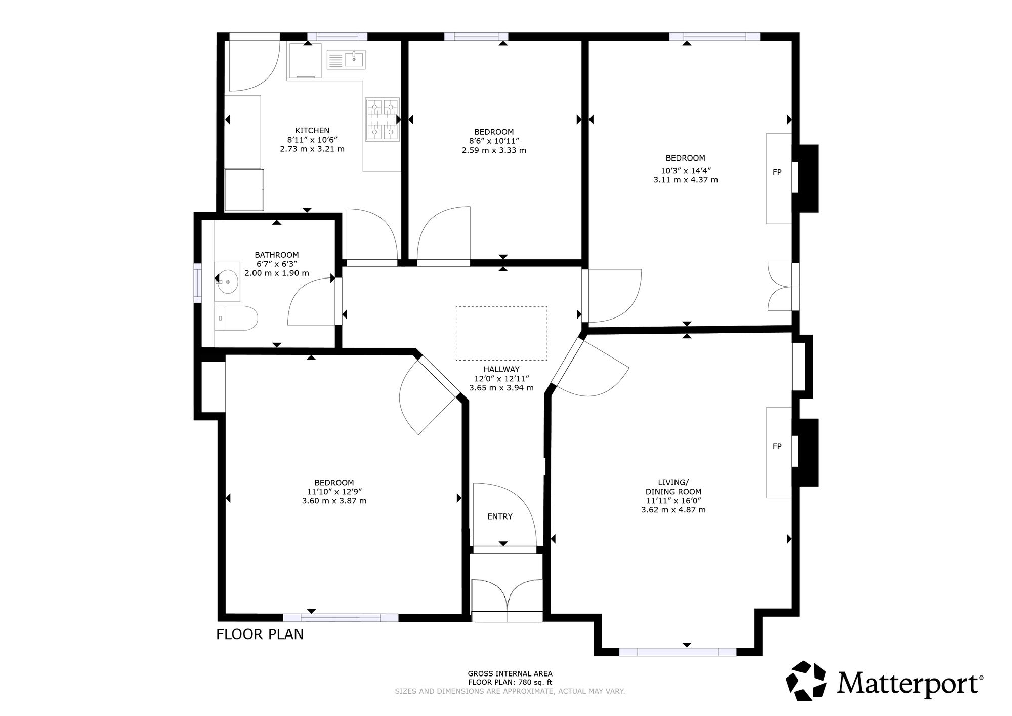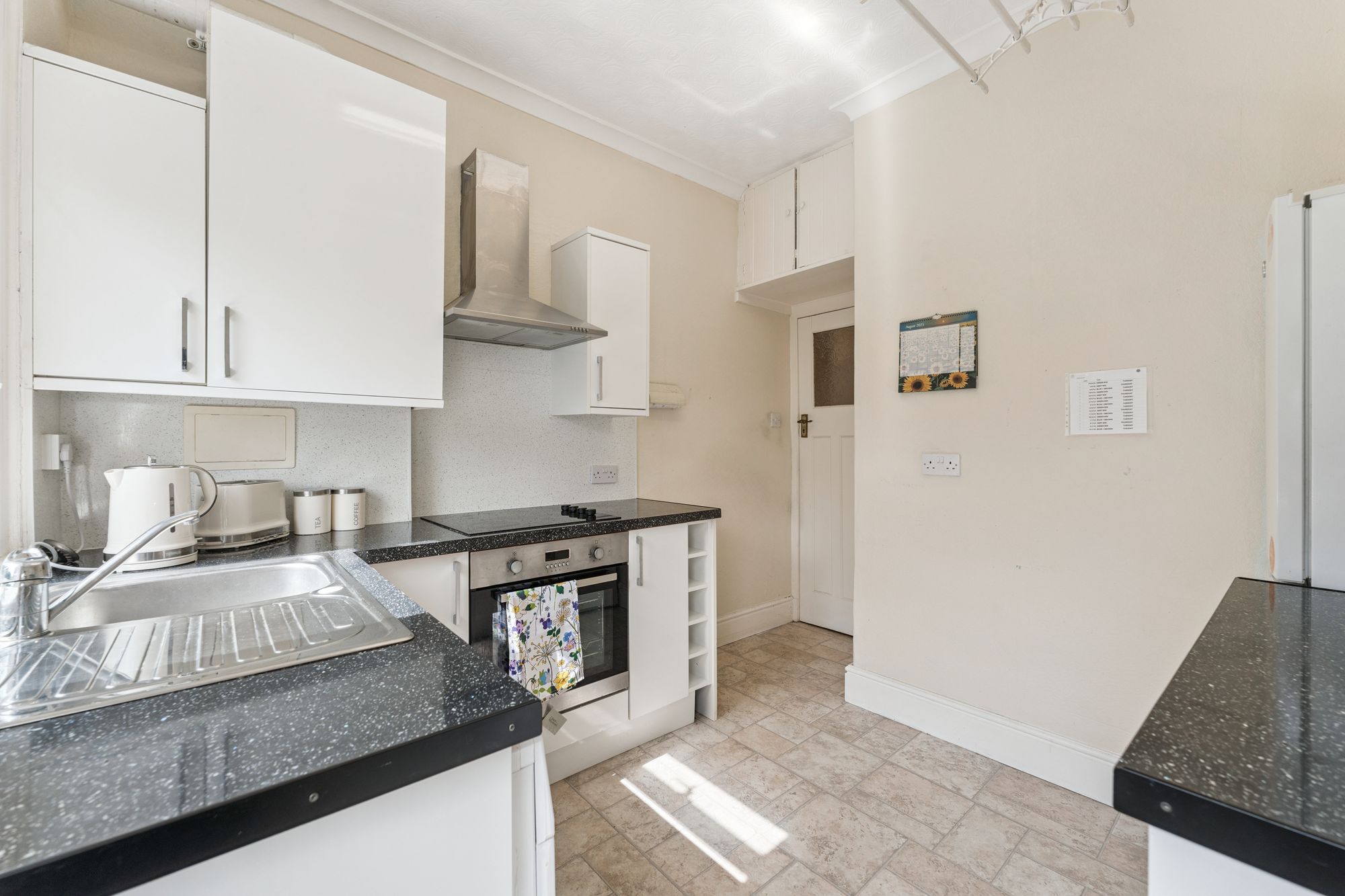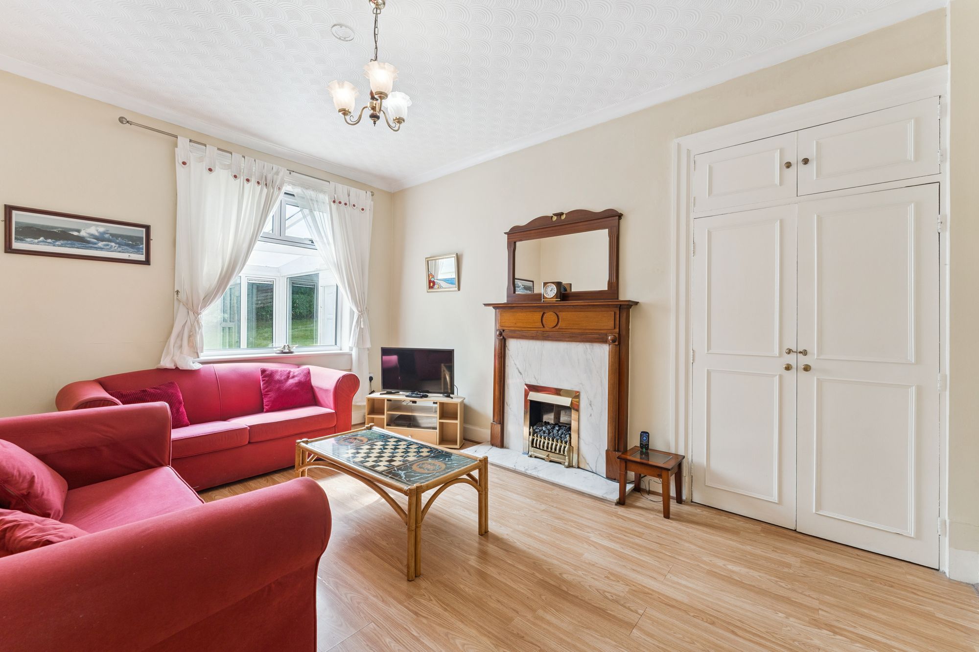 Inside, the home features a large, bright reception hallway that leads to a spacious front-facing lounge and dining room, complete with a feature fireplace. The kitchen is contemporary in style, fitted with sleek white cabinets and integrated appliances including an electric hob and oven. There are three generously sized double bedrooms, one of which is currently used as a sitting room. A tiled shower room and a small conservatory complete the internal accommodation.