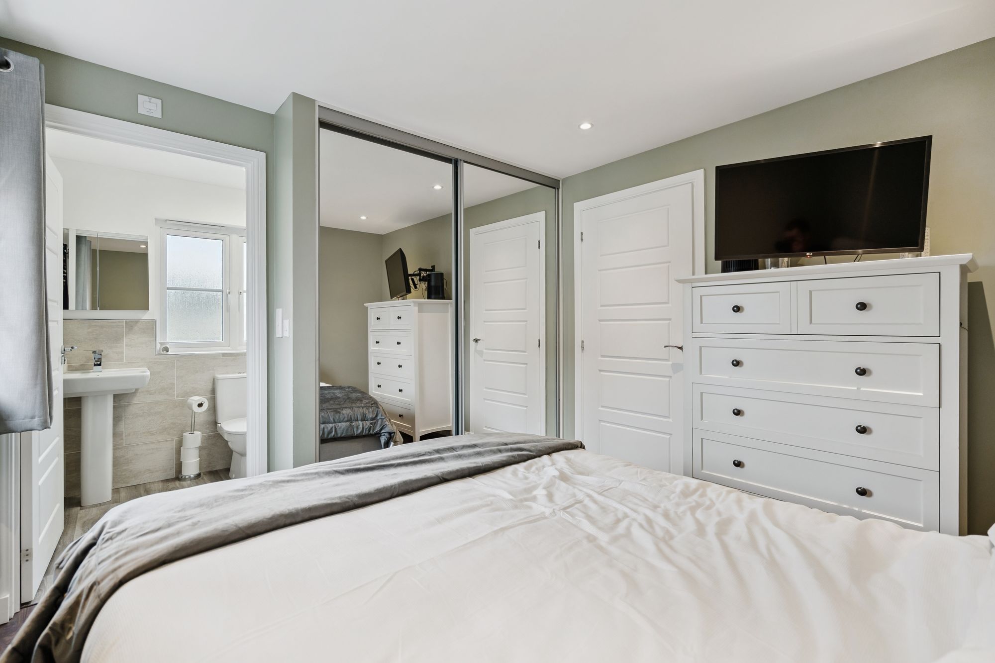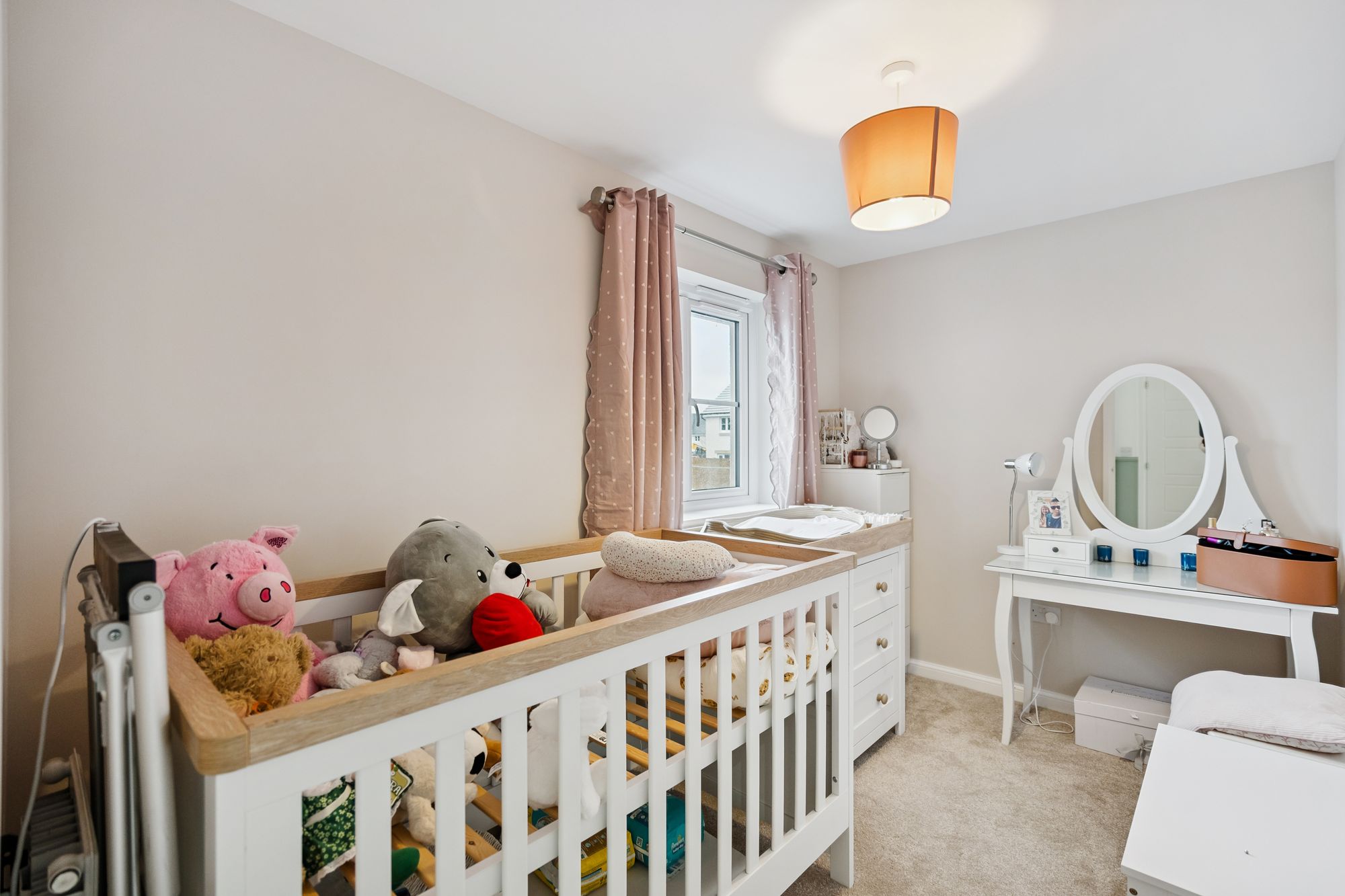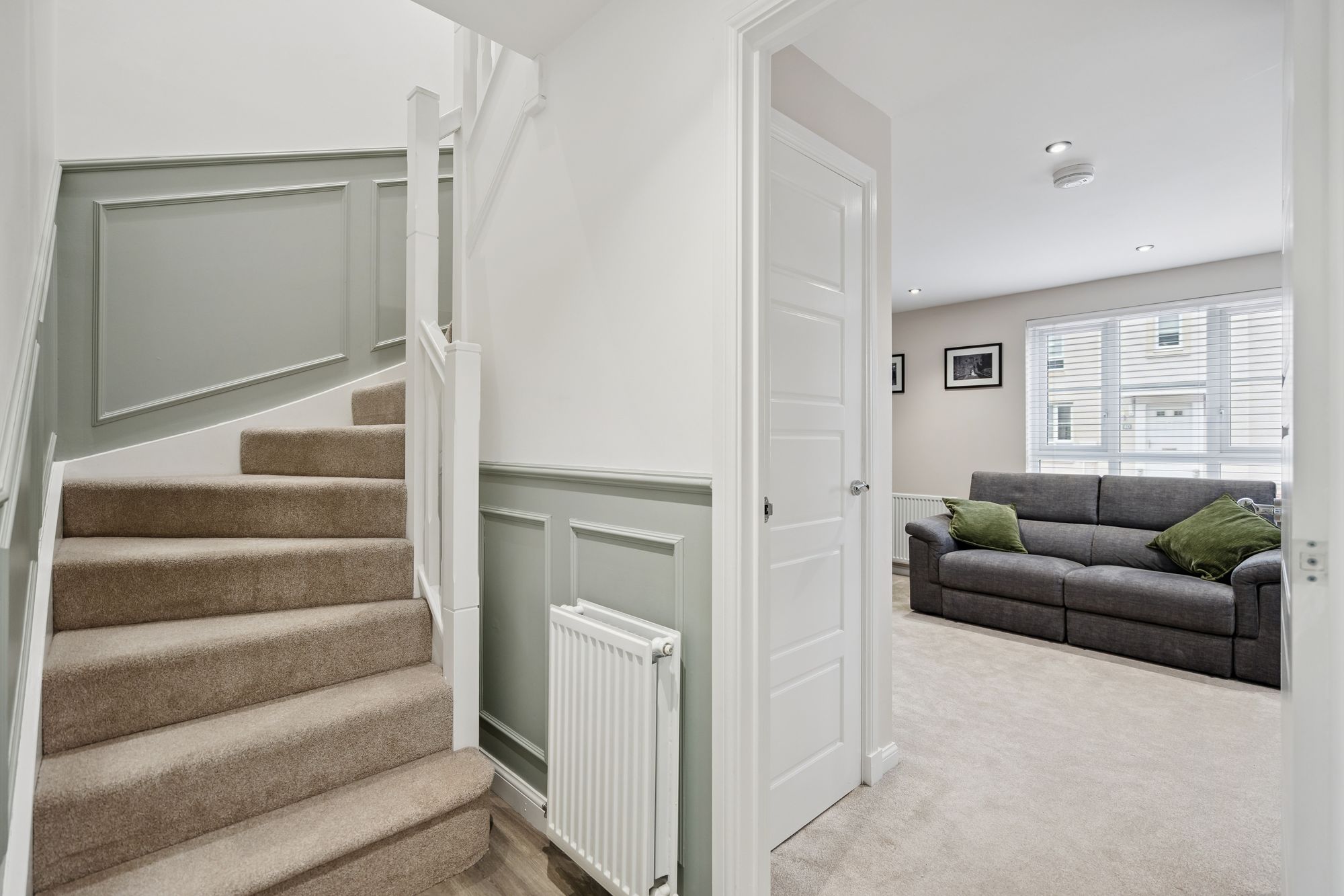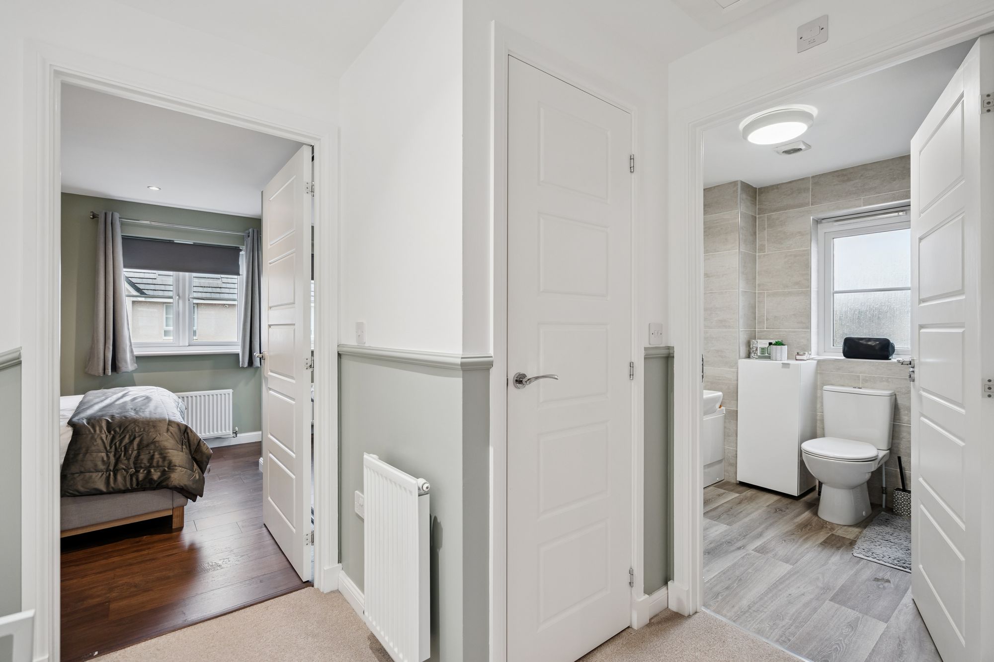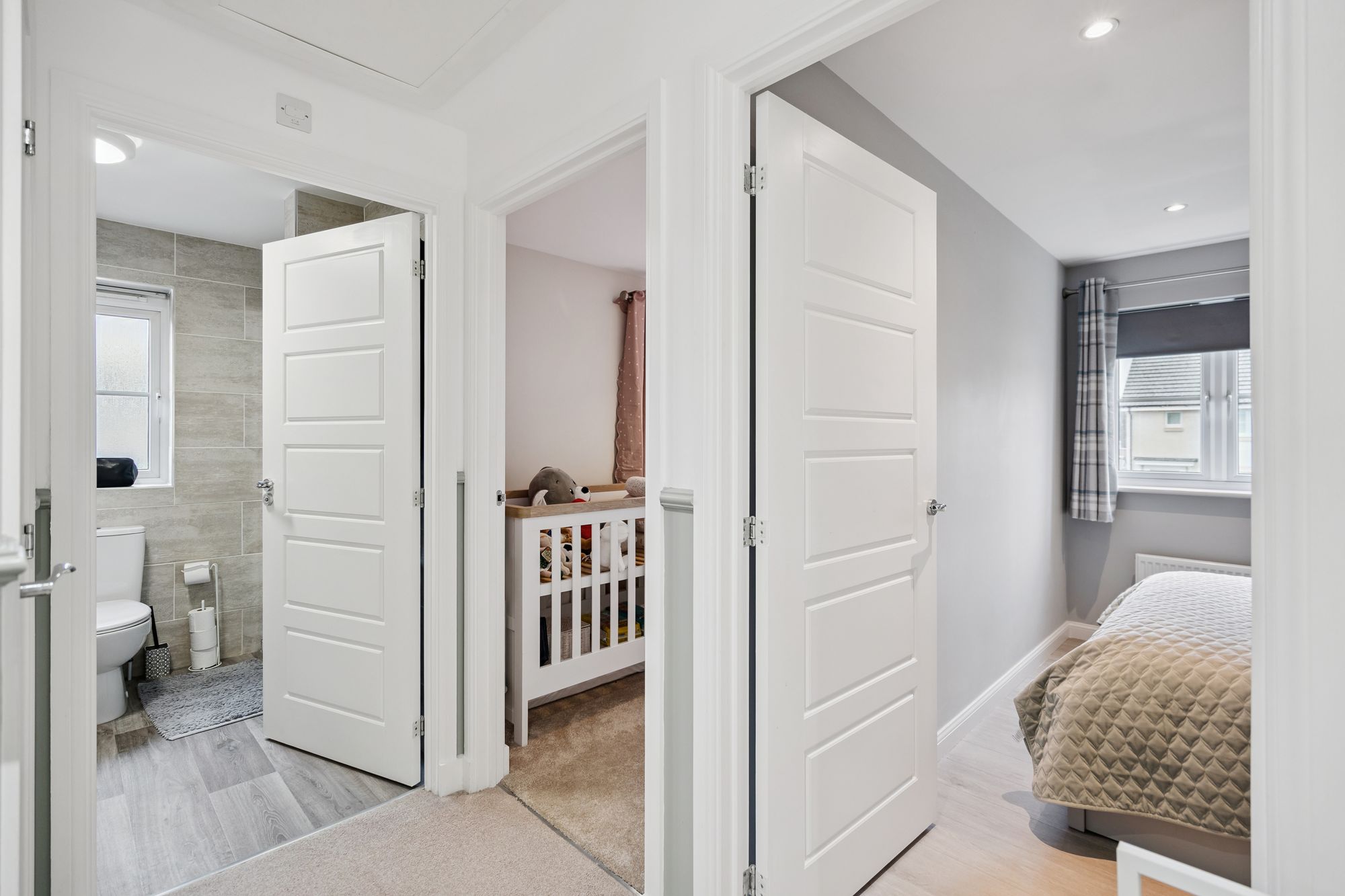 Upstairs, the first-floor landing gives access to a generously sized principal bedroom featuring its own ensuite shower room, creating a private retreat. Two further well-proportioned bedrooms provide flexibility for family use, guests, or home working, and are served by a modern family bathroom finished in a clean, contemporary style.