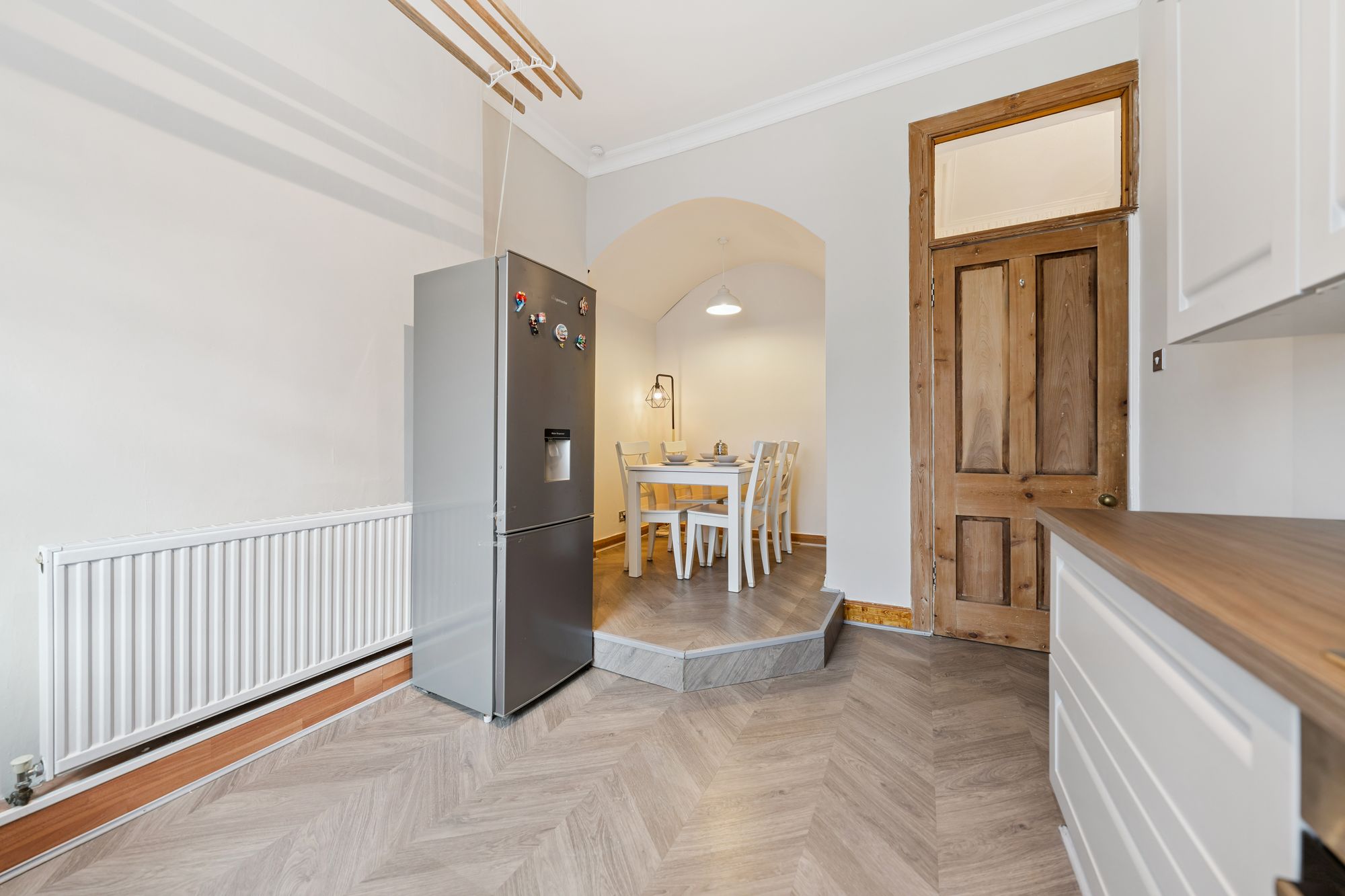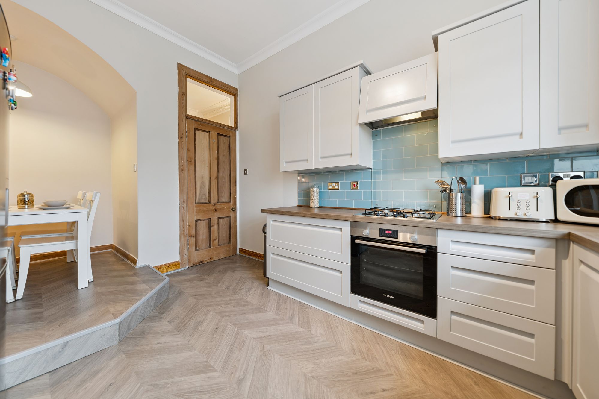 The dining kitchen has been recently upgraded and now offers a range of white shaker style units, complemented by wood effect worktops and a selection of integrated appliances, creating a clean and contemporary space that still sits comfortably with the character of the property.