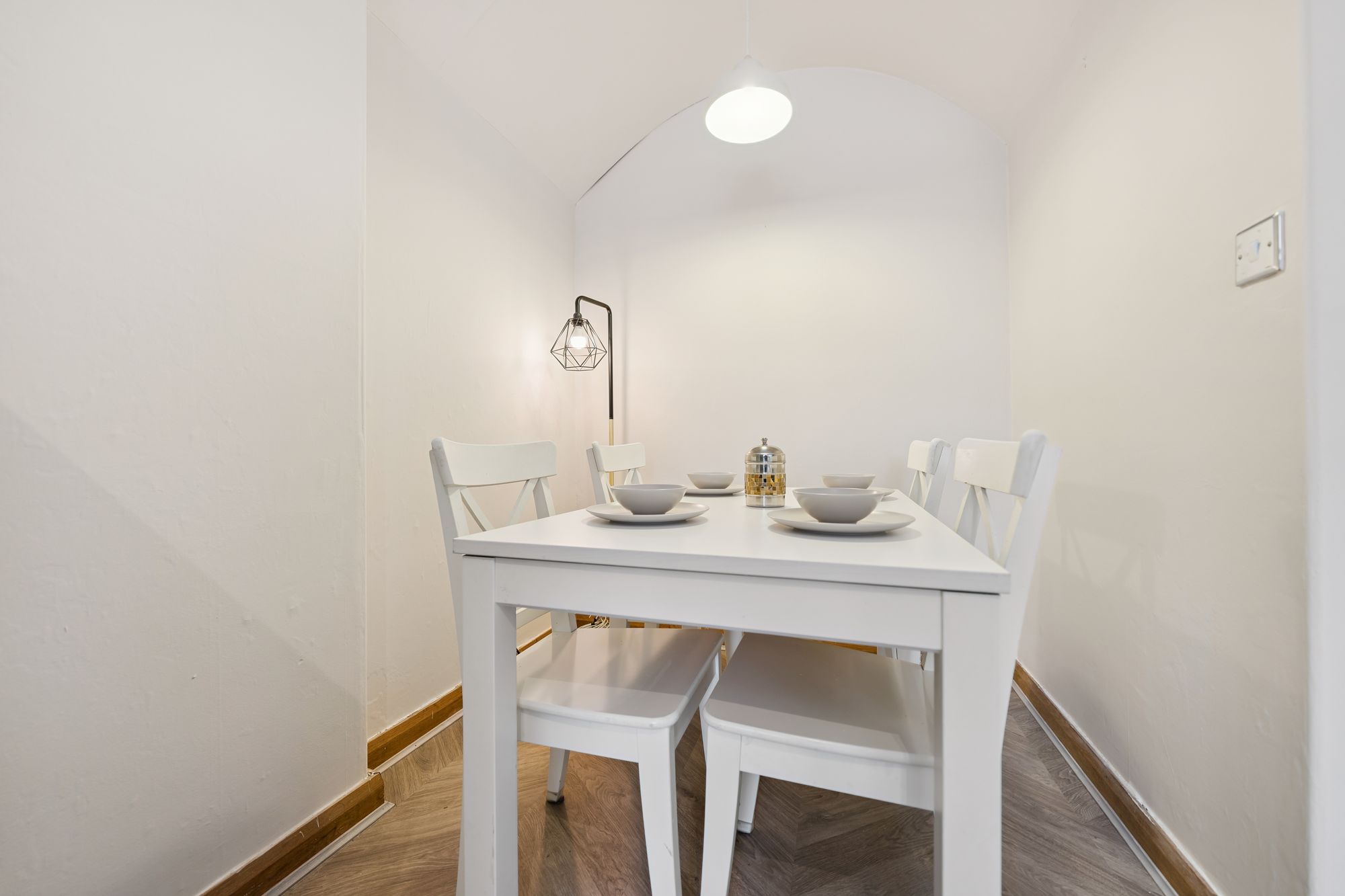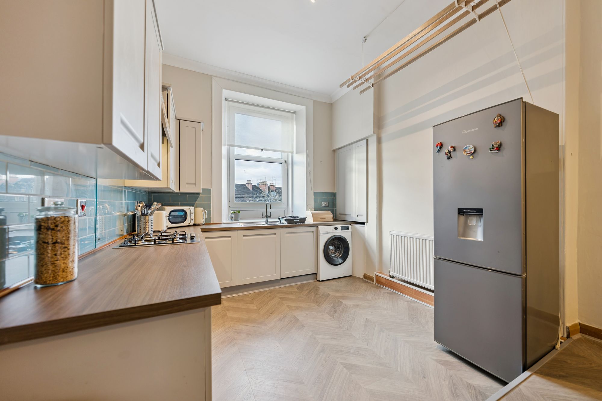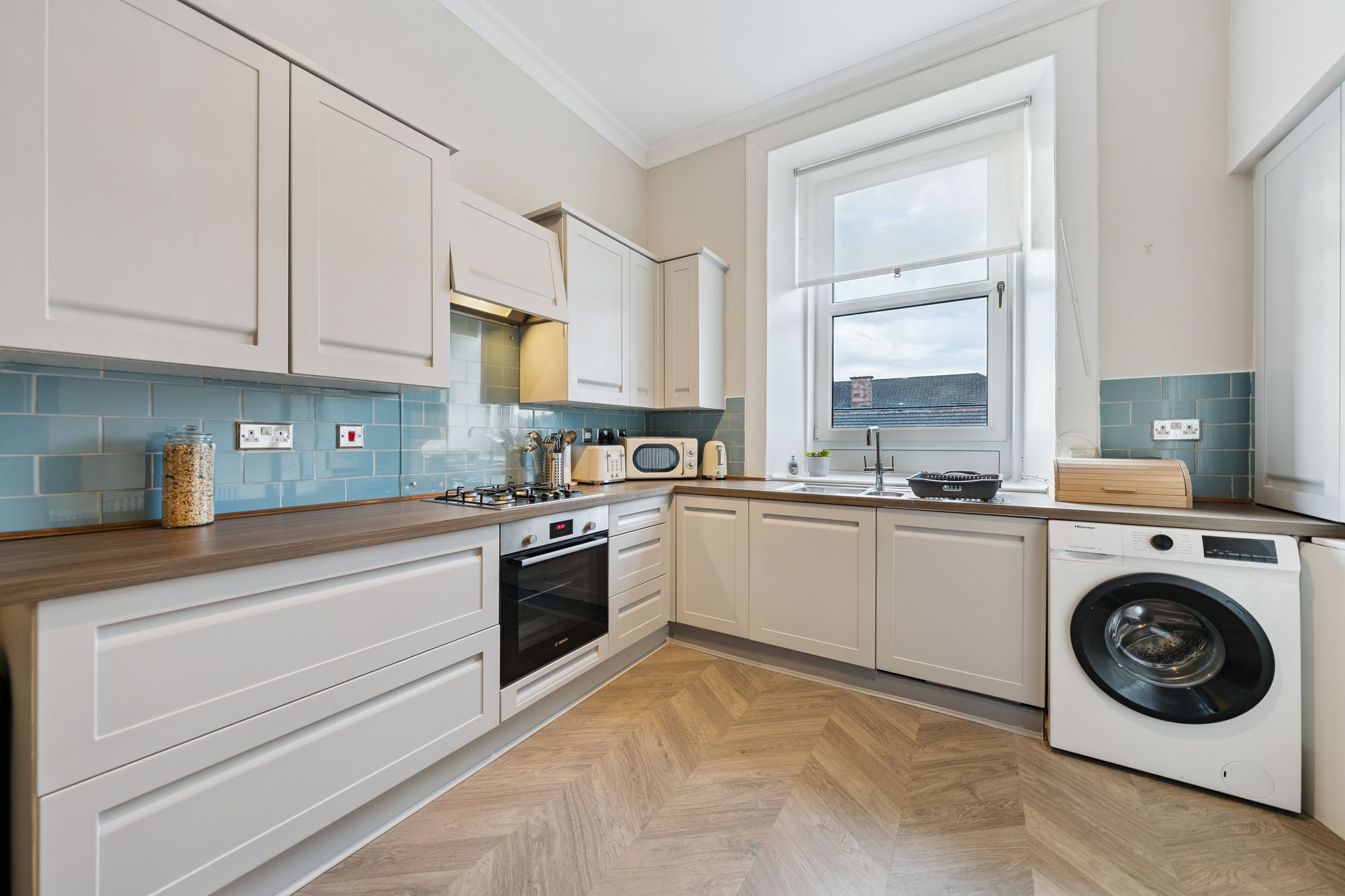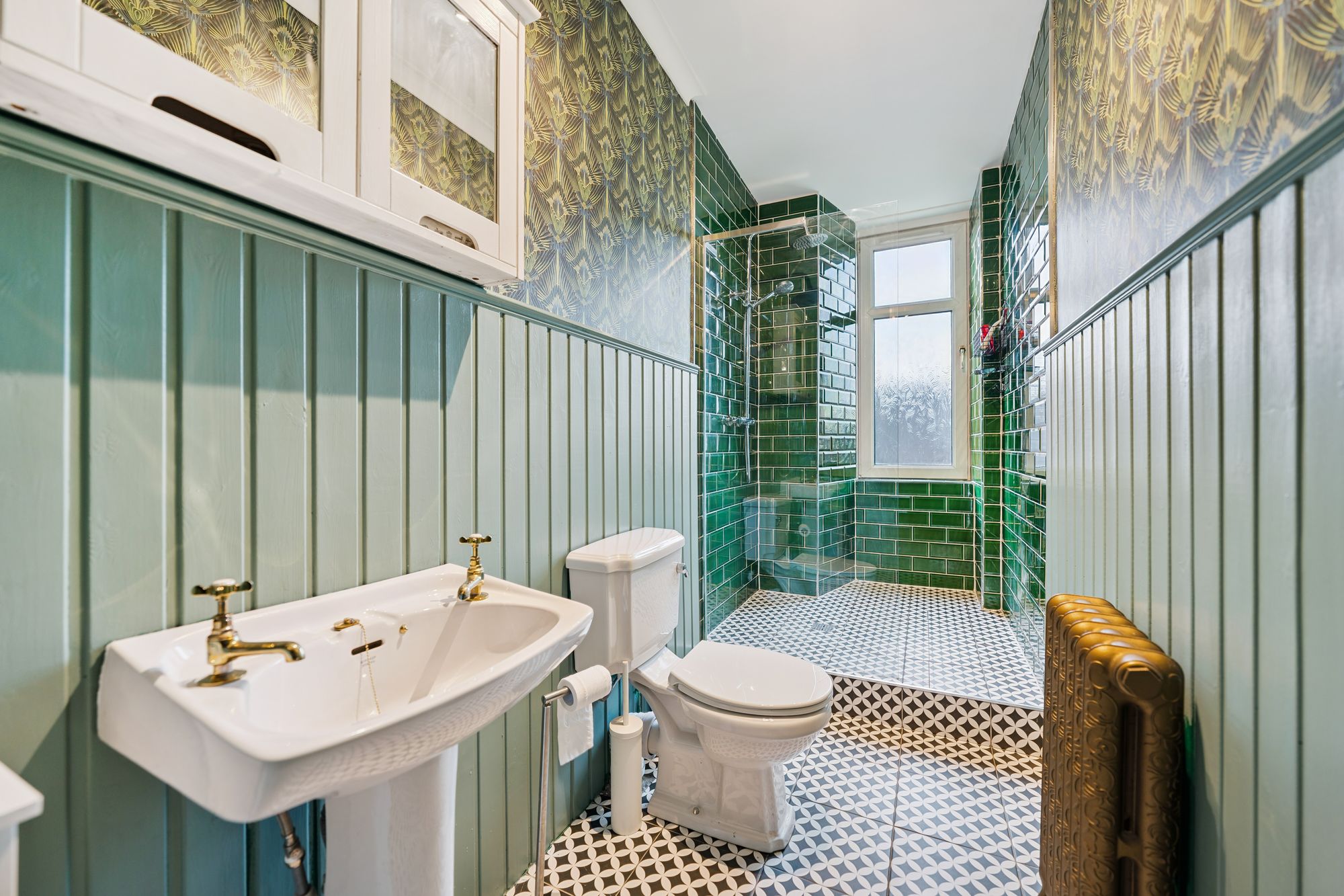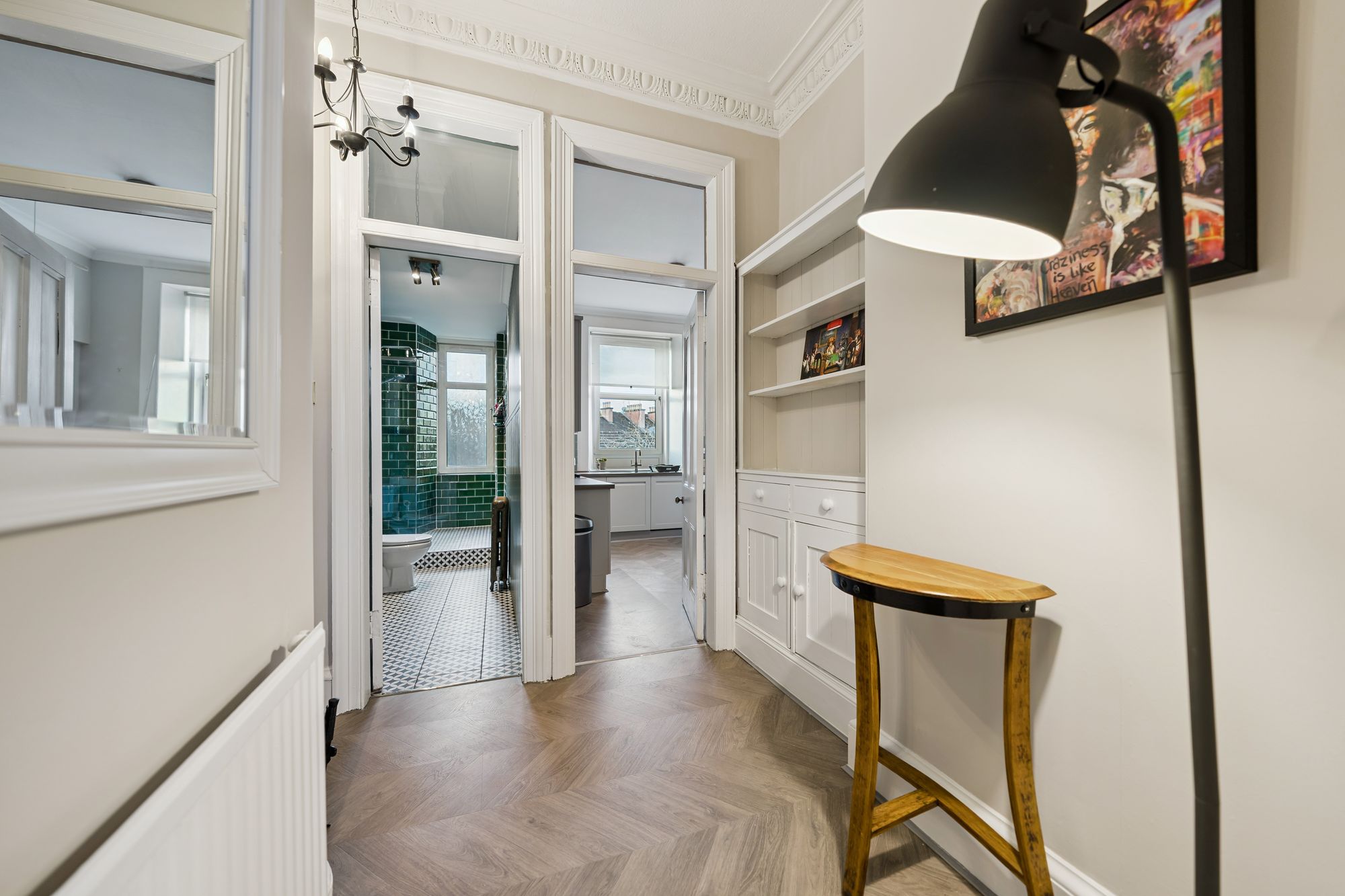 There is a well-proportioned double bedroom with ample space for freestanding furniture. The shower room is a real standout, finished to a high standard with striking green tiling, stylish patterned flooring and a walk-in shower. The space is further enhanced by traditional style fittings and feature panelling, giving it a unique, boutique feel, all complemented by fresh, neutral décor throughout the rest of the flat.