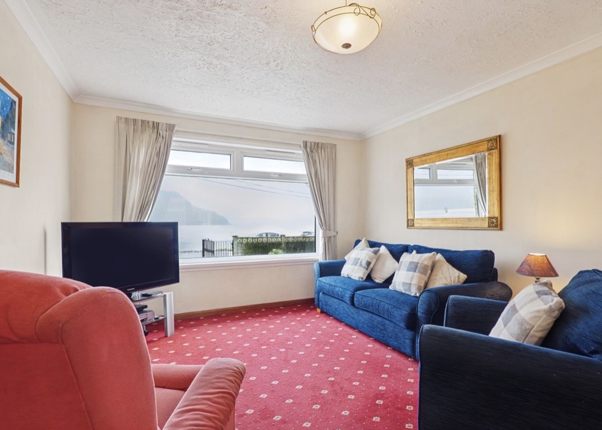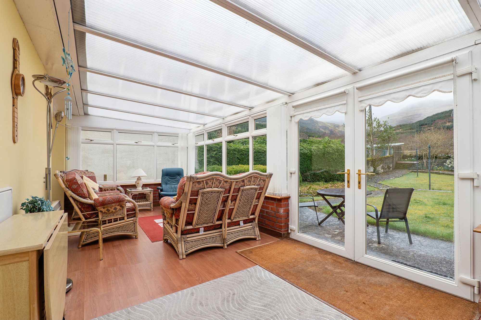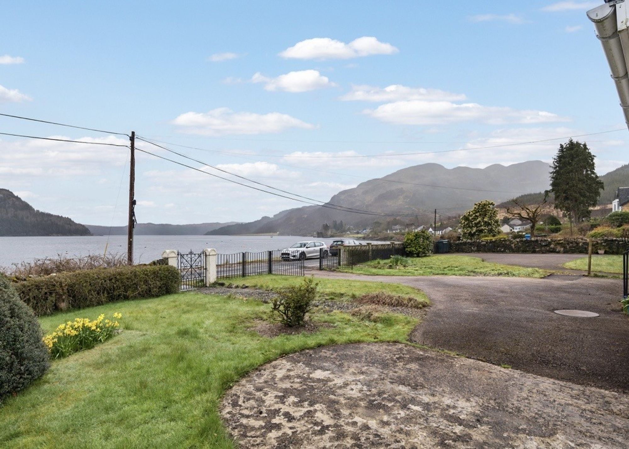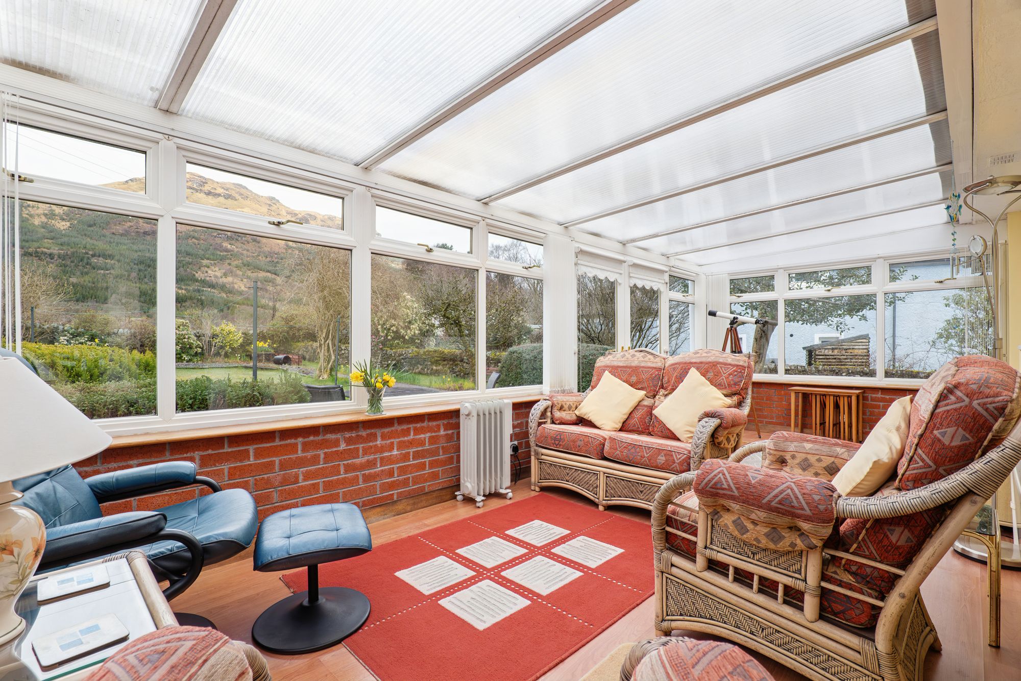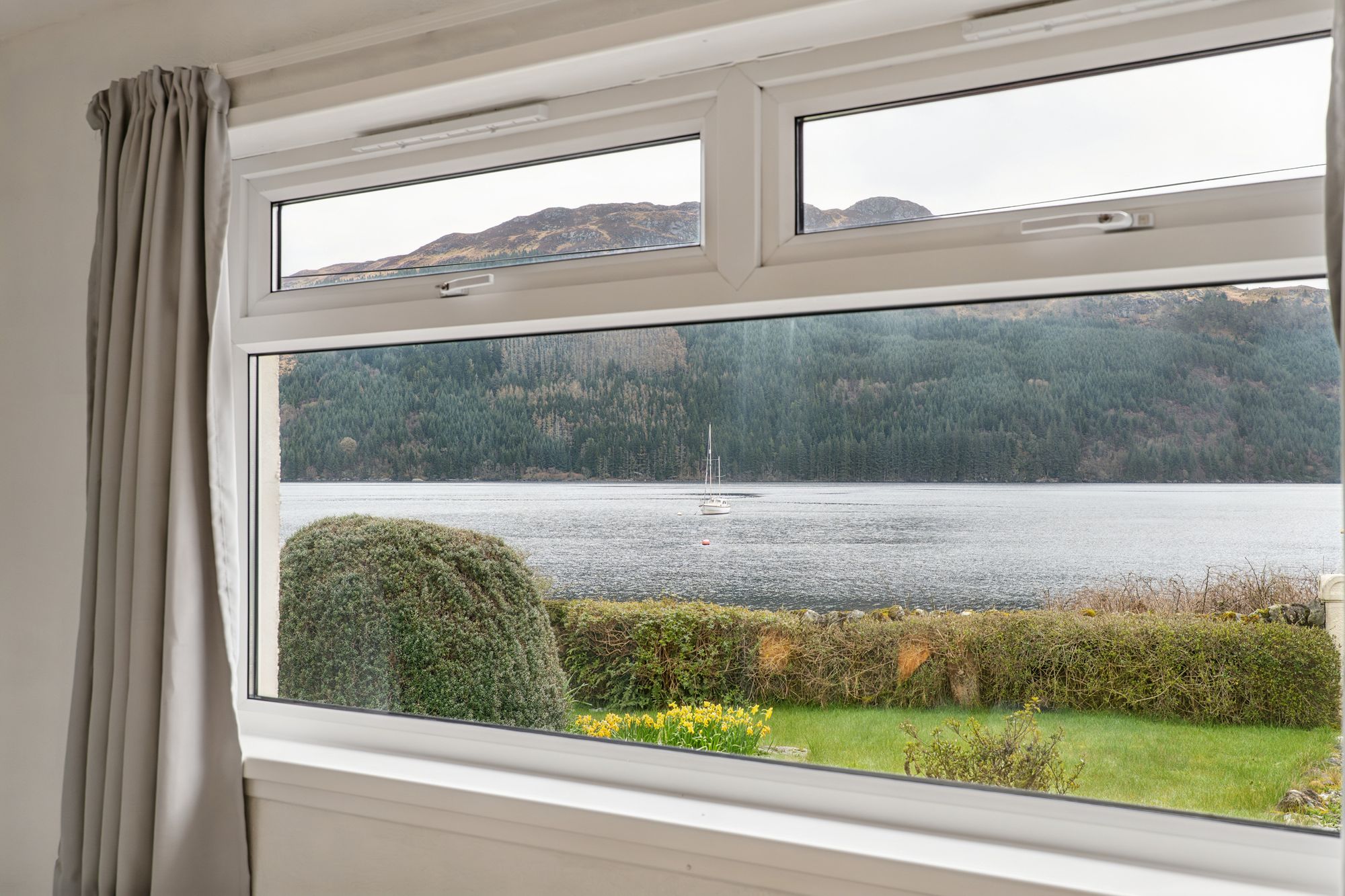 Internally, the accommodation is both well proportioned and thoughtfully arranged. An entrance vestibule leads into an L-shaped hallway, which benefits from useful storage cupboards and access to the loft. The lounge/dining space is of a generous size and provides ample space for both living and dining furniture with stunning views over Loch Goil. From here, access is gained to a large rear facing conservatory, perfectly positioned to take full advantage of the spectacular hillside views over the rear gardens. This bright and welcoming space is ideal for relaxing, entertaining, and occasional quirky sleep-over space or simply for enjoying the scenery throughout the seasons. The kitchen is conveniently located and well laid out to serve the main living accommodation. There are two comfortable double bedrooms, each benefiting from built-in wardrobes. The principal bedroom enjoys the added convenience of a compact, fully tiled en-suite shower room fitted with an electric shower. In addition, there is a family bathroom which is partially tiled and fitted with a white three-piece suite and an electric shower. The property further benefits from double glazing and electric heating, ensuring comfort throughout the year. The attic is insulated and accessed via a metal Ramsay-style loft ladder, offering additional storage space. Externally, there is parking to the front of the property with lawn overlooking the water, while the mature and well-proportioned rear gardens back directly onto open fields and the surrounding hillsides. This provides a wonderful sense of privacy and connection to the natural landscape.