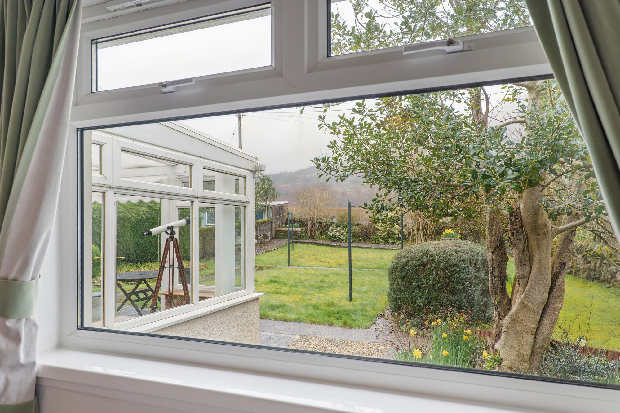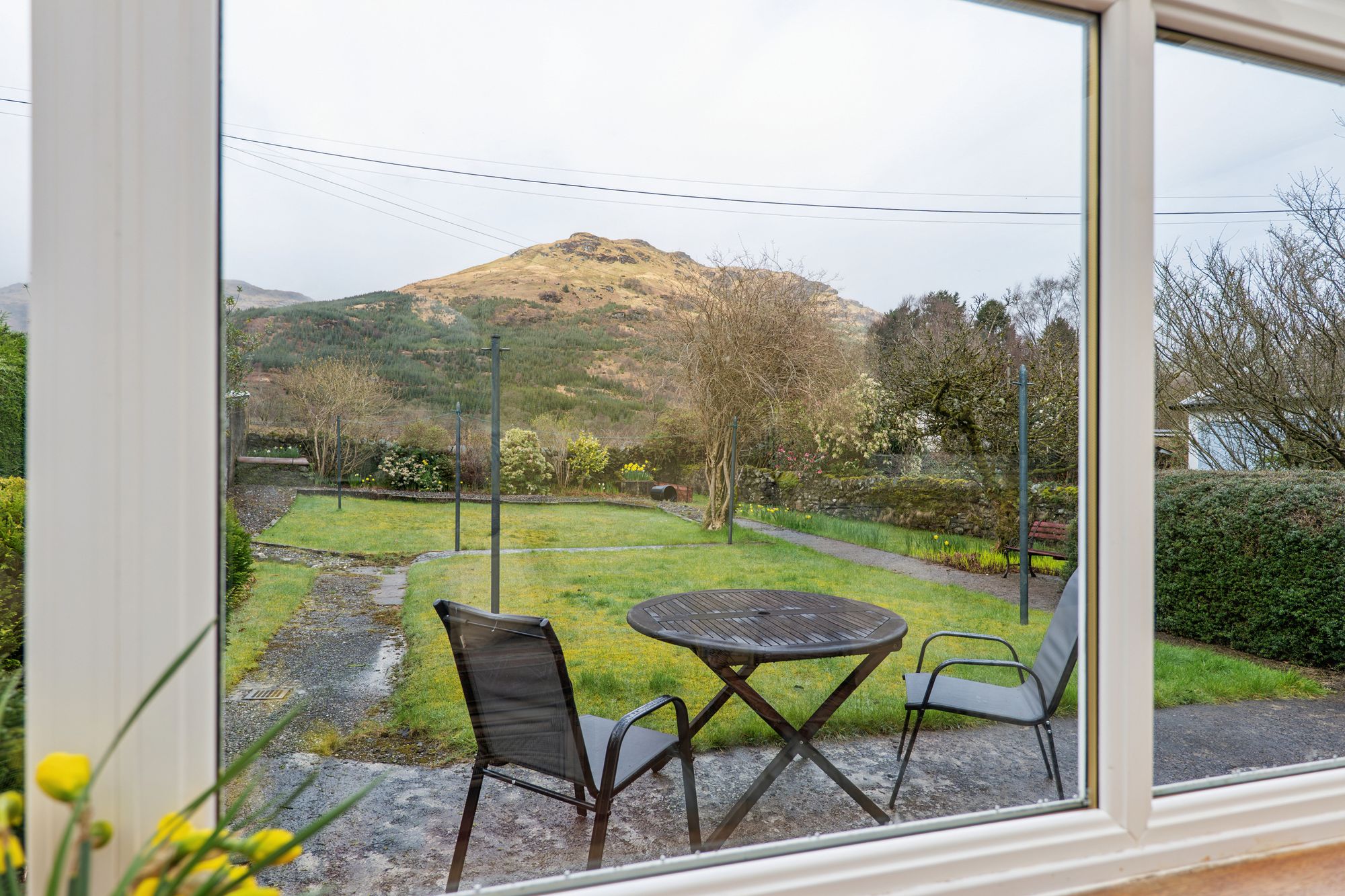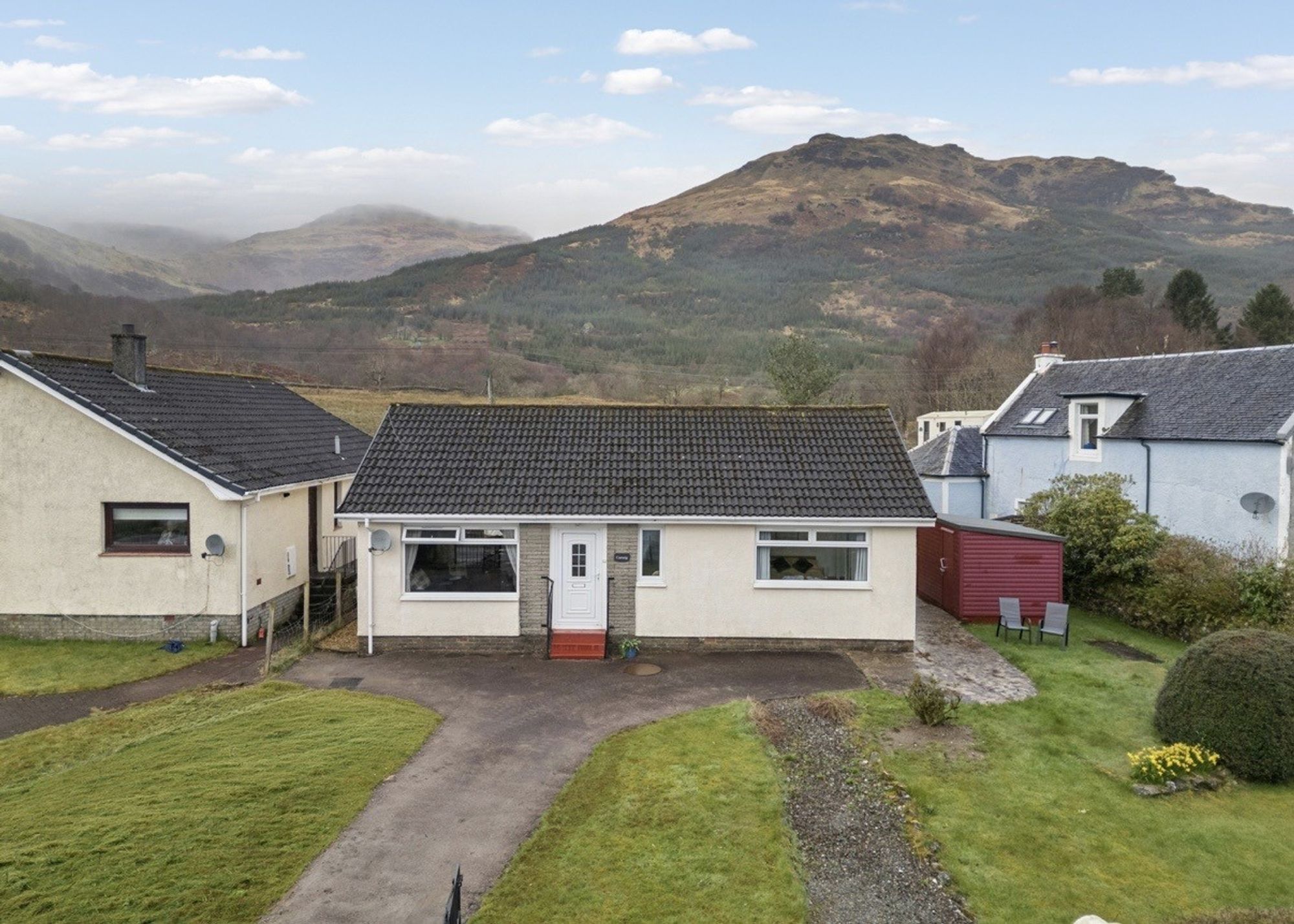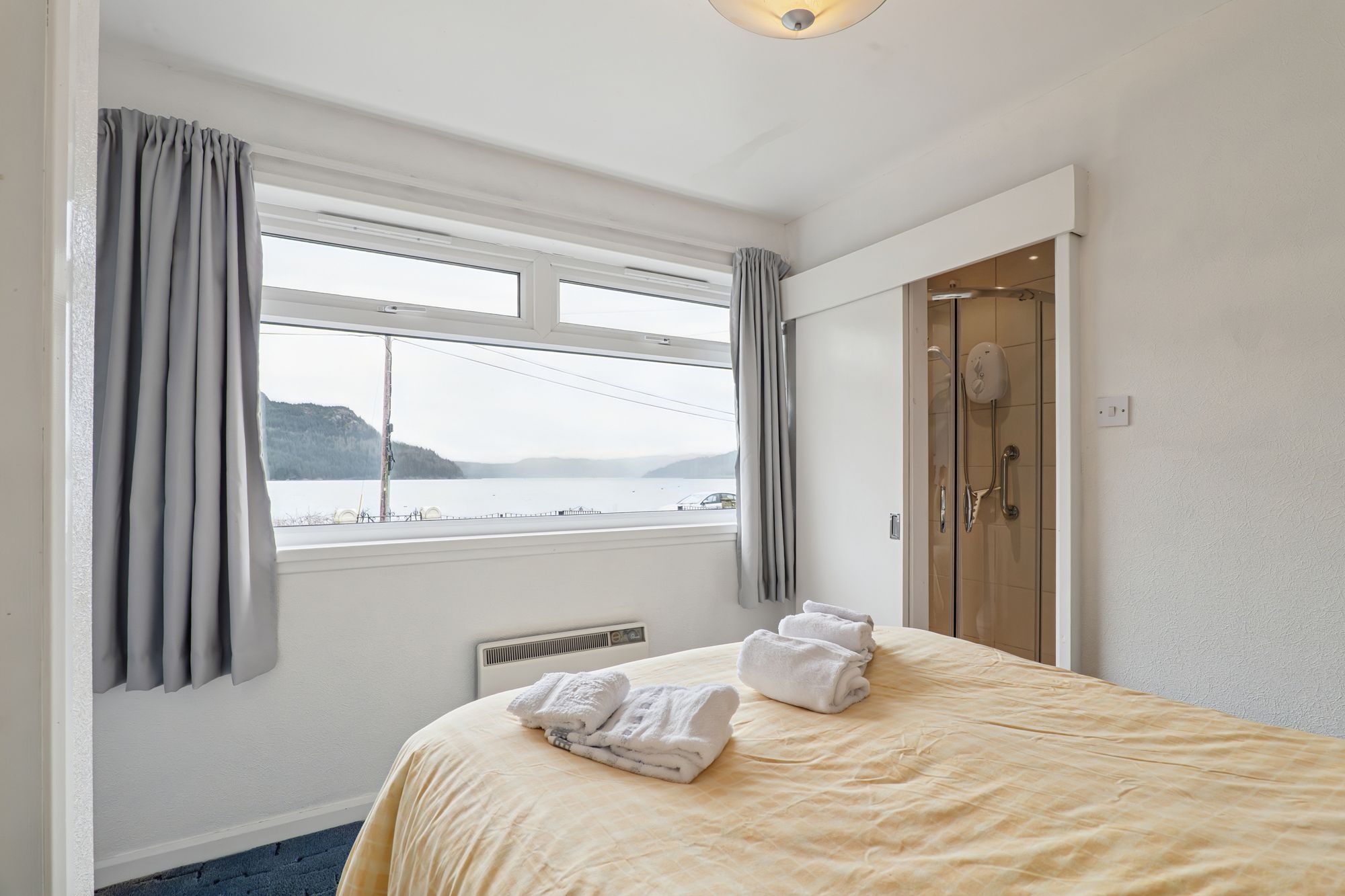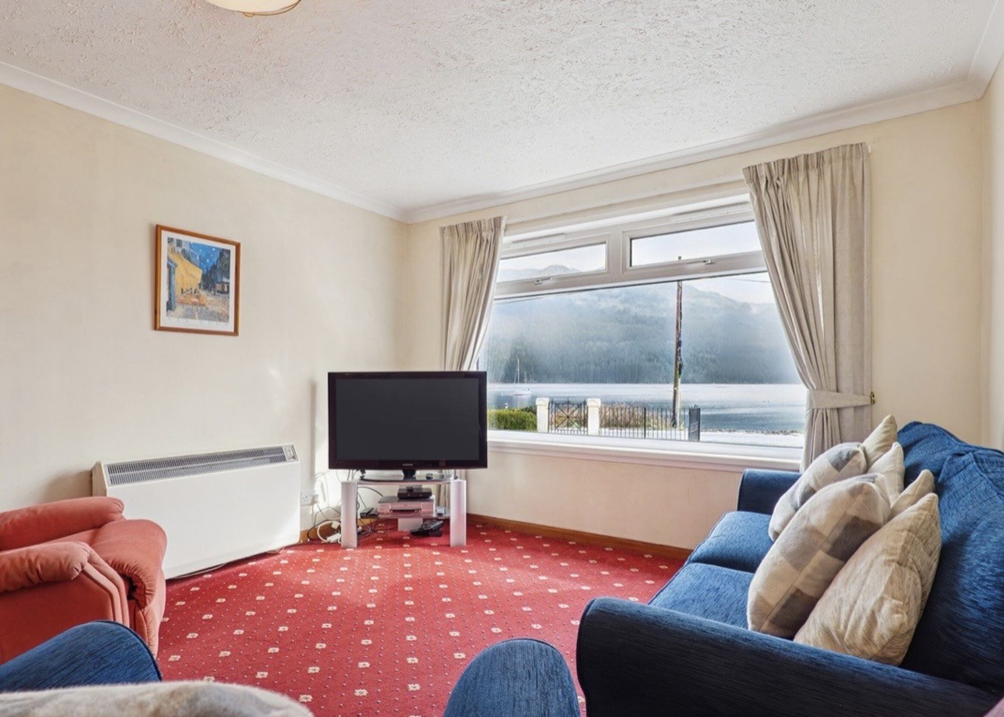 Internally, the accommodation is both well proportioned and thoughtfully arranged. An entrance vestibule leads into an L-shaped hallway, which benefits from useful storage cupboards and access to the loft. The lounge/dining space is of a generous size and provides ample space for both living and dining furniture with stunning views over Loch Goil. From here, access is gained to a large rear facing conservatory, perfectly positioned to take full advantage of the spectacular hillside views over the rear gardens. This bright and welcoming space is ideal for relaxing, entertaining, and occasional quirky sleep-over space or simply for enjoying the scenery throughout the seasons. The kitchen is conveniently located and well laid out to serve the main living accommodation. There are two comfortable double bedrooms, each benefiting from built-in wardrobes. The principal bedroom enjoys the added convenience of a compact, fully tiled en-suite shower room fitted with an electric shower. In addition, there is a family bathroom which is partially tiled and fitted with a white three-piece suite and an electric shower. The property further benefits from double glazing and electric heating, ensuring comfort throughout the year. The attic is insulated and accessed via a metal Ramsay-style loft ladder, offering additional storage space. Externally, there is parking to the front of the property with lawn overlooking the water, while the mature and well-proportioned rear gardens back directly onto open fields and the surrounding hillsides. This provides a wonderful sense of privacy and connection to the natural landscape.