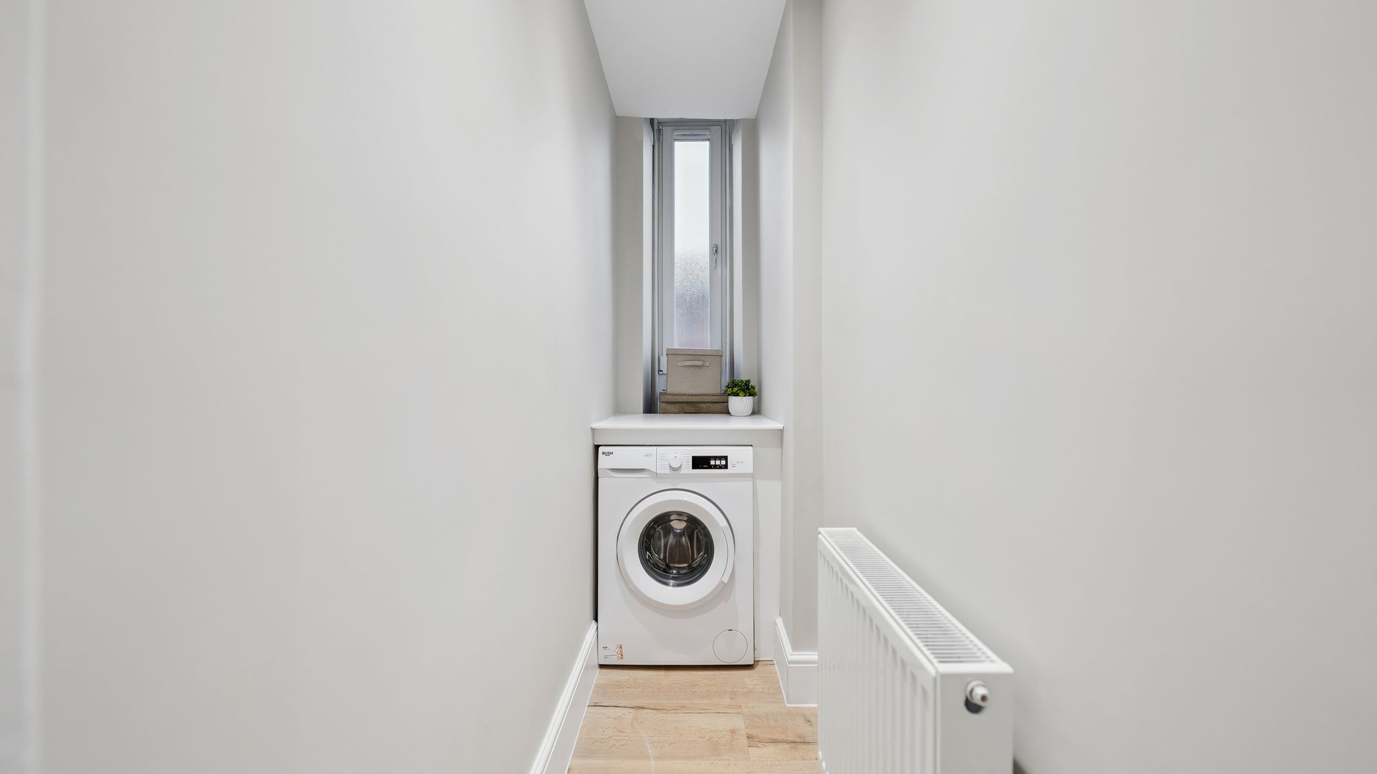 A dedicated utility area provides convenient laundry facilities and additional storage options. The generous double bedroom features built-in wardrobe space, while the stylish bathroom complete with a modern walk-in shower.