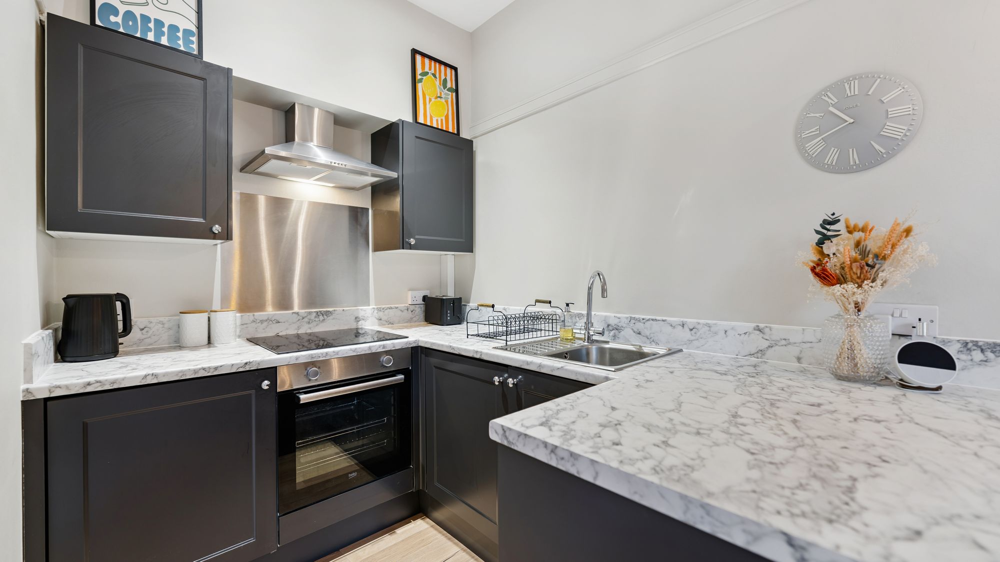 The accommodation comprises a welcoming reception hallway with a useful storage cupboard, leading into a bright and spacious living area that flows effortlessly into the contemporary open-plan kitchen. The kitchen is fitted with an excellent range of wall and floor mounted units, sleek worktops, and high-quality integrated appliances, creating an ideal space for both everyday living and entertaining.