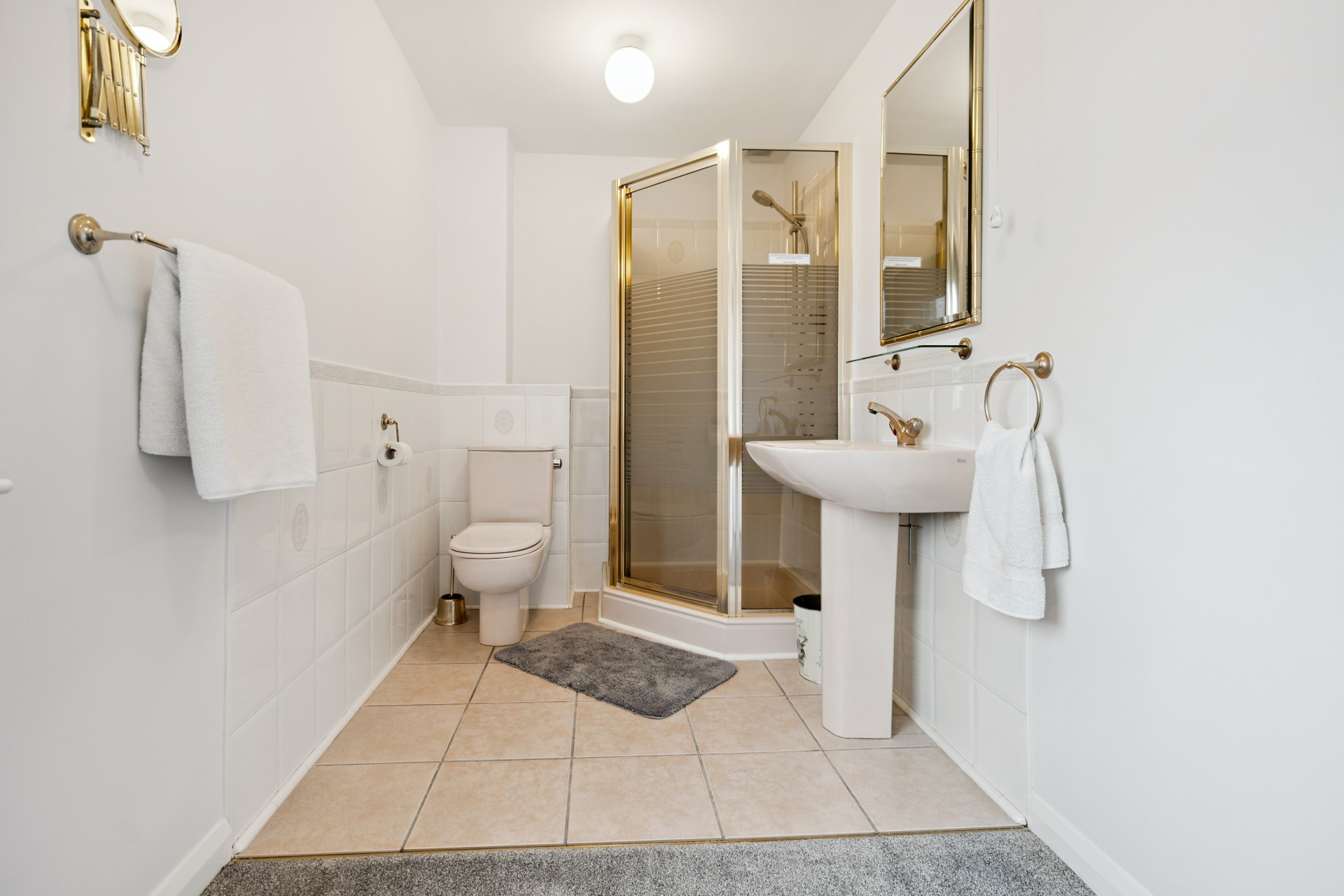 The property features three generous double bedrooms, including a principal bedroom with en-suite shower room, while the main family bathroom is well appointed with both bath and separate shower. The kitchen is well equipped with a dishwasher and fridge-freezer, and is complemented by a practical utility room housing a washing machine, providing excellent additional storage and functionality.