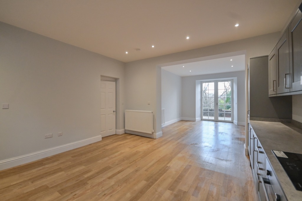The lower level features a bright and spacious open-plan living area, combining a large contemporary kitchen and living room—perfect for both relaxing and entertaining. A separate utility room adds practicality, while doors open directly to a private garden, creating a wonderful indoor-outdoor flow.