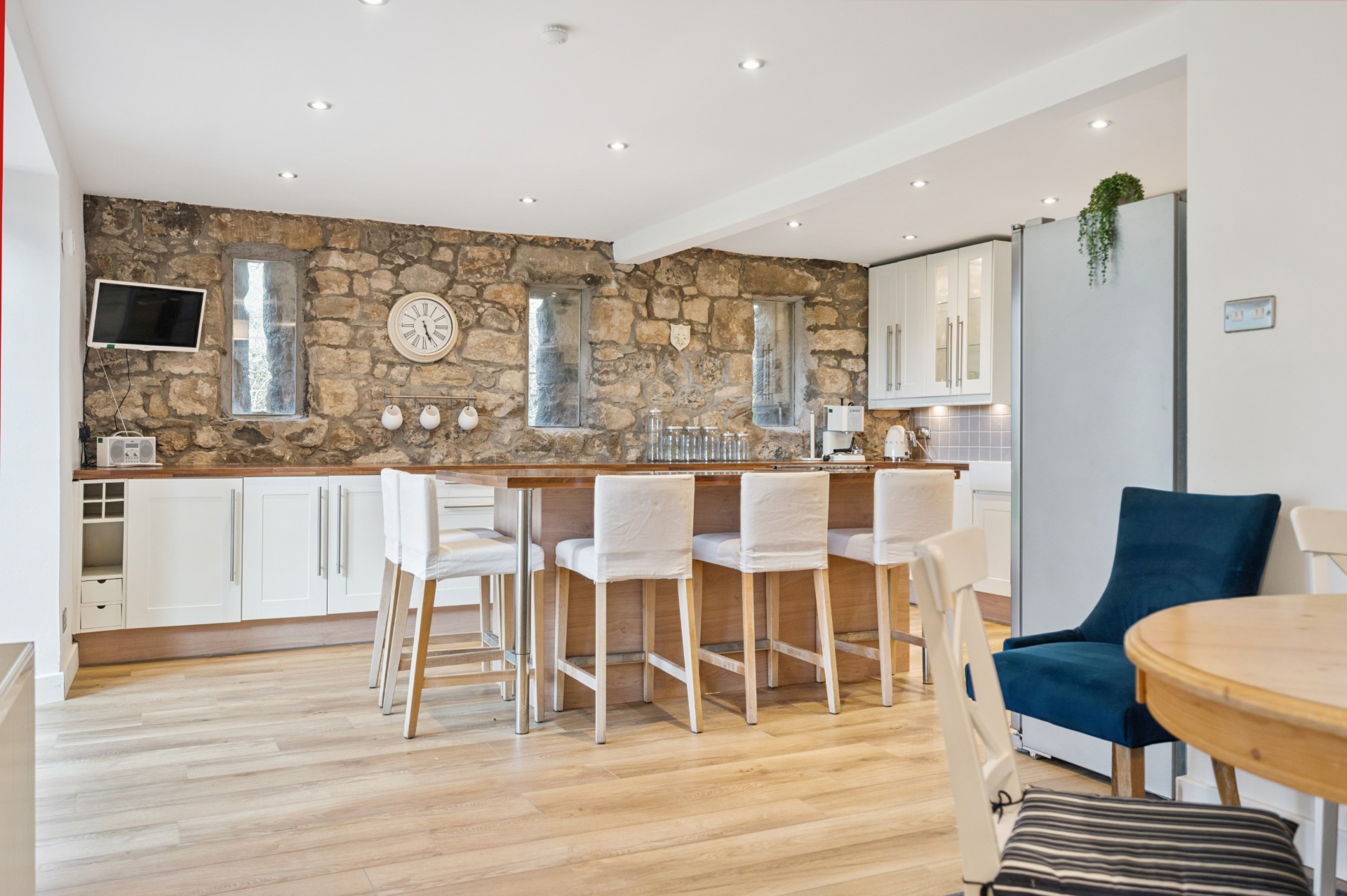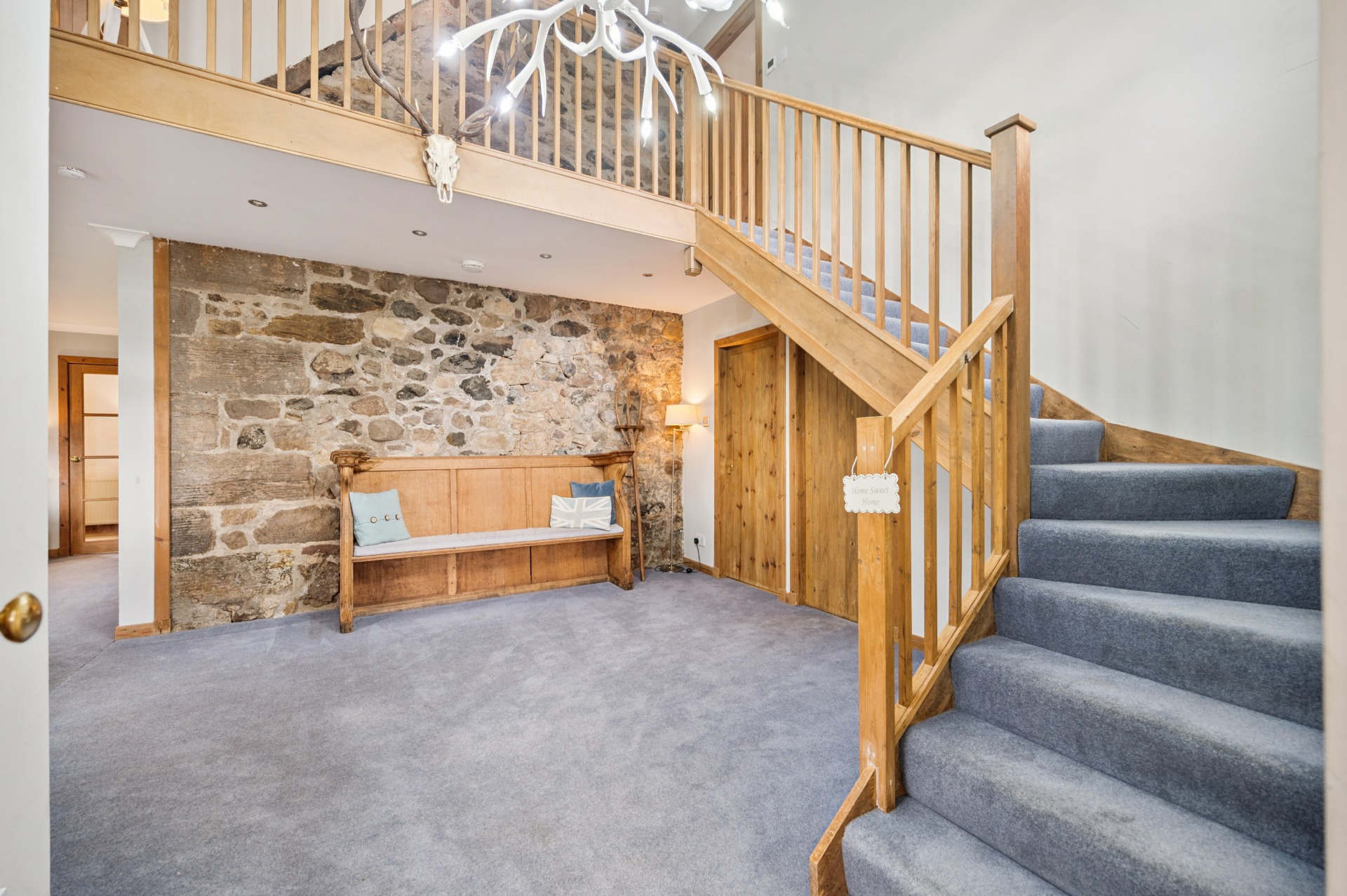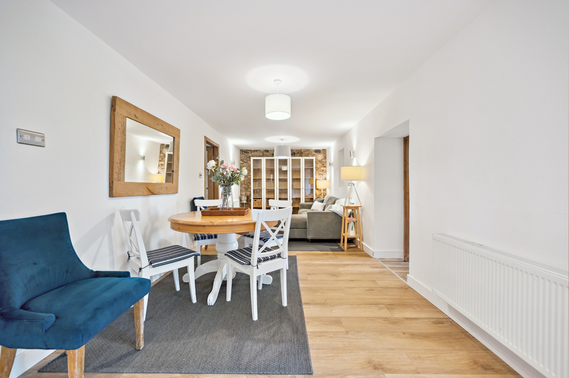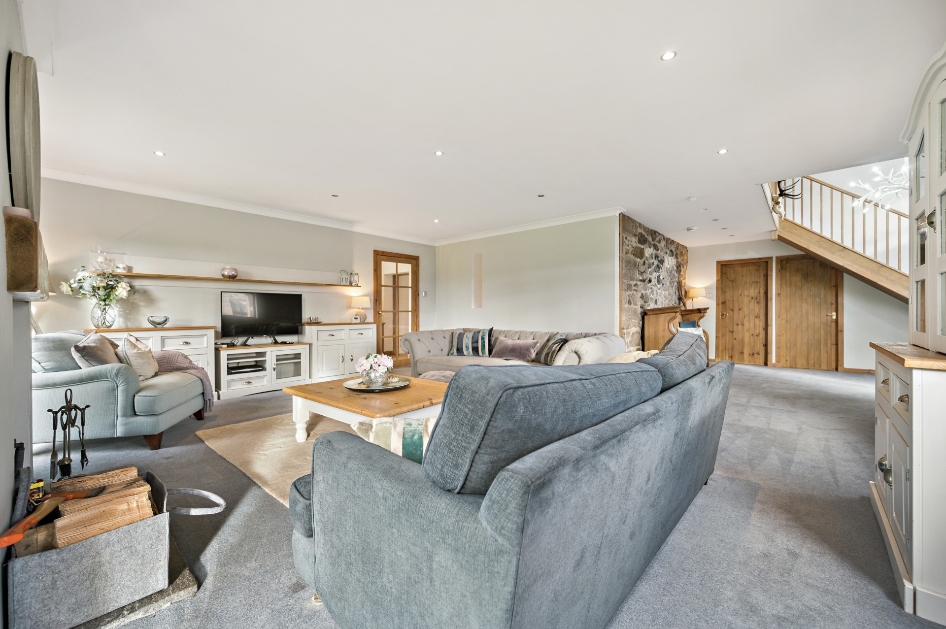 Internally, the accommodation begins on the ground floor with a welcoming entrance porch leading into a large and inviting living room, with a utility room and bathroom located just off. This flows through to a generous reception area, perfectly suited for dining and informal lounging. The substantial kitchen boasts a modern finish while thoughtfully retaining the property’s original barn-style character. A further W.C. completes the ground floor.